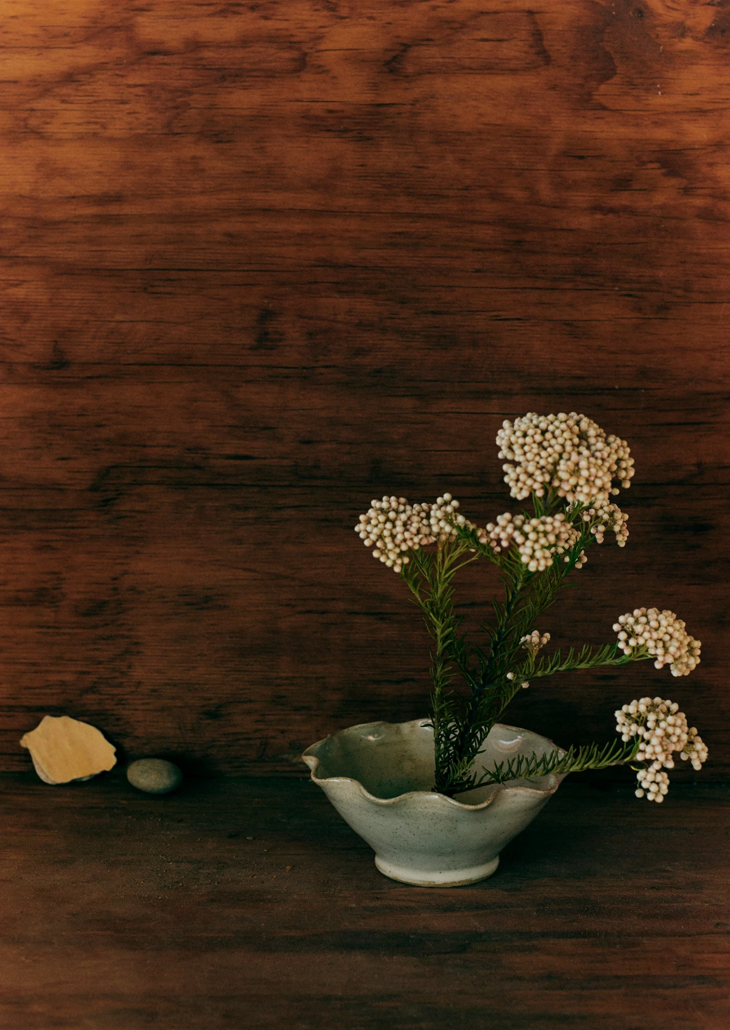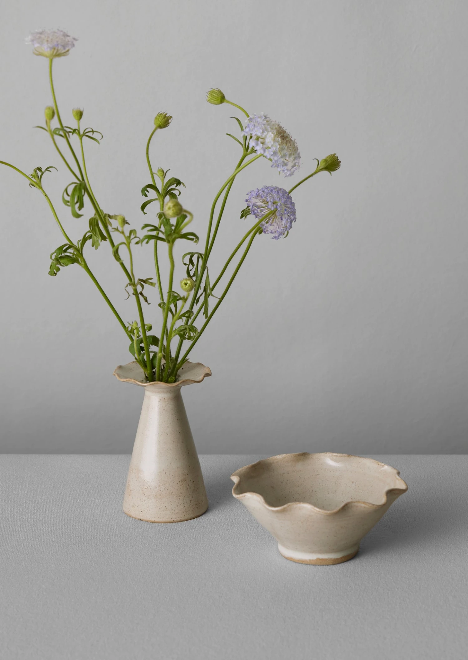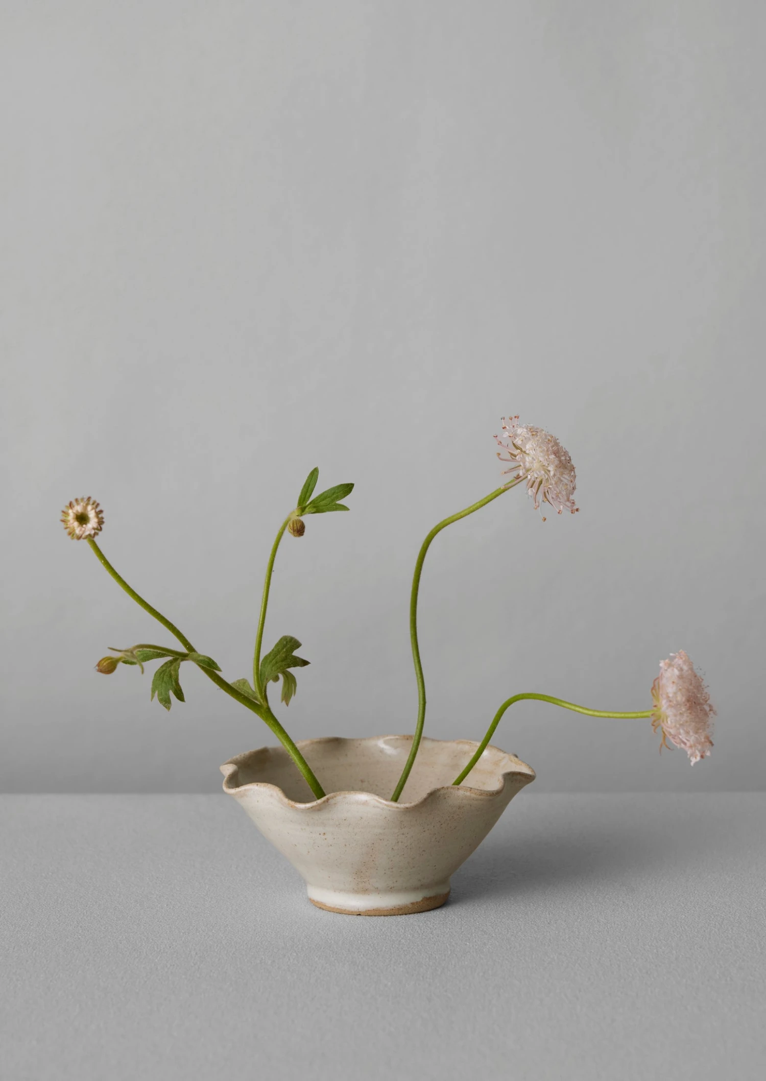 Scallop-edged flower frog hand-thrown by Alice Passingham. Based by the coast in Hampshire, Alice works from her garden studio. After leaving a career in fashion in London, she began making pots a few years ago under the mentorship of a local potter. Crafted from stoneware clay and finished with a speckled, subtle grey-white glaze. With a domed perforated centre for flower stems to sit in water. Each varies slightly in shape and colour.
