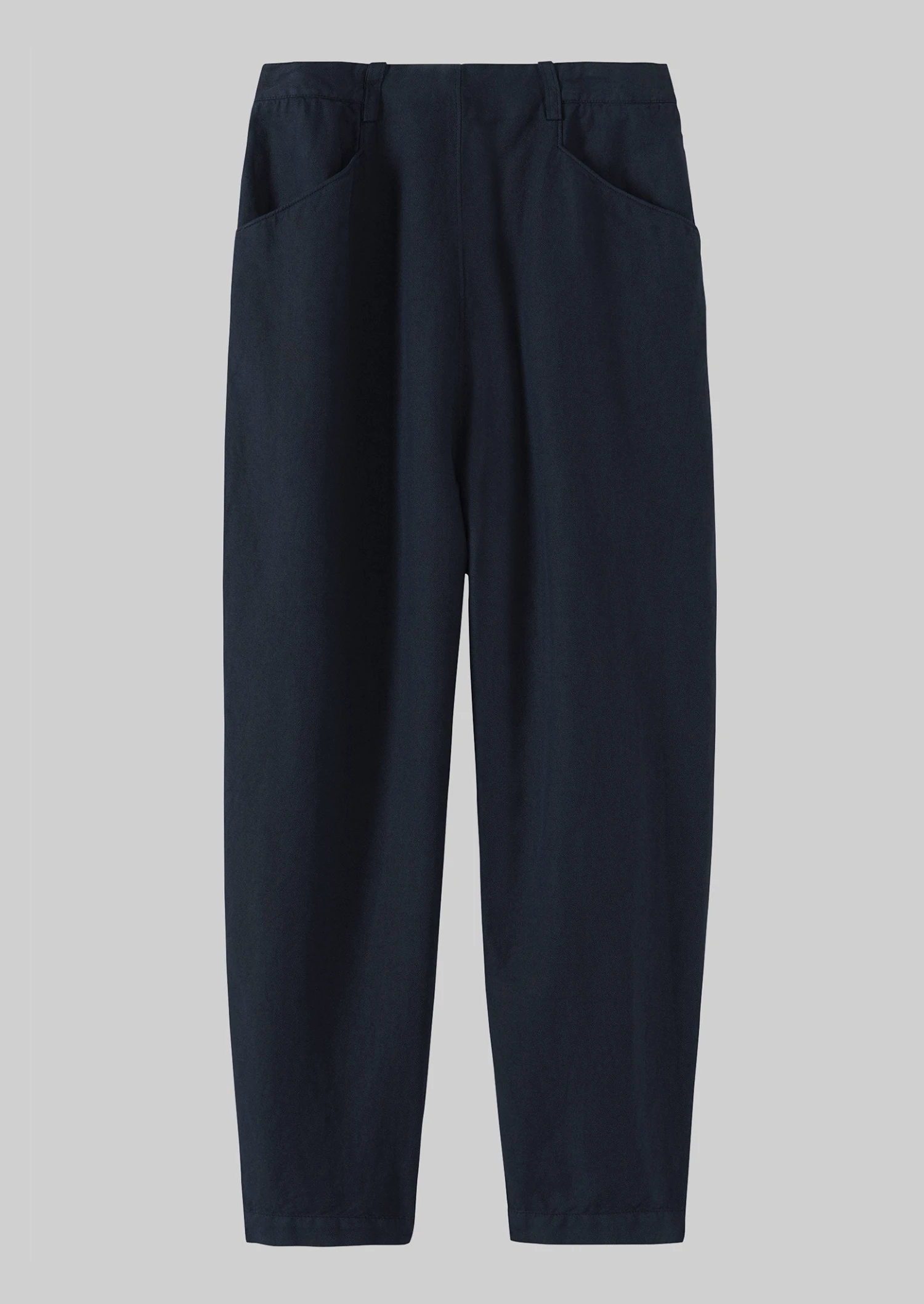 Italian organic cotton and linen blend. Garment-dyed. Back elasticated waist. Side pockets. Dropped seat. Cropped legs.