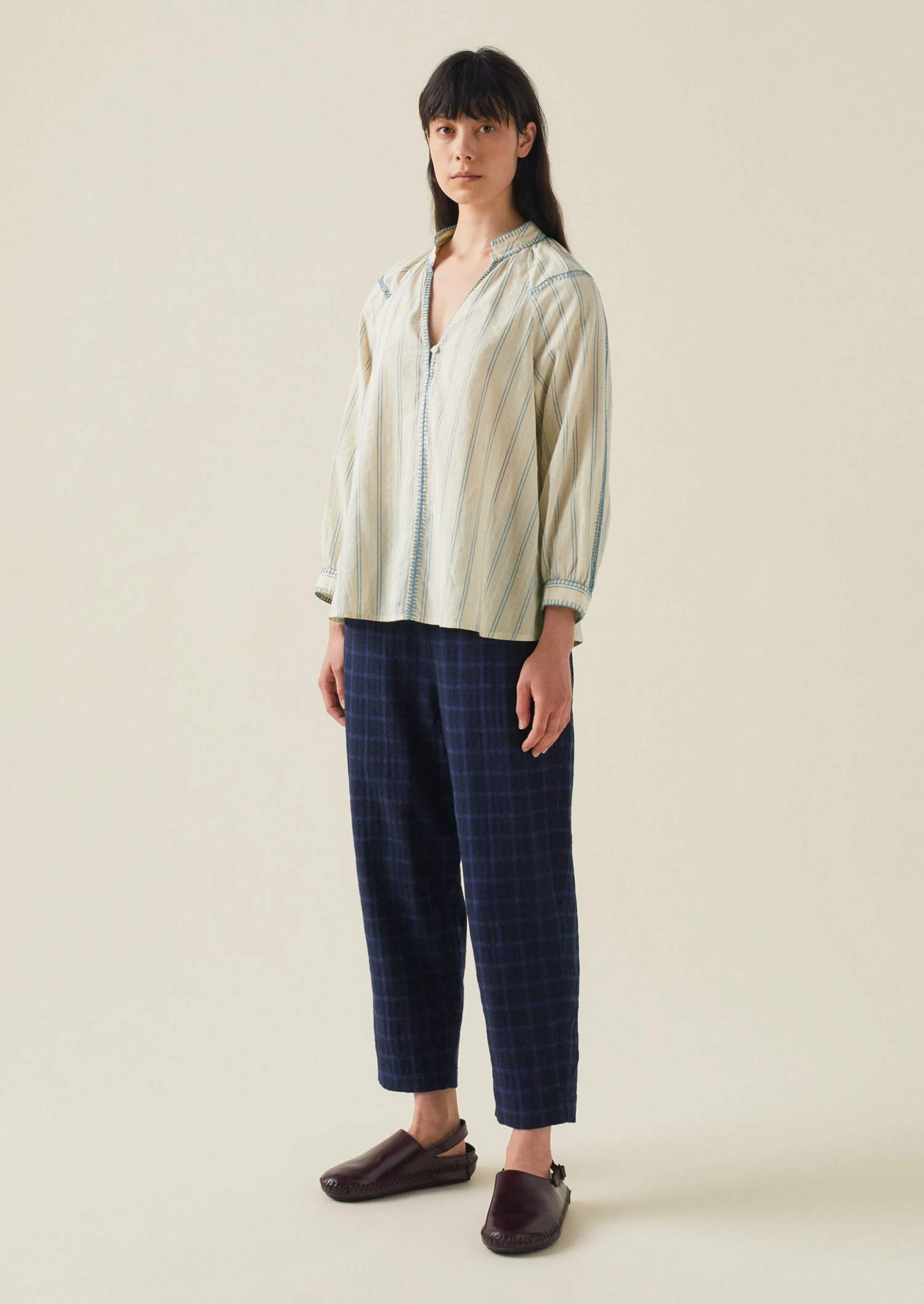 Our Alix trousers are made from a cotton and wool blend with a raised seersucker texture. Crafted with an elasticated section at the back of the waist for day-long comfort, falling to cropped legs.