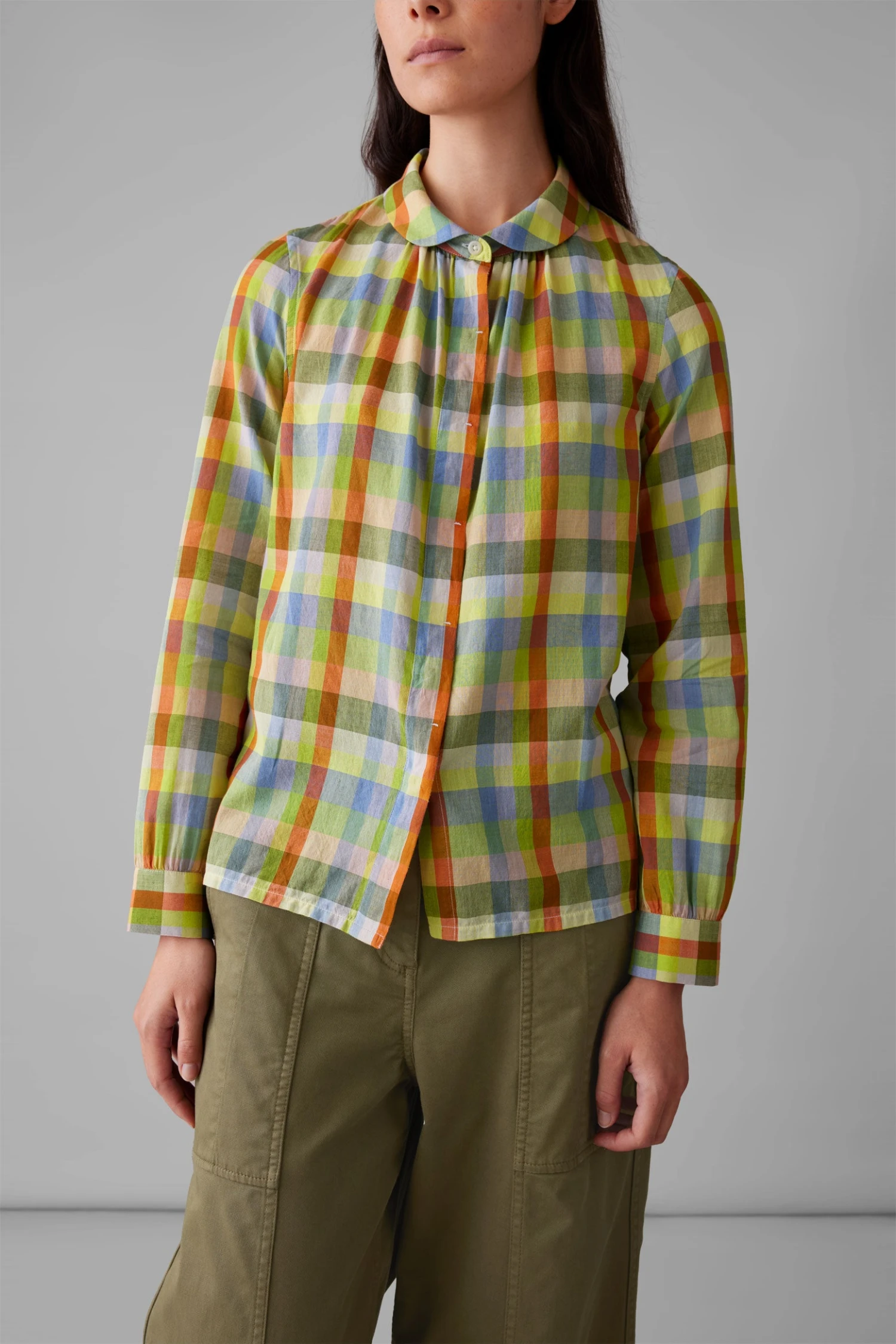 Our shirt is crafted from cotton mulmul which is handwoven by artisans in the Chhindwara district of Madhya Pradesh, supported by the Kala Swaraj Foundation. Cut with a small collar and finished with the fabric selvedge at the edge of the placket.