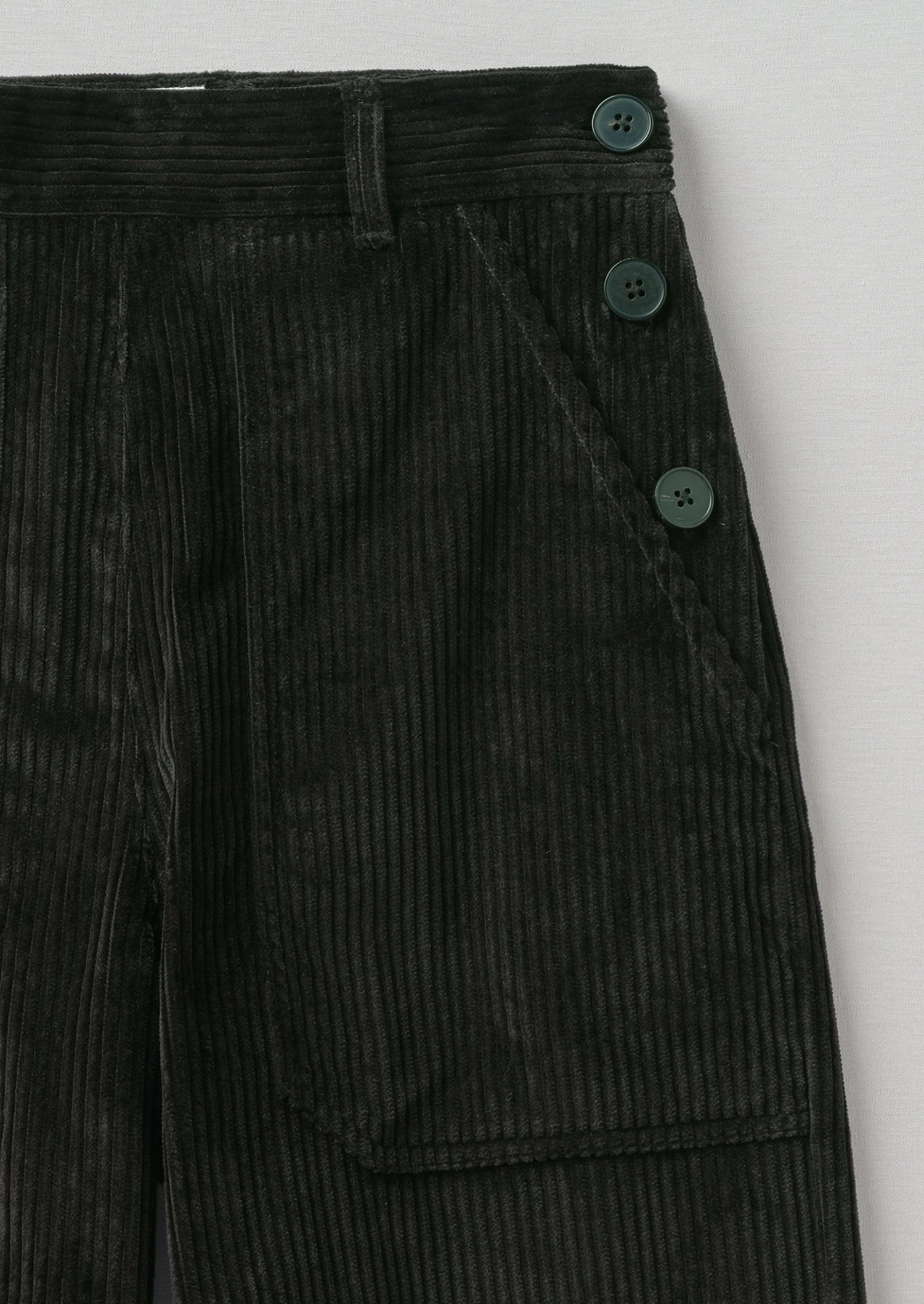 Our Annie trousers are crafted from organic cotton corduroy which is soft and comfortable to wear. Sitting neatly on the waist with a flat front, falling to long-cropped legs, then finished with a back buttoned jet pocket.