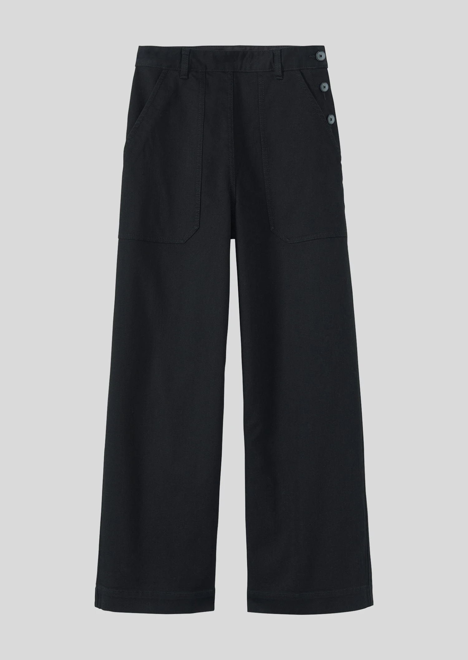 Organic cotton denim with a touch of stretch. Topstitched carpenter pockets. Buttoned jet back pocket. Long-cropped legs. Side horn buttons.