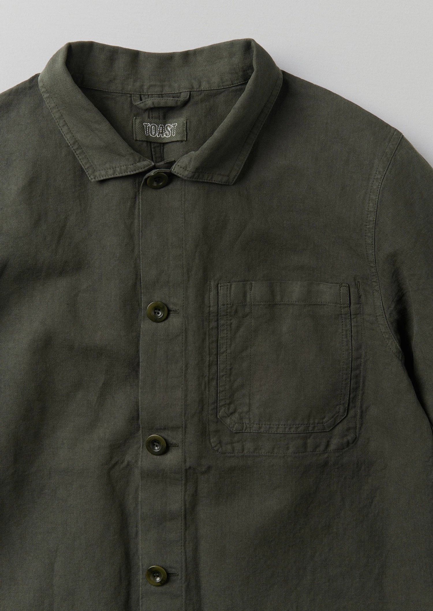 Mid-weight herringbone. Cotton and linen blend. Cutaway collar. Patch pockets. Inner hanging loop. Corozo buttons.