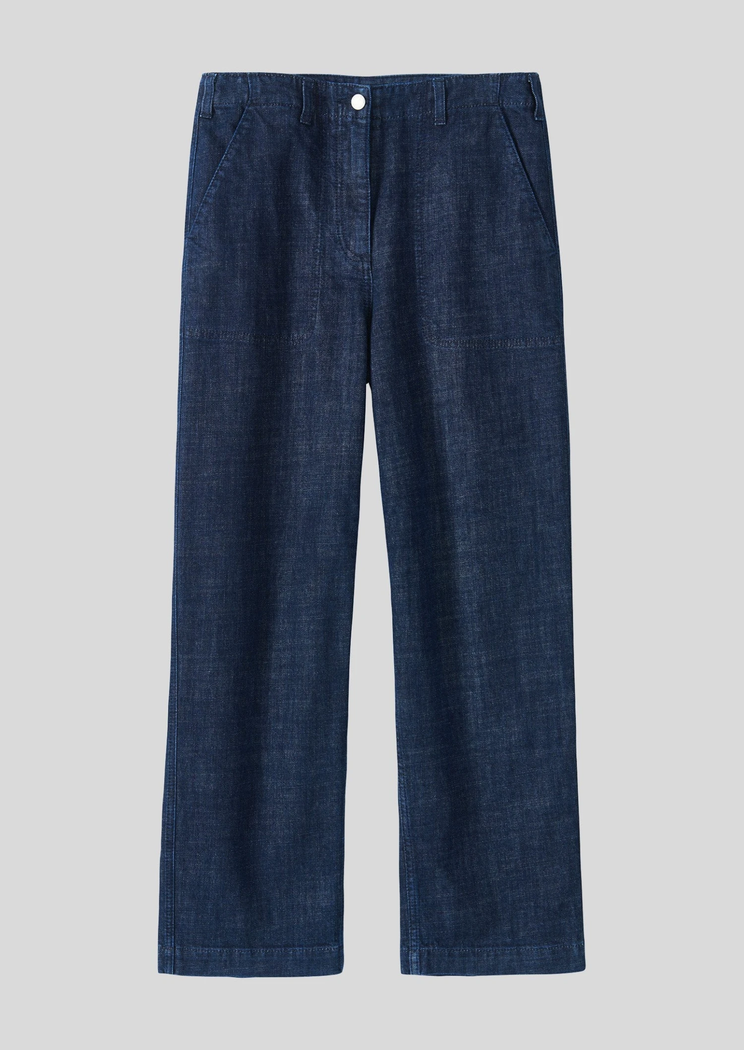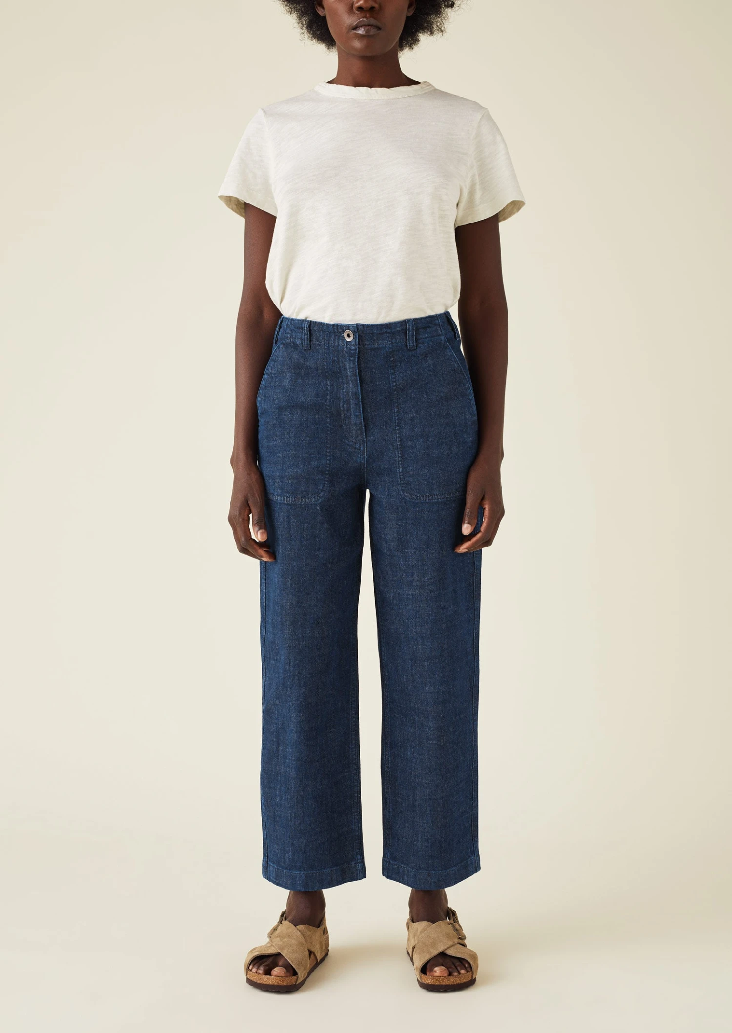 Organic cotton denim with a touch of stretch. Back patch pockets. Easy straight legs. Long crop. Zip and metal button.