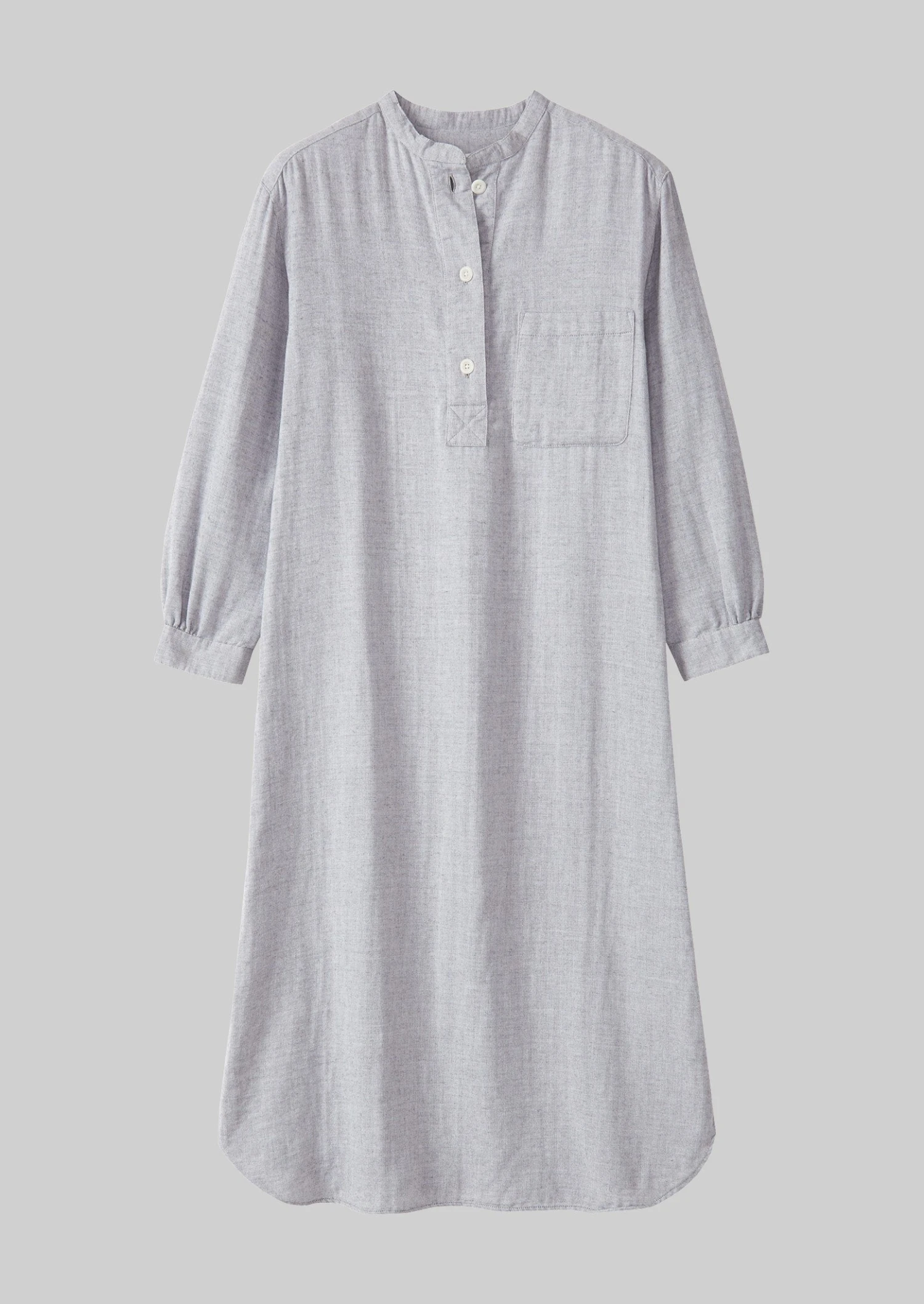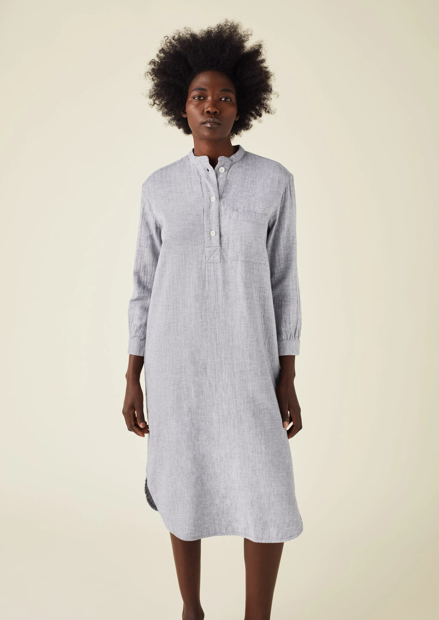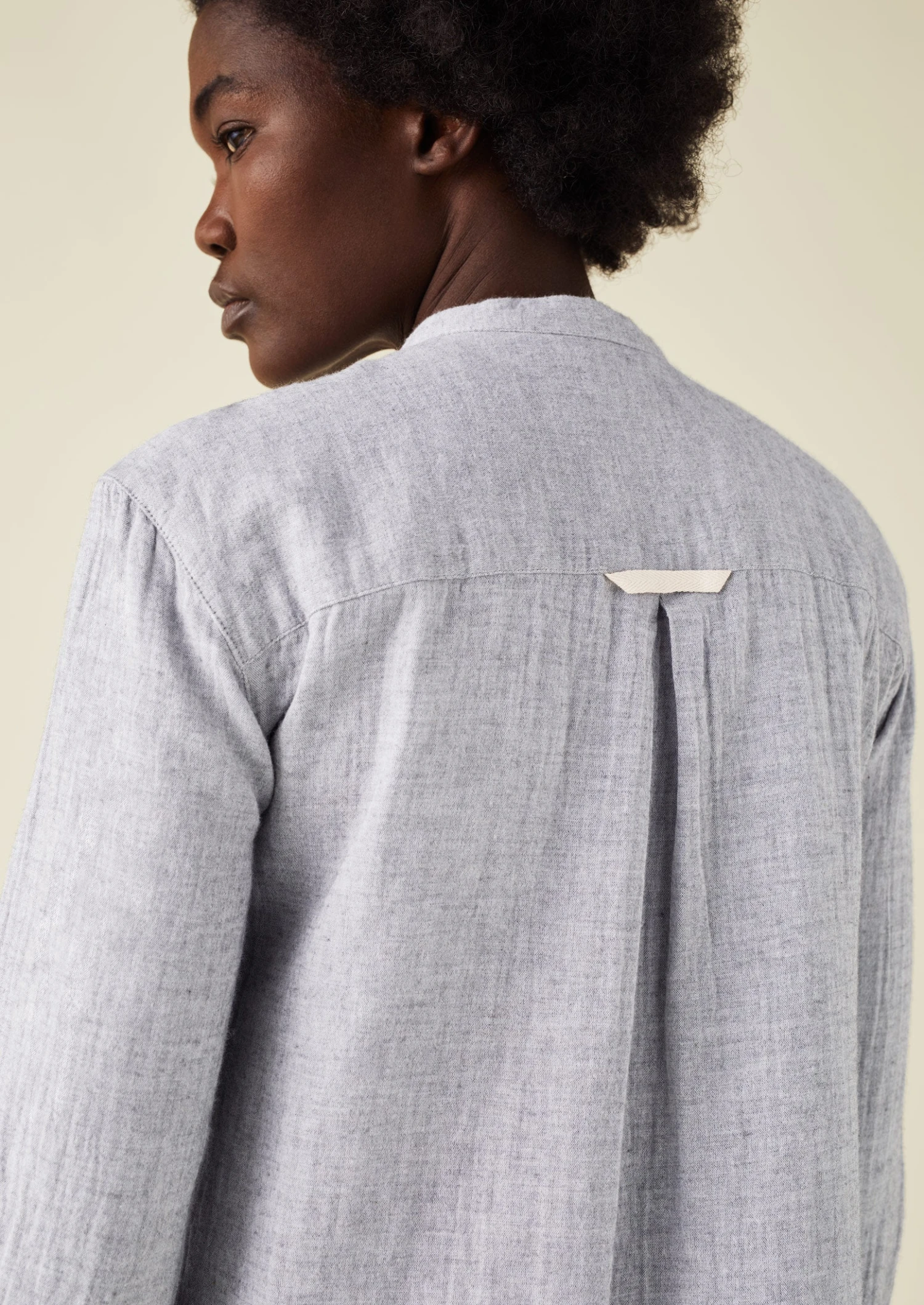 Very soft, double-faced, slightly crumpled cotton. Pull on. Three-button placket. Buttoned cuff. Box pleat into back yoke. Breast patch pocket. Curved, split hem.