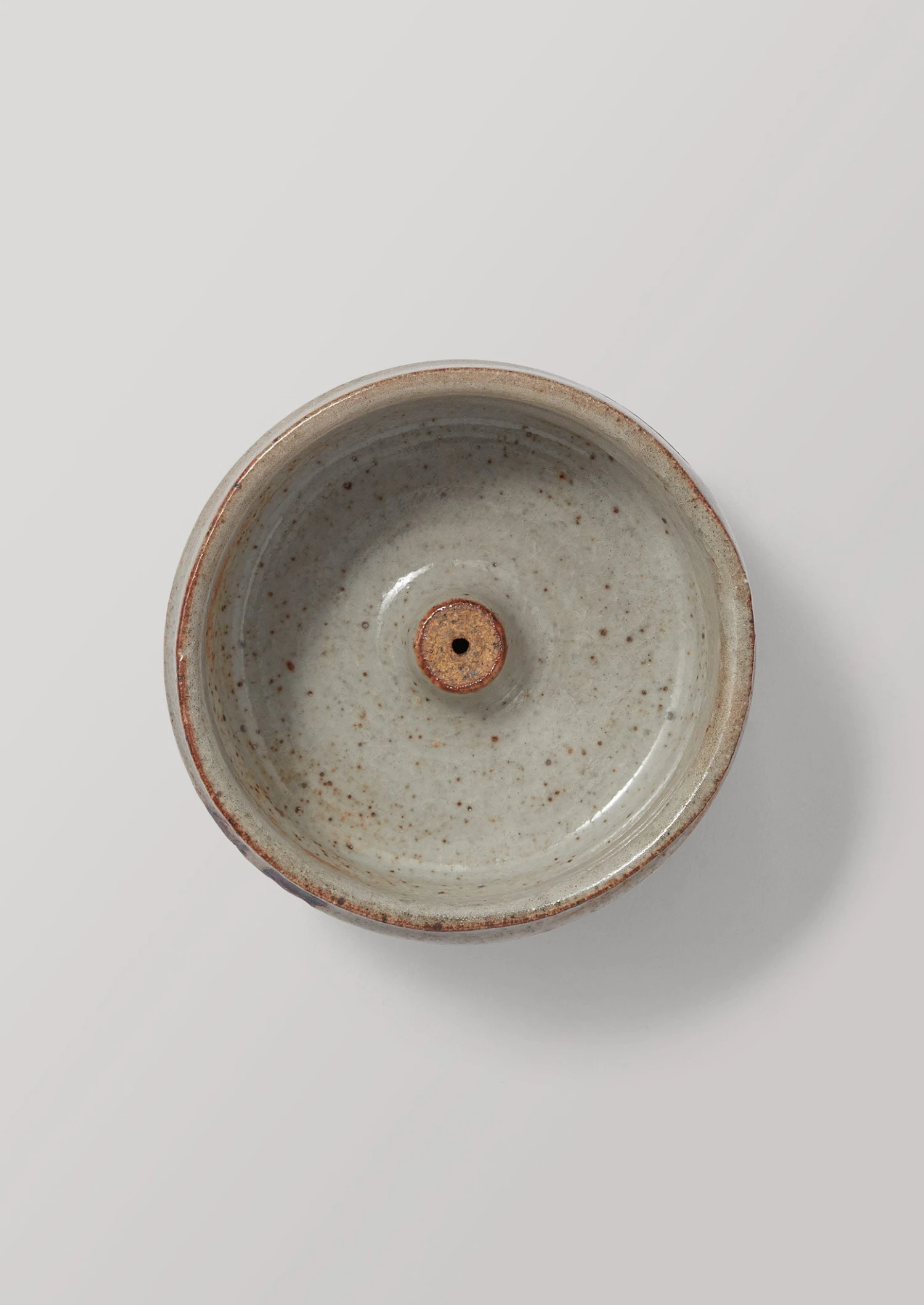Incense holder hand-thrown exclusively for TOAST by Bert Jones, a potter based just outside Newport, Wales. He works from a converted shipping container studio in the countryside. Hand-thrown from stoneware clay to a rounded shape with a small hole in the centre to hold an incense stick. With a shino glaze and iron oxide brush marks. Each varies slightly in shape and glaze tone.