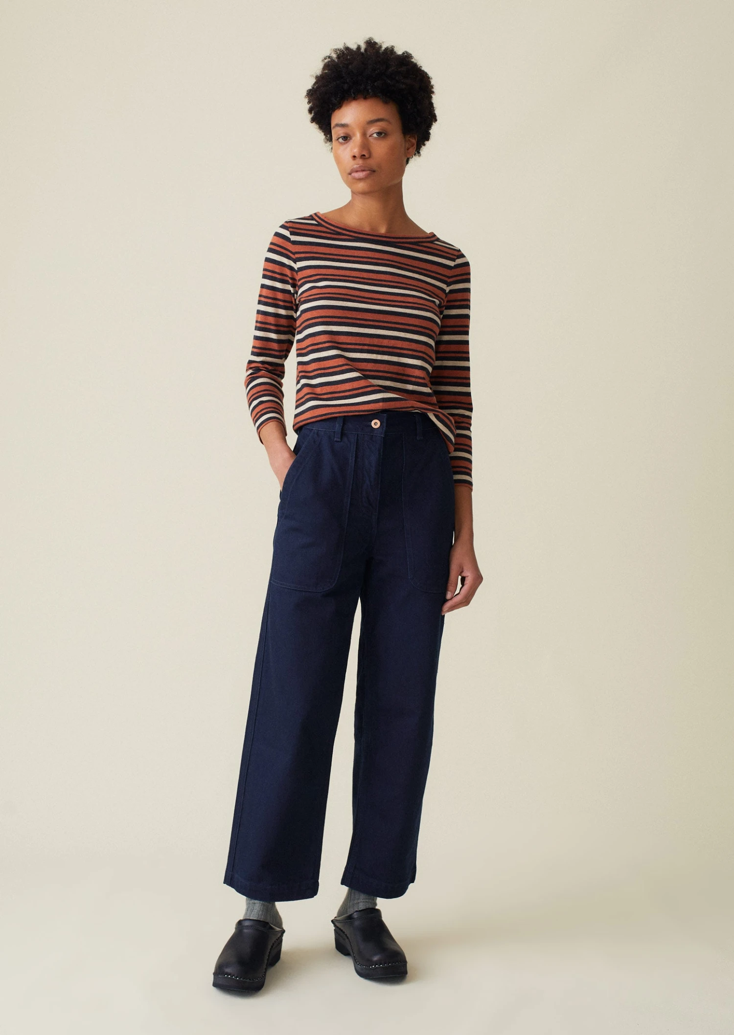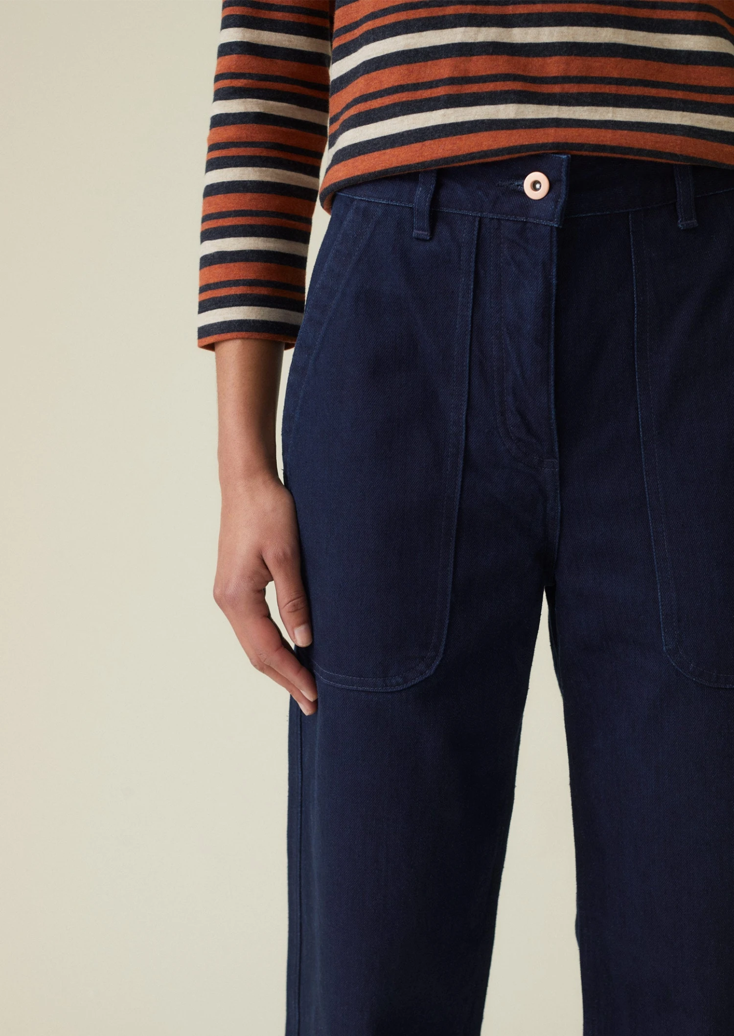 Outside leg length for size 12 is 97cm. Regular fit. Crop. On the waist.