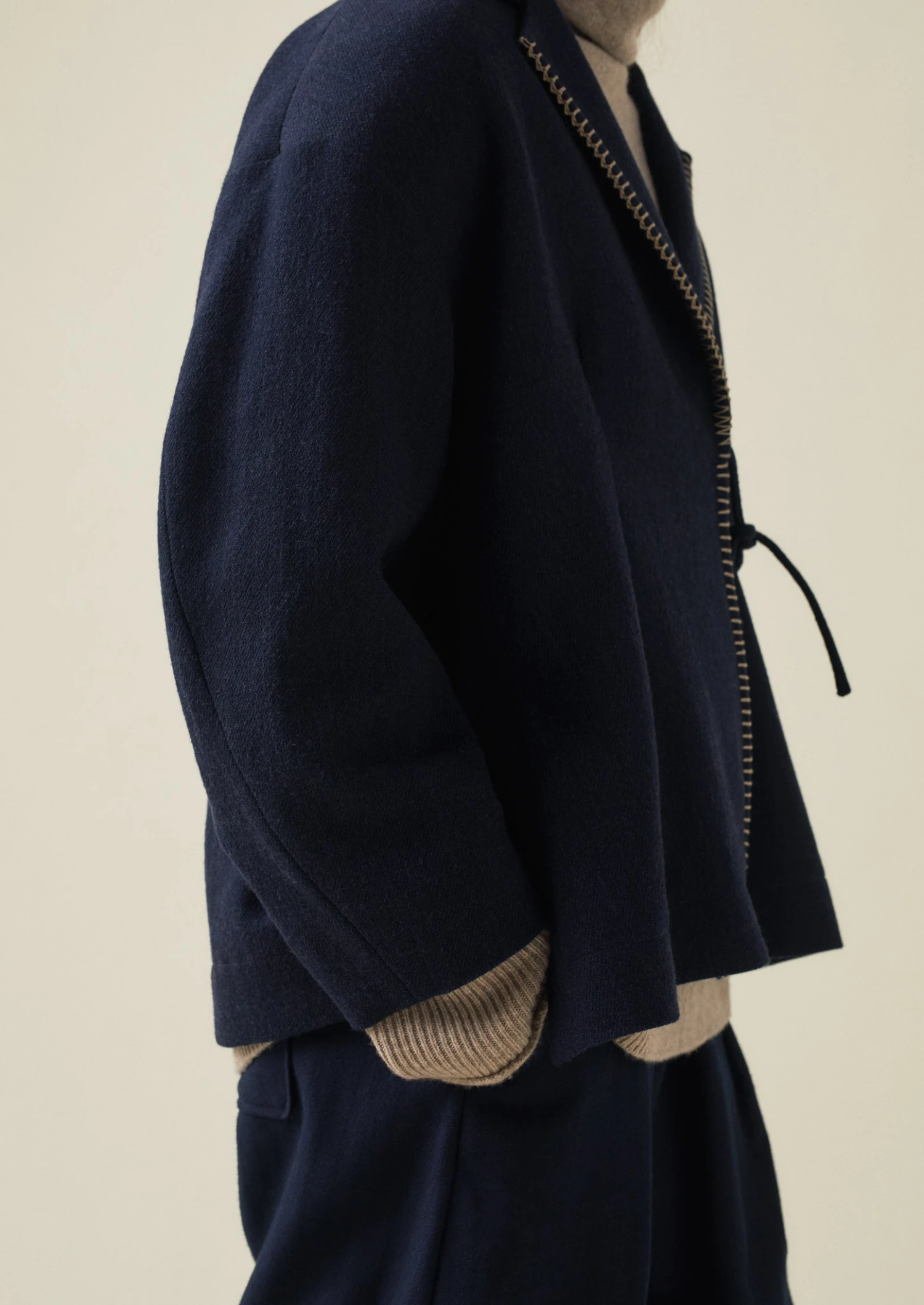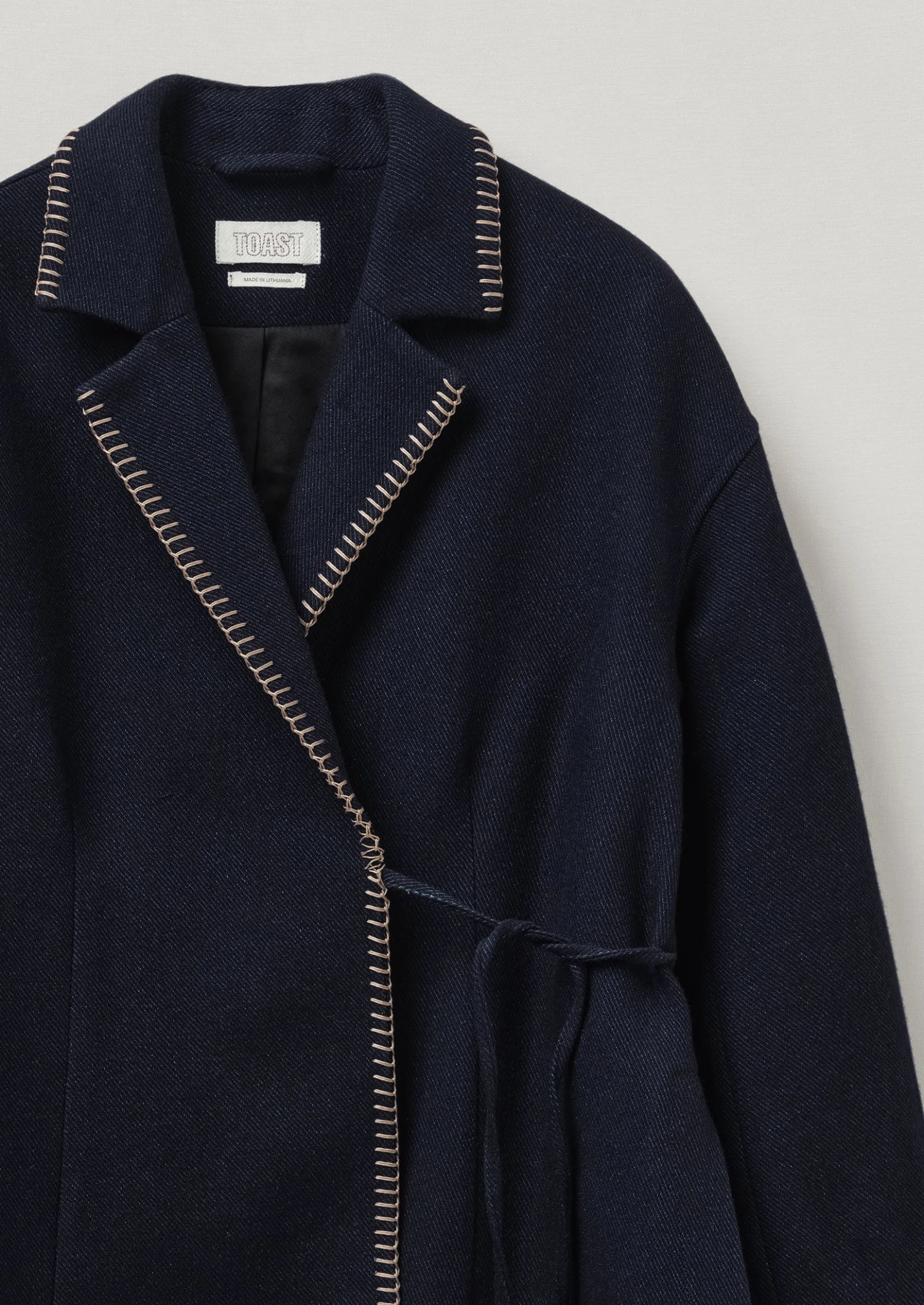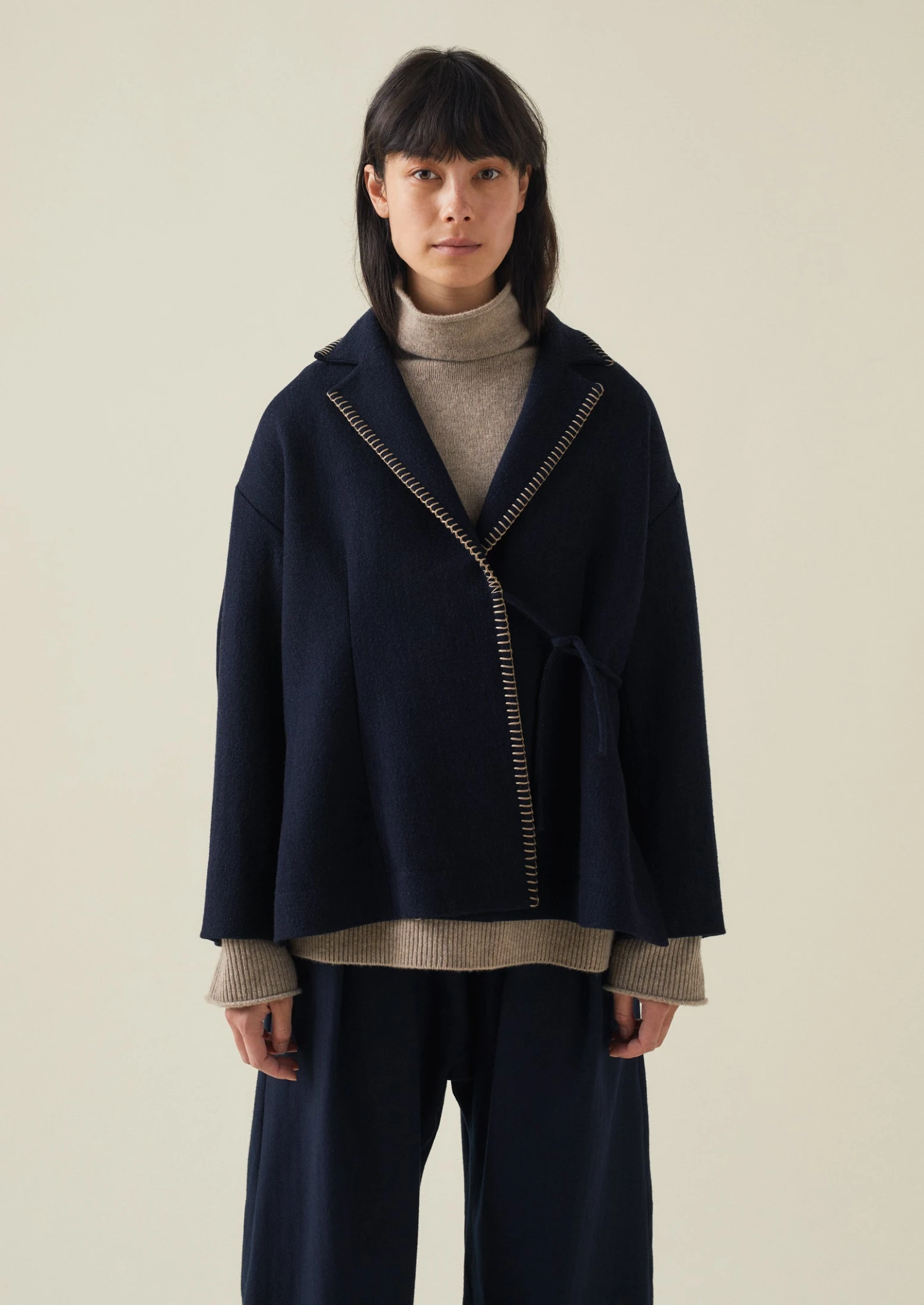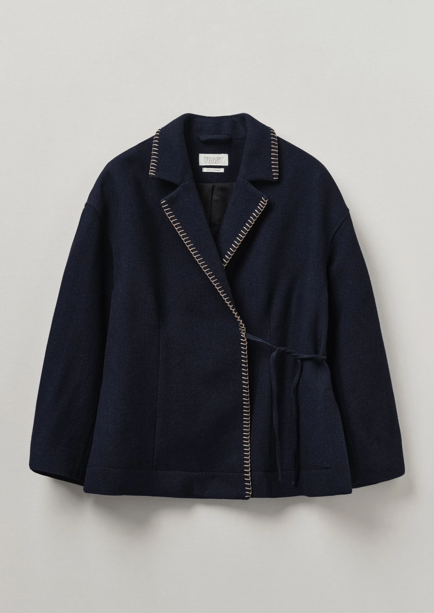 The collar and placket of our wrap jacket is defined by ecru hand blanket-stitched accents. Cut to an A-line shape with dropped sleeves and deep side hem slits, then lined with contrasting cotton twill.