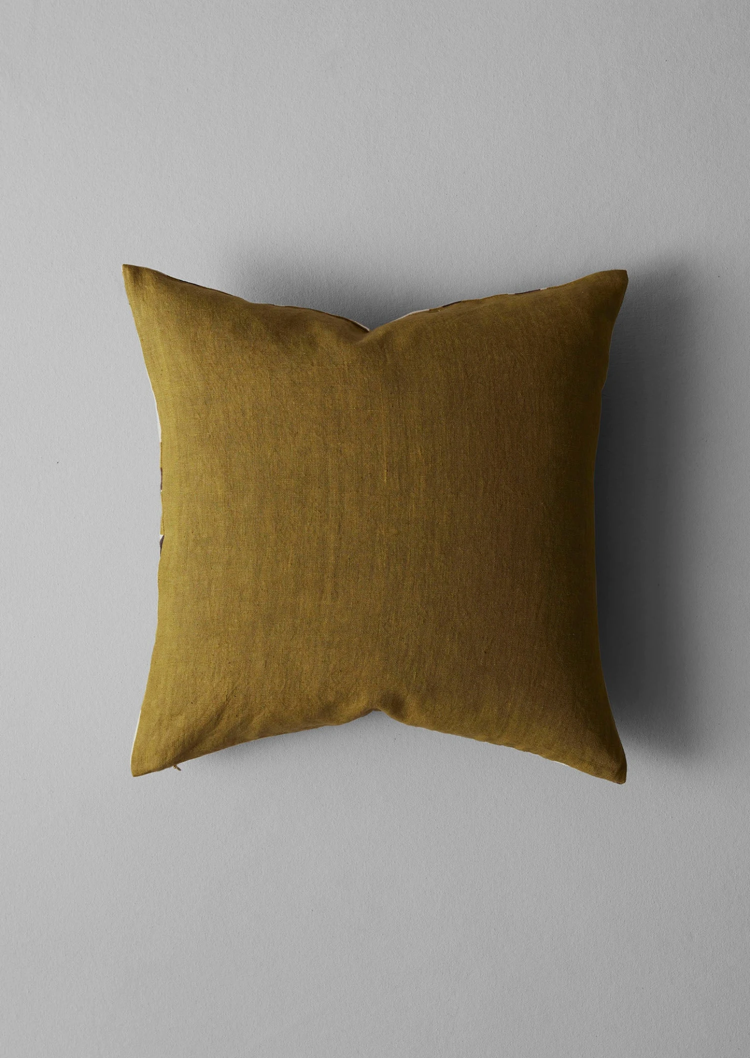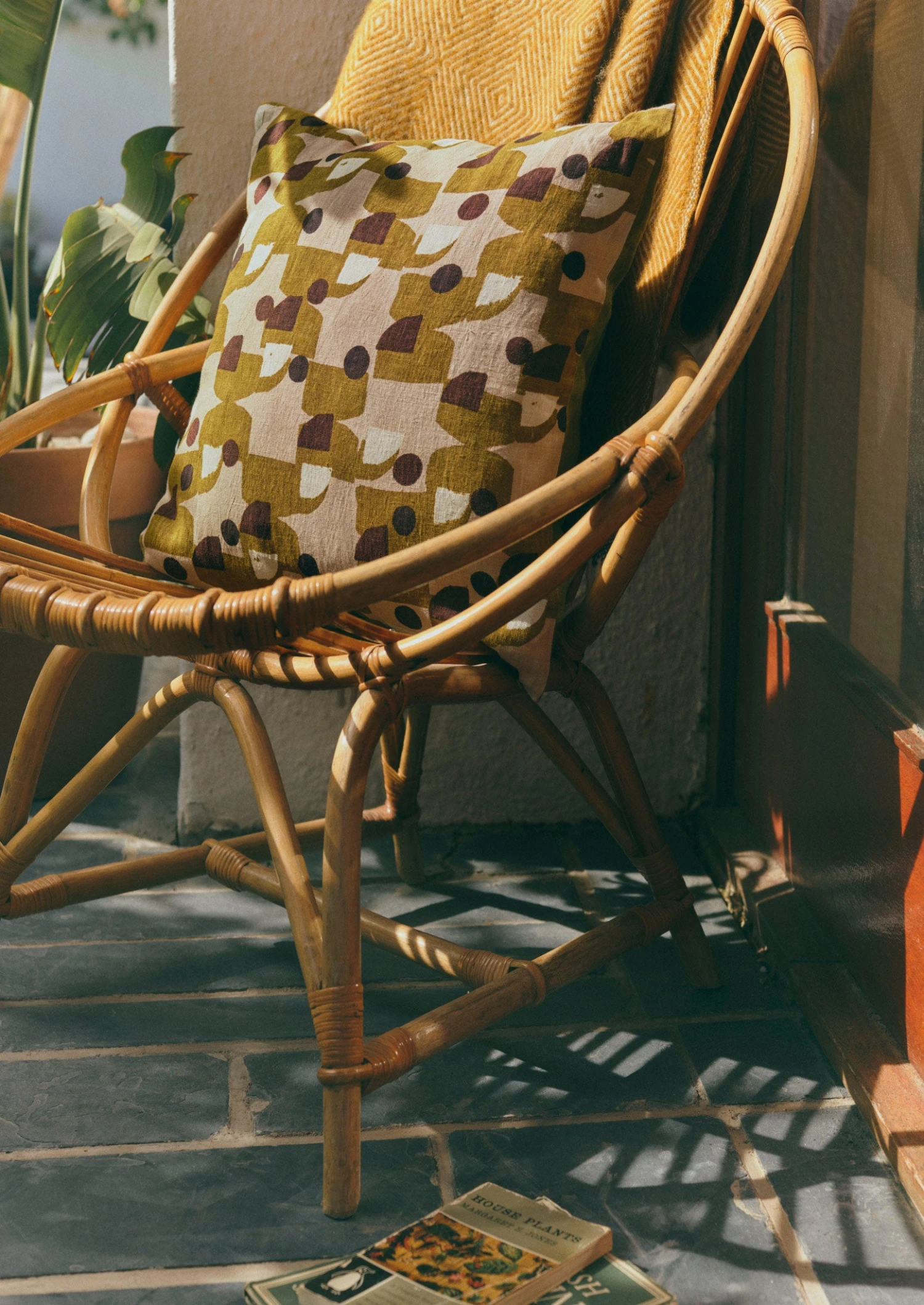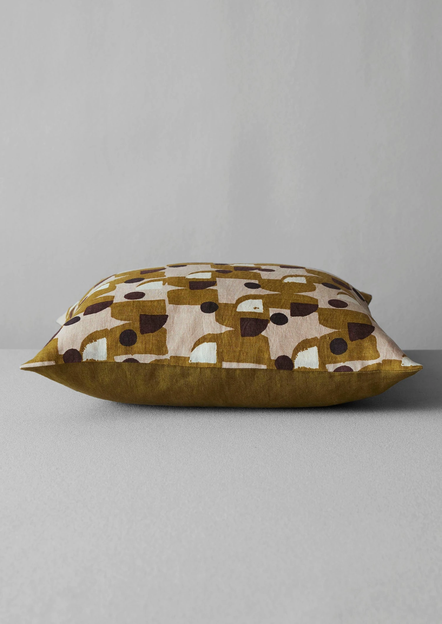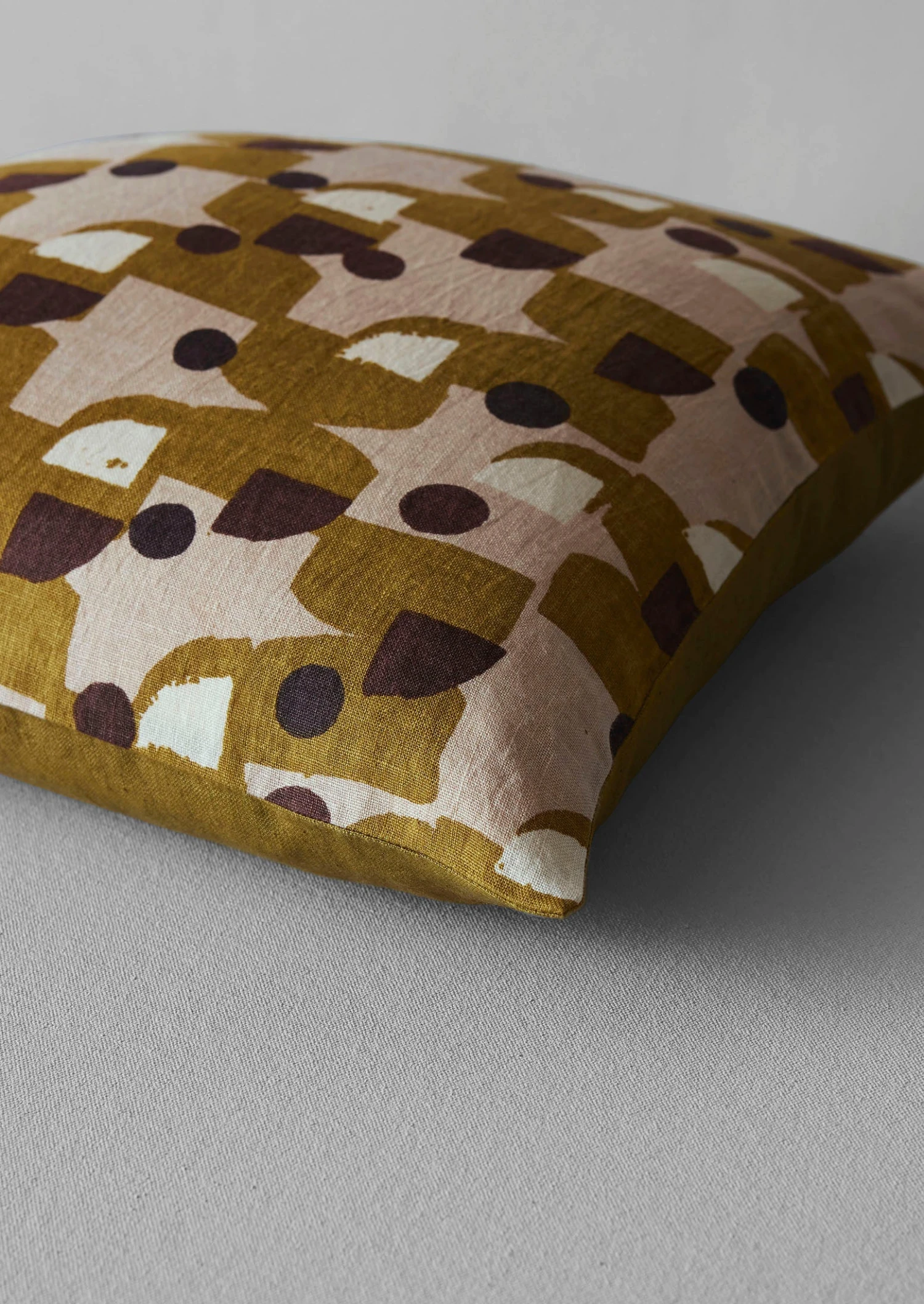 Linen cushion cover hand screen-printed in India with a bold pattern inspired by mid-century modern designs. With a plain dyed linen reverse and neat concealed side-seam zip. To fit a size 46 x 46 cm Wool Cushion Pad.