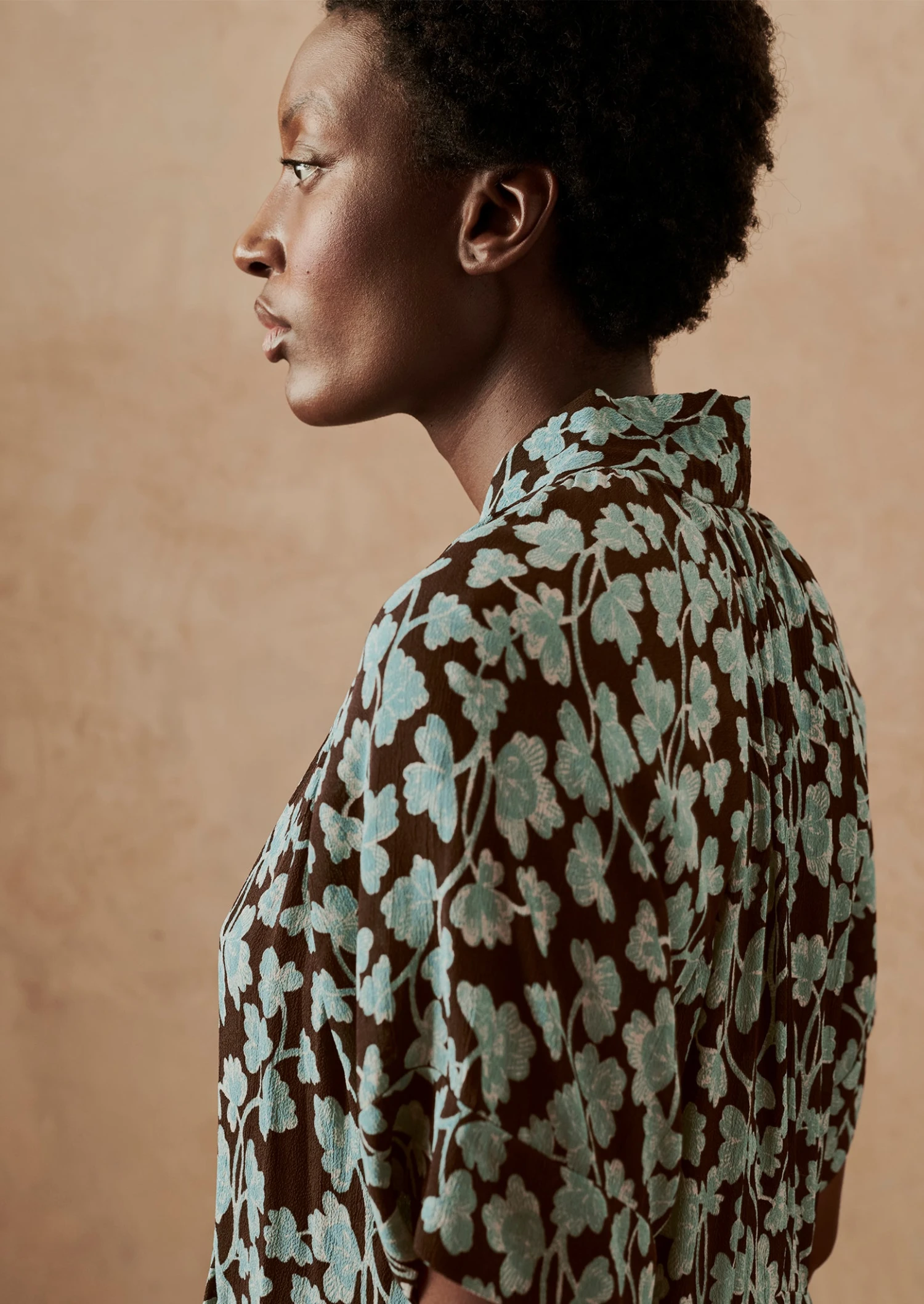 Our Bryn dress is crafted from crepe screen-printed with a trailing clover pattern, inspired by days on the allotment. Cut to an easy shape with neck ties and raglan sleeves, falling to a lower-calf length.
