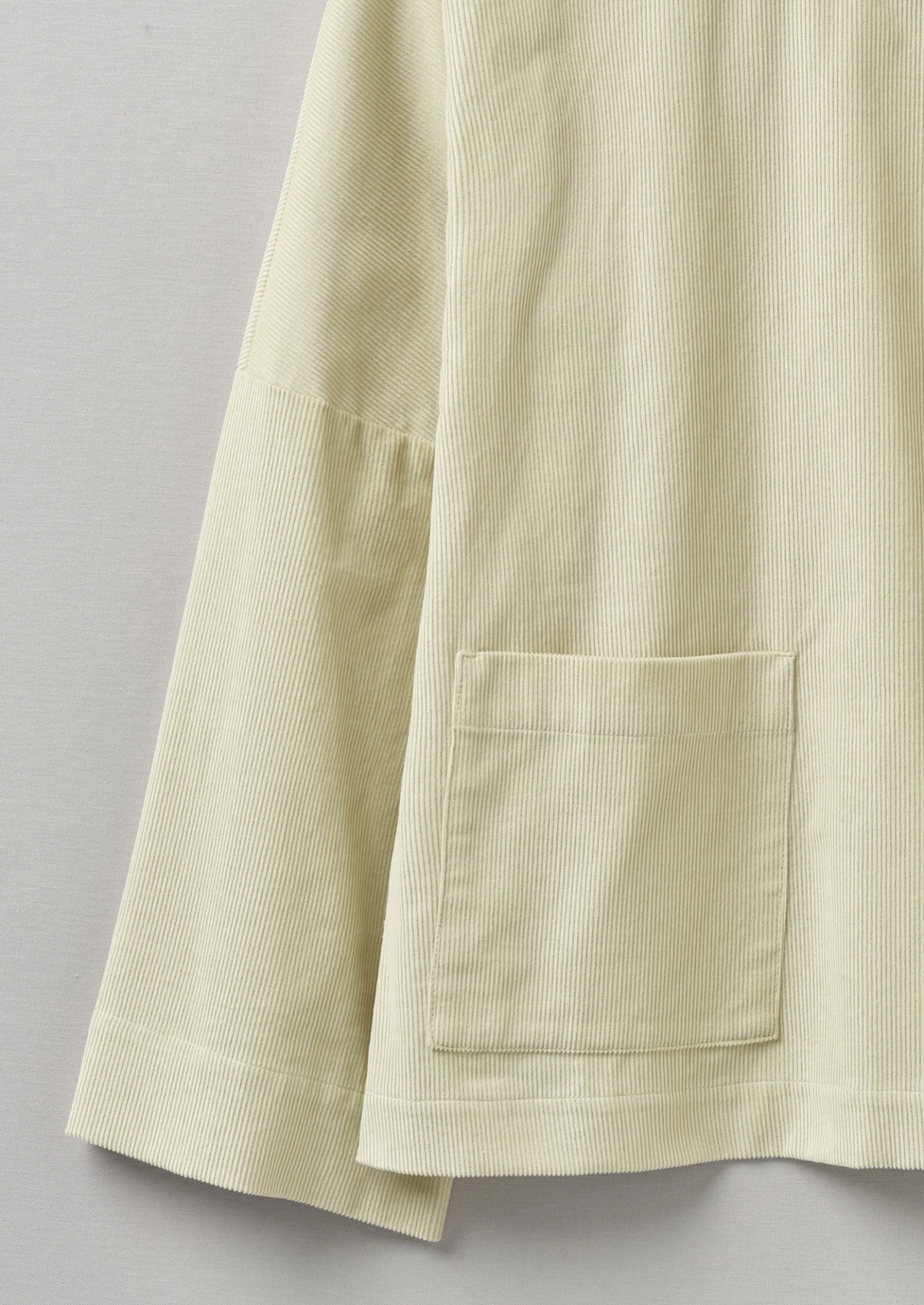 Organic cotton cord. Boxy, easy shape. Wide boat neck. Back hanging loop. Dropped wide sleeves. Side patch pockets. Low-hip length. Side hem slits. Shoulder rouleau loop and corozo button.