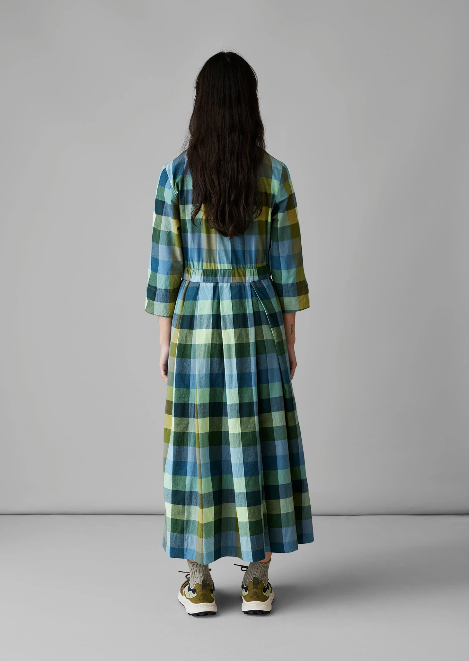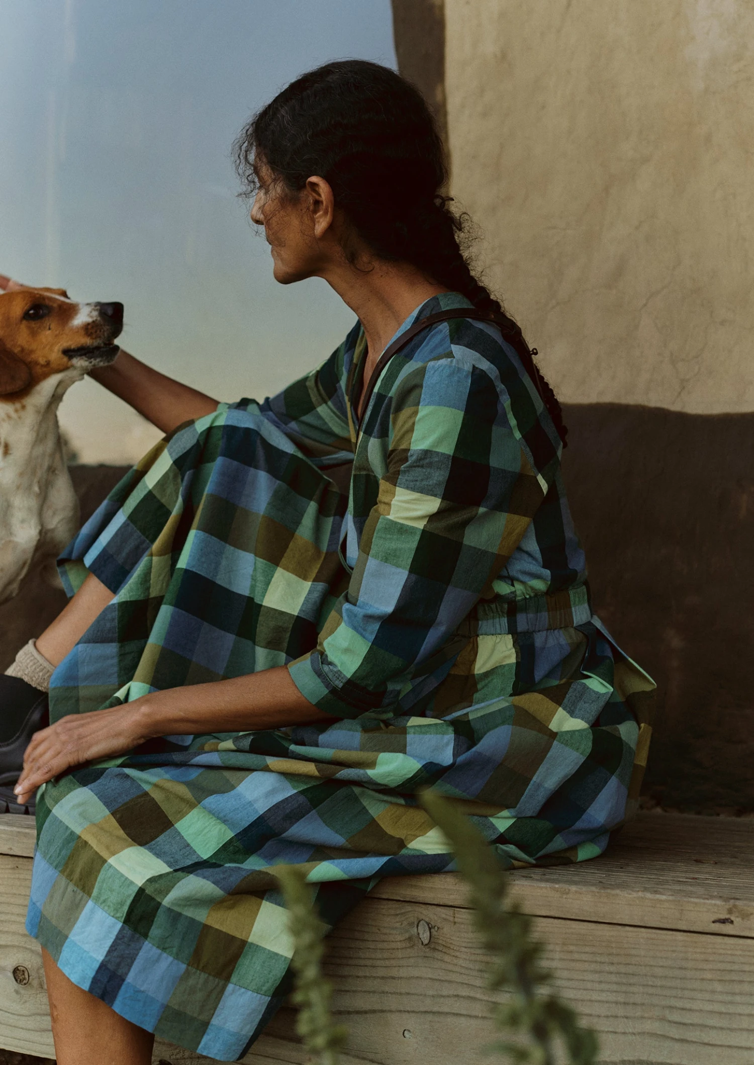 The large checks patterning our organic cotton dress are inspired by found textiles in rural cabins. Shaped with a crossover V-neck and falling from the elasticated pleated waist to a mid-calf length hem.