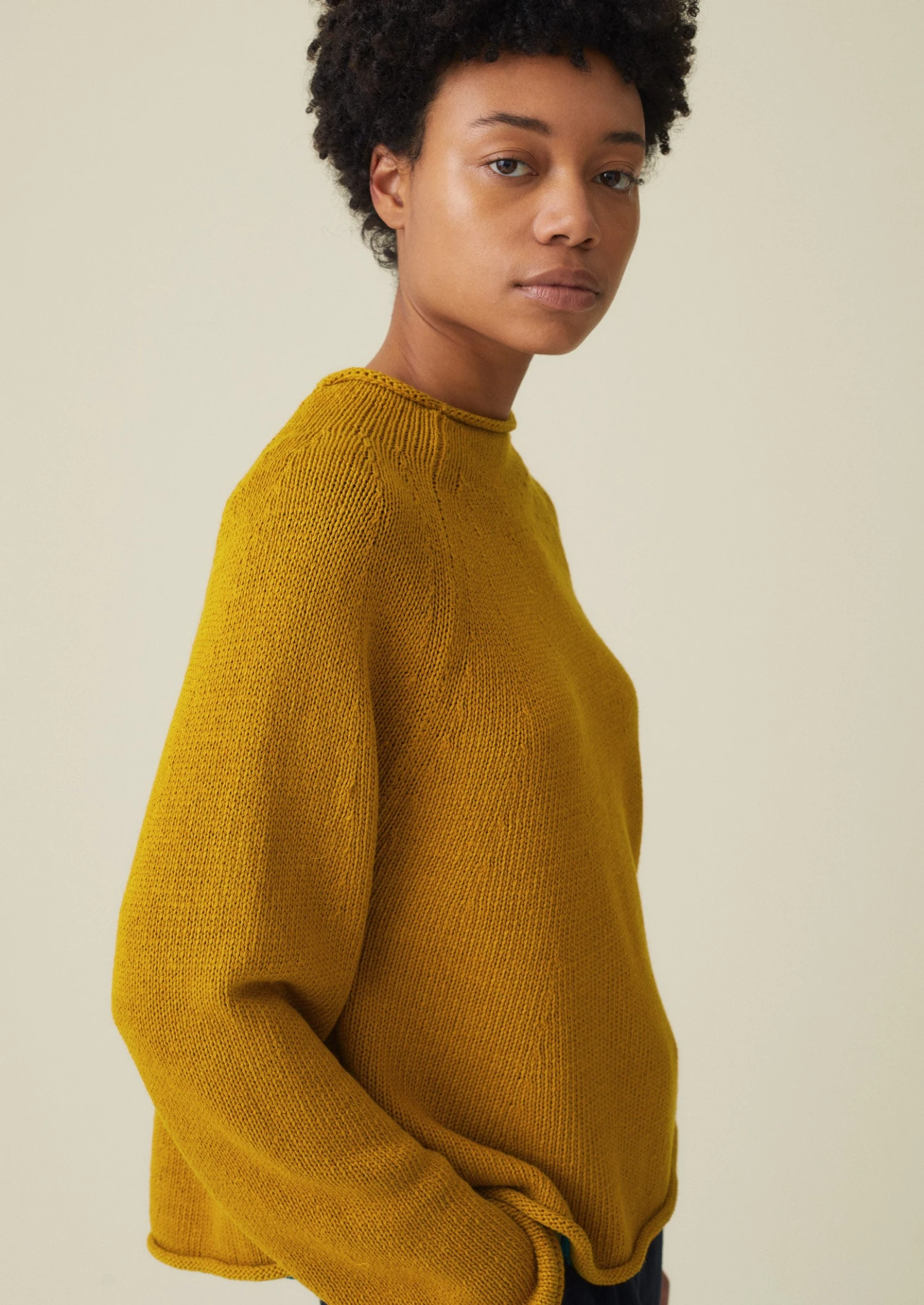 Our swingy, easy sweater has shaping at the yoke for a considered shape. Crafted from a textured, weighty linen and cotton blend to a high-neck silhouette with raglan sleeves, then finished with rolled edges.