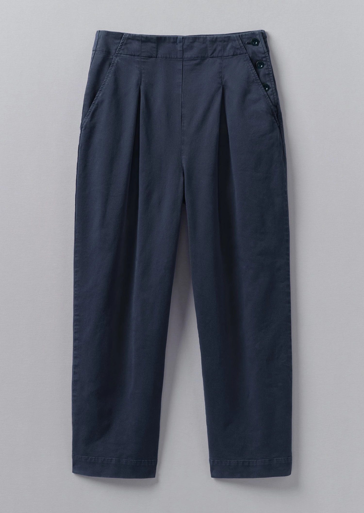 Our trousers are accented by a trio of buttons at the side of the waist and garment-dyed for a rich depth of colour. Crafted from supple cotton twill with a touch of stretch and shaped with slightly balloon-shaped legs which taper in gently at the ankle.
