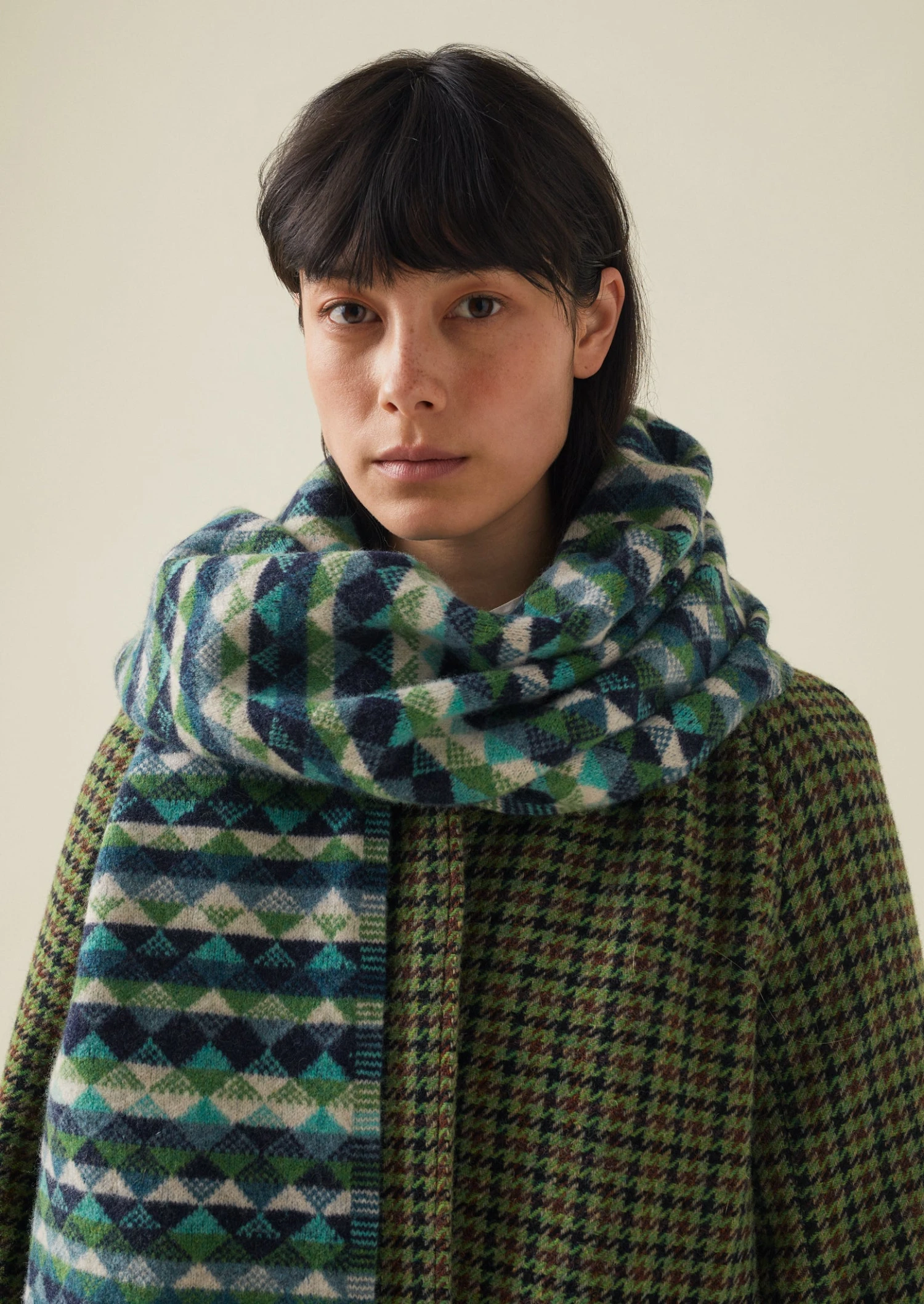Our wide, wrappy scarf is knitted in Scotland from UK-spun wool. With a geometric diamond jacquard pattern and tactile float-stitched reverse, then finished with ribbed edges.
