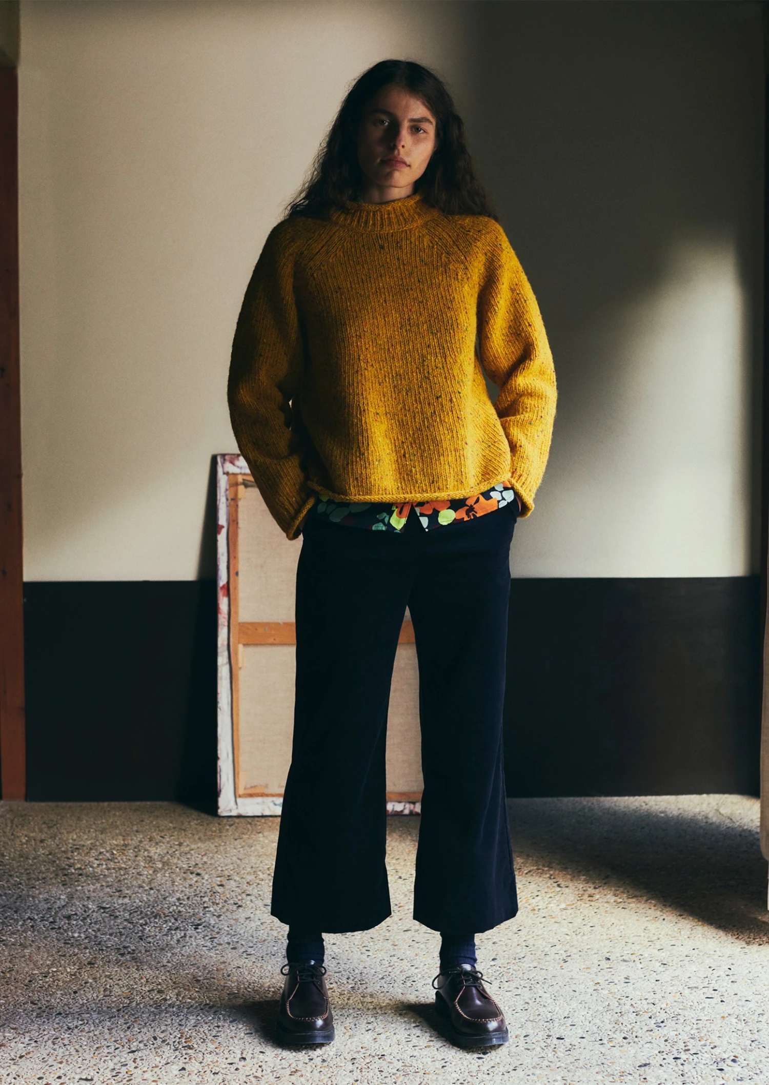 Our easy sweater is knitted from warm wool spun in Donegal, Ireland with a characterful nepp. Shaped to a mid-hip silhouette with raglan sleeves and ribbing at the neck and hem, then finished with effortless rolled edges.