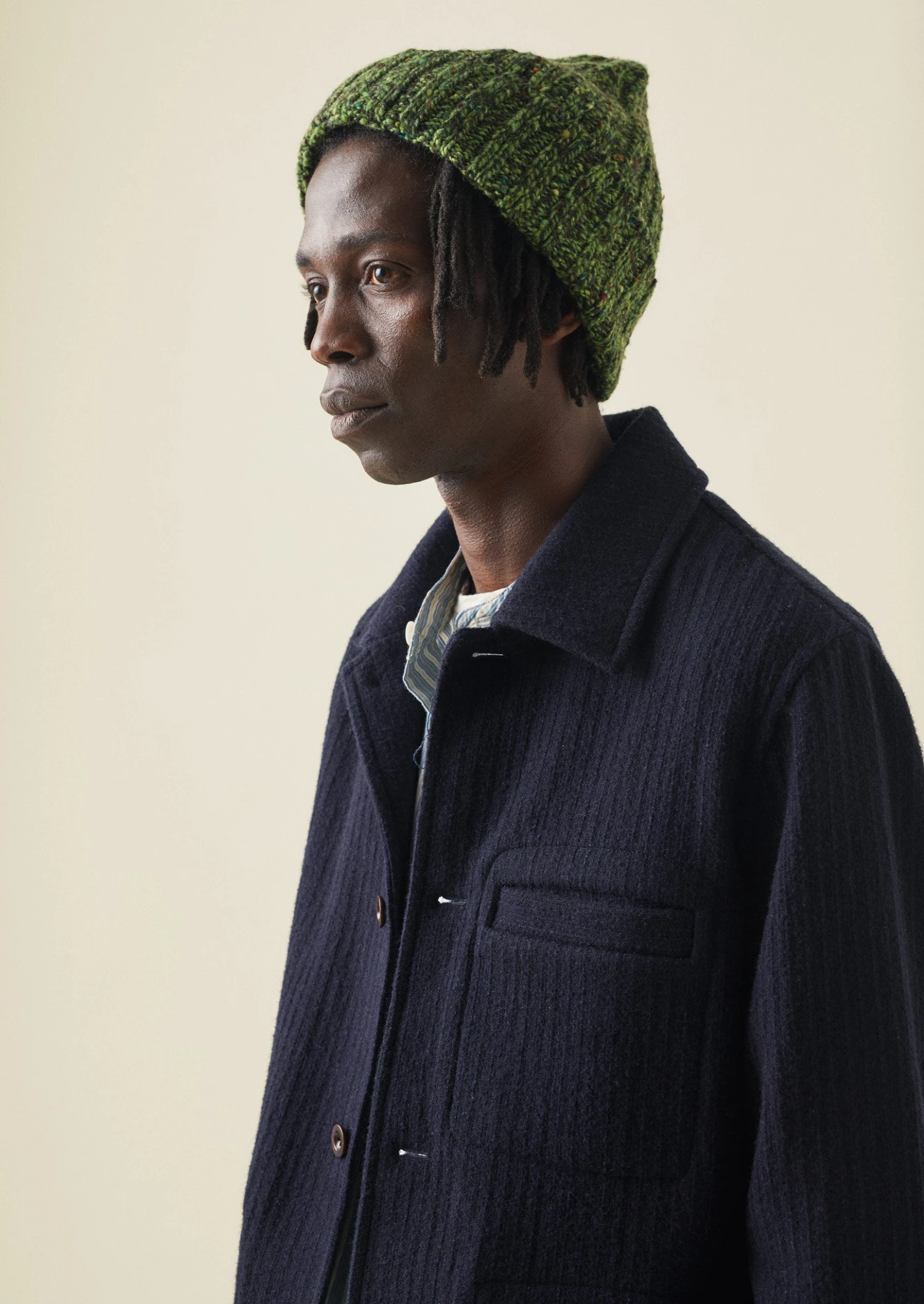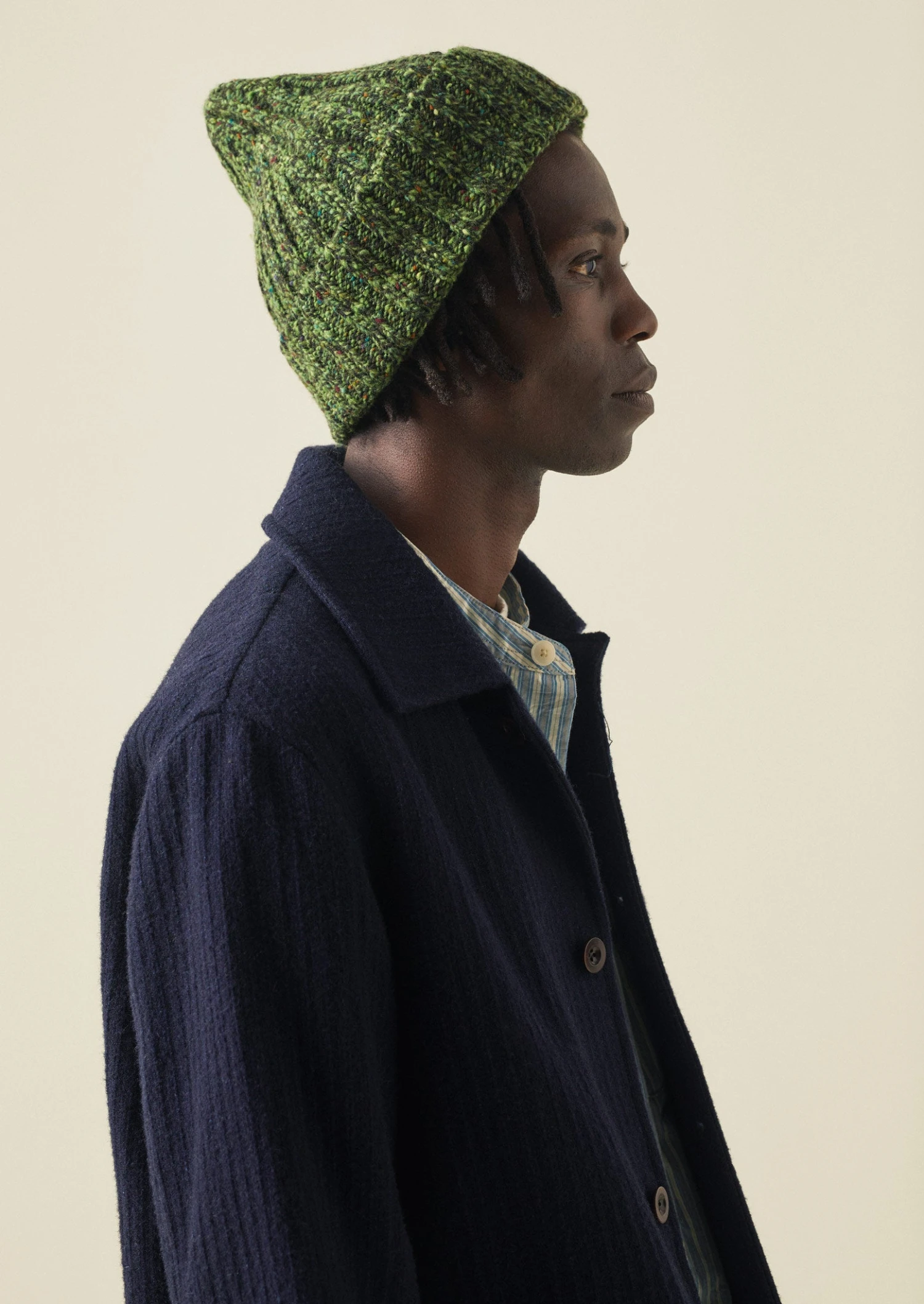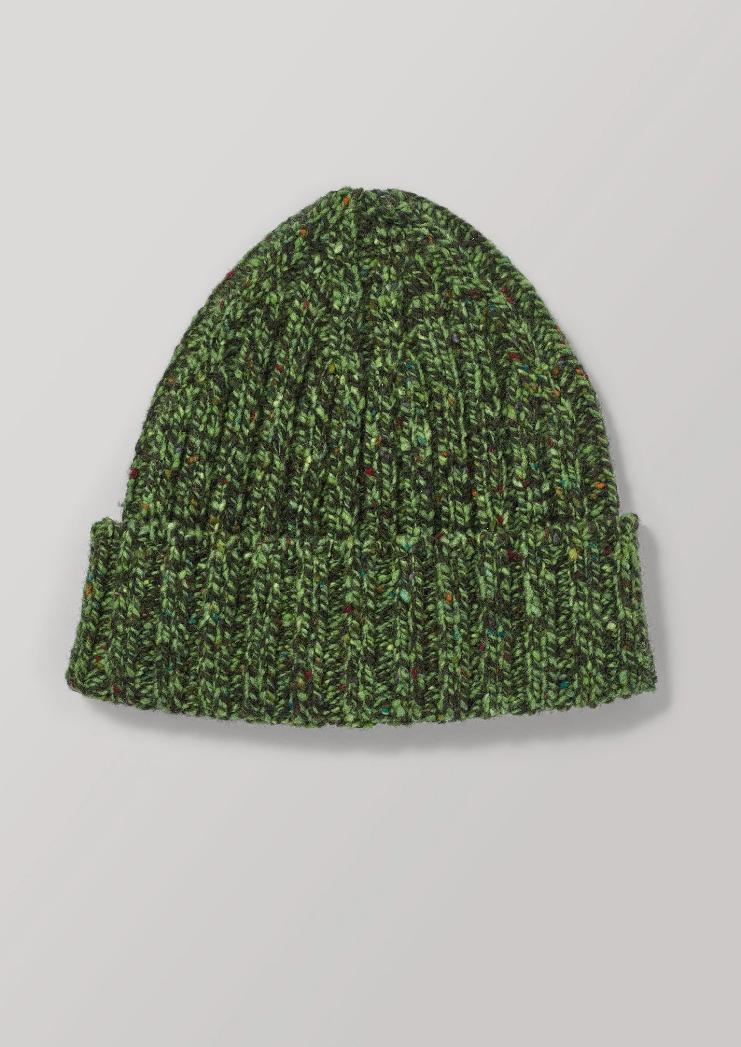 Our warm hat is knitted from wool spun in Donegal, Ireland, which is marled and speckled for a sense of texture. Knitted “in the round”, making it seamless, with wide ribs and a turn-up hem.
