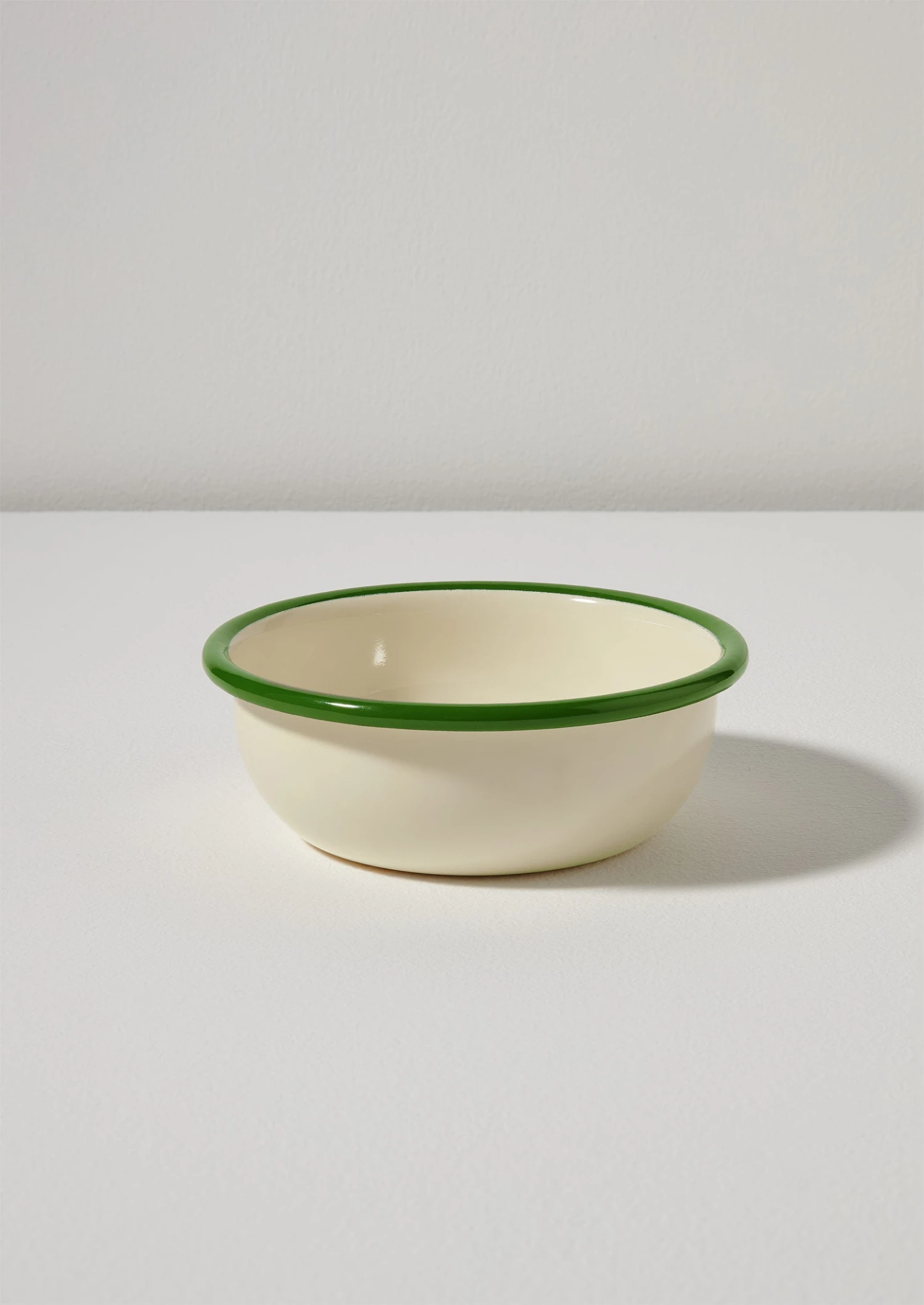 Traditional, durable and smooth, porcelain-infused enamel bowl for the kitchen, for camping, or as you will. With a contrasting colour rim and outer. For cereal or snacks such as chopped fruit. With a small amount of colour variation from batch to batch.