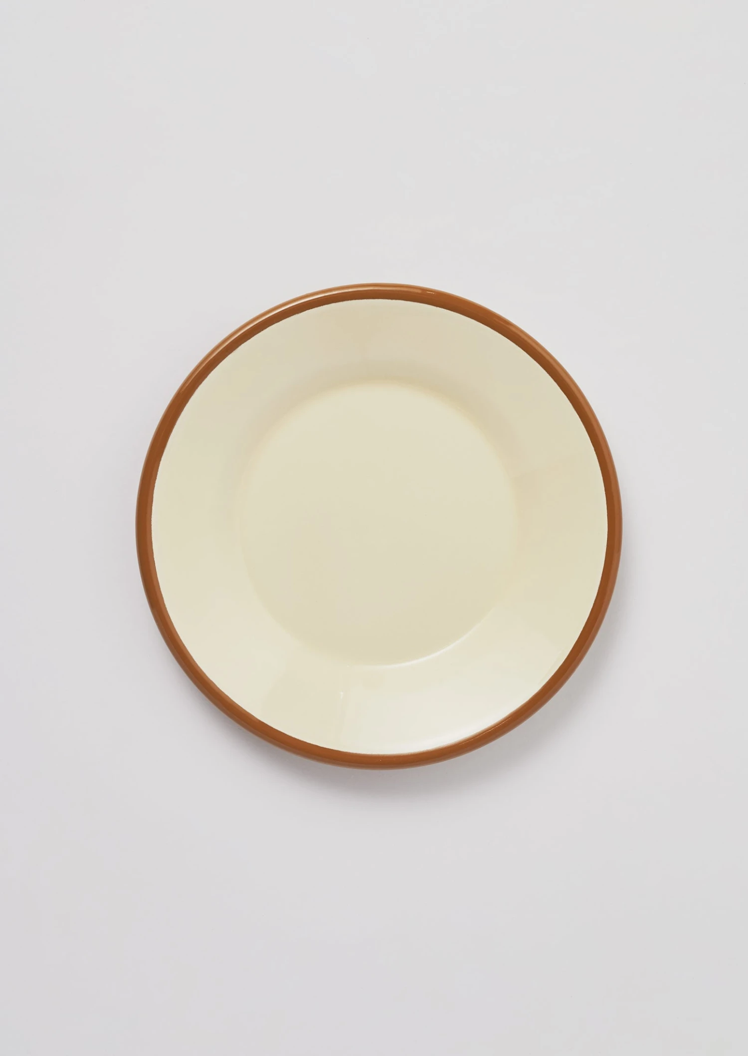 Traditional, durable and smooth, porcelain-infused enamel plate for the kitchen, for camping, or as you will. Accented by contrasting colour around the rim. With a small amount of colour variation from batch to batch.