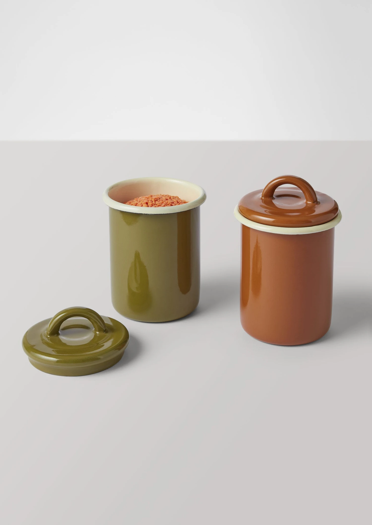 Traditional, durable and smooth, porcelain-infused enamel storage jar for the kitchen. With a handled lid accented by a contrasting rim. With a small amount of colour variation from batch to batch.