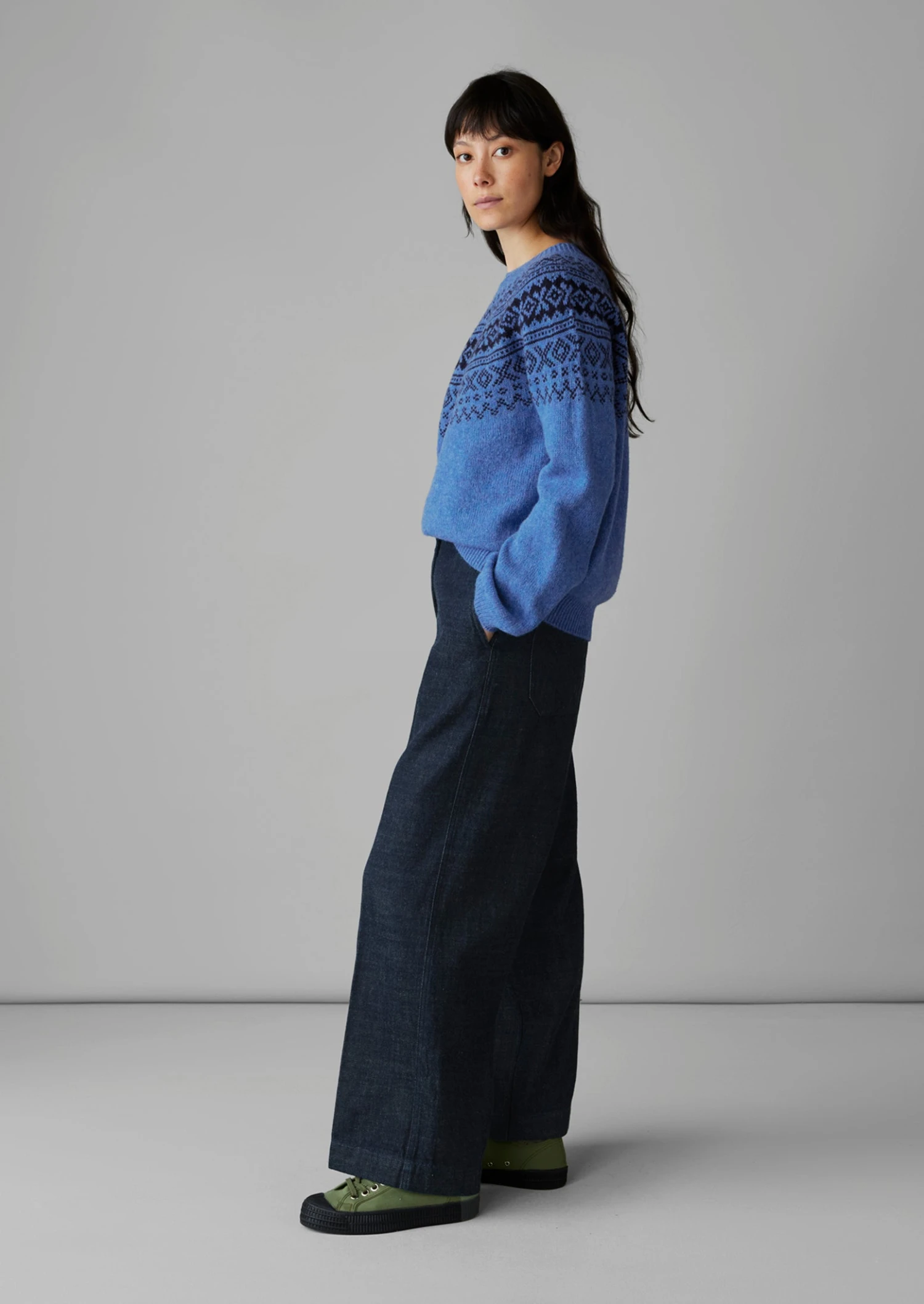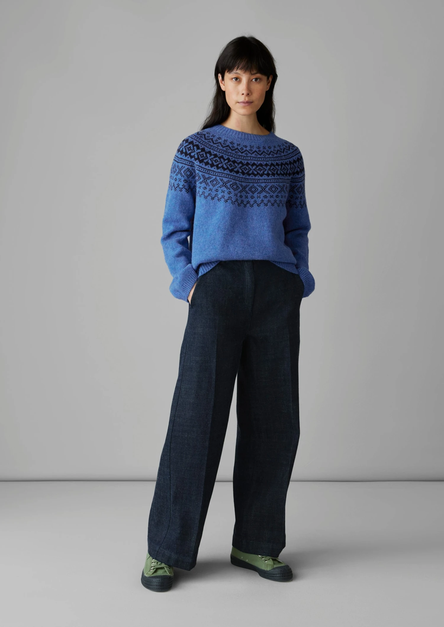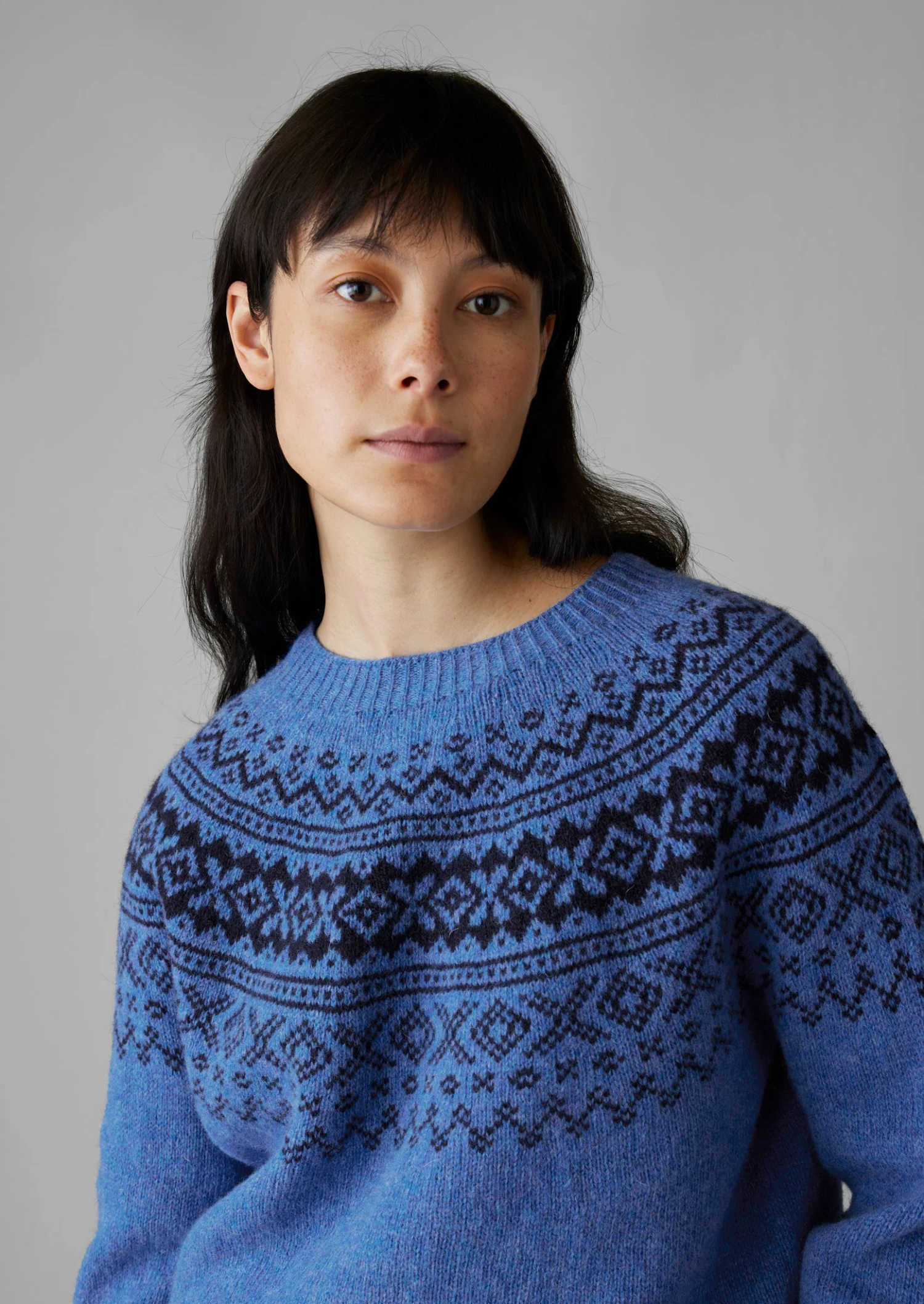 An intricate geometric Fair Isle pattern runs around the shaped yoke and sleeves of our sweater. Knitted in Scotland from soft wool to an easy shape with elongated sleeves, ending with rolled cuffs.