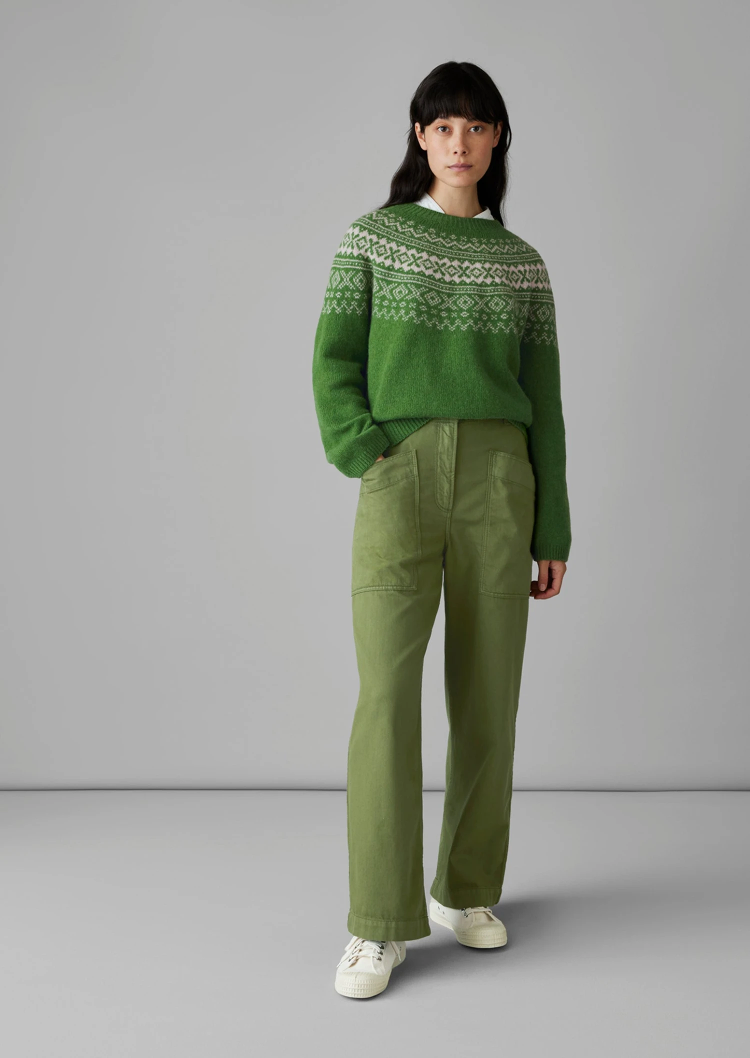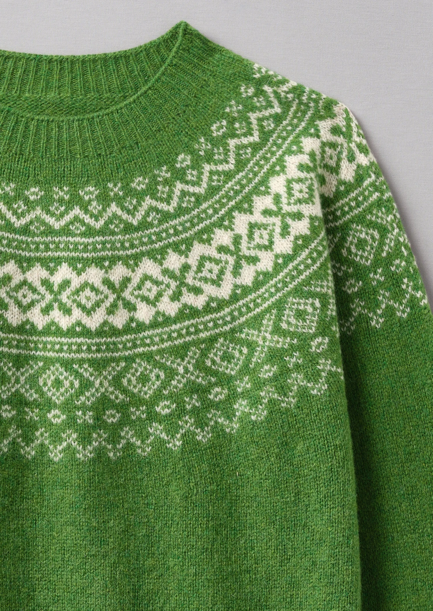 Soft wool. Fair Isle jacquard. Easy shape. Shaped yoke. Elongated sleeves. Rolled cuffs. Integral ribbed edges. Low-hip length.