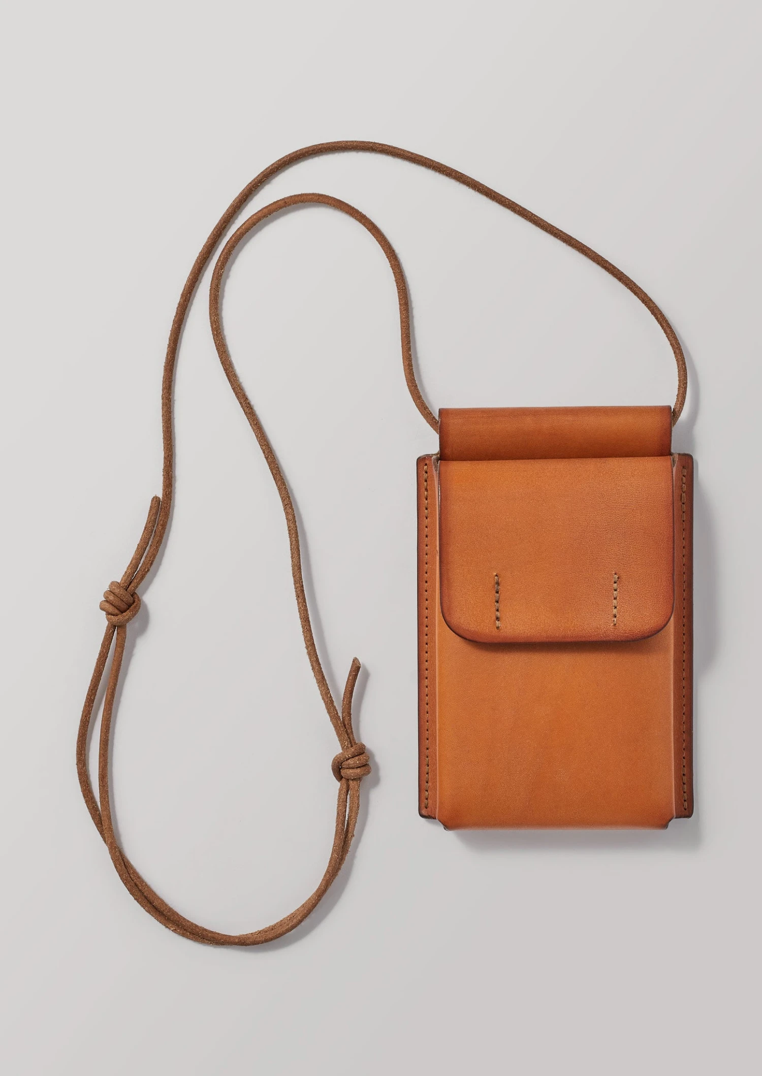Vegetable-tanned leather. Slender adjustable strap. Press-stud flap.