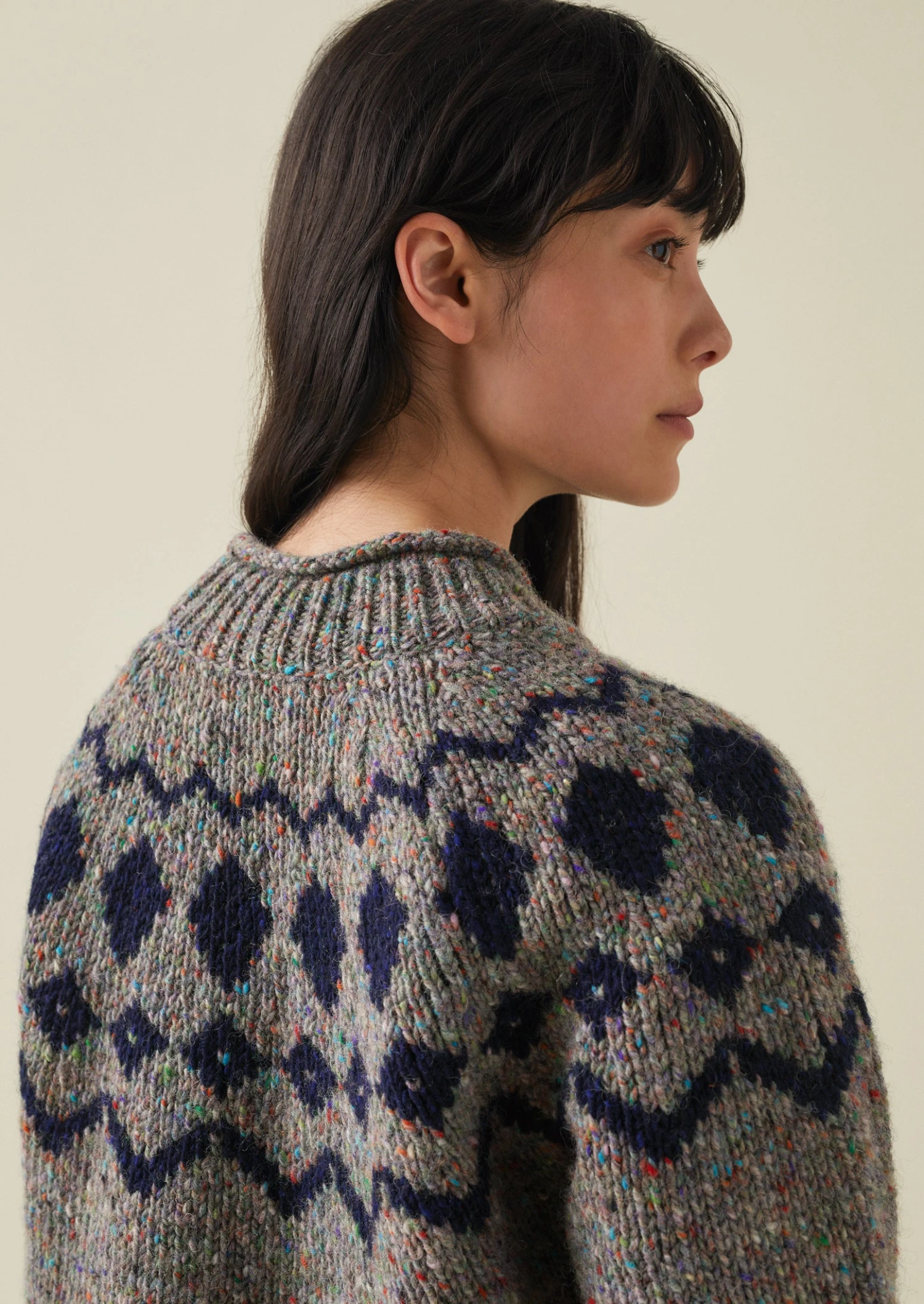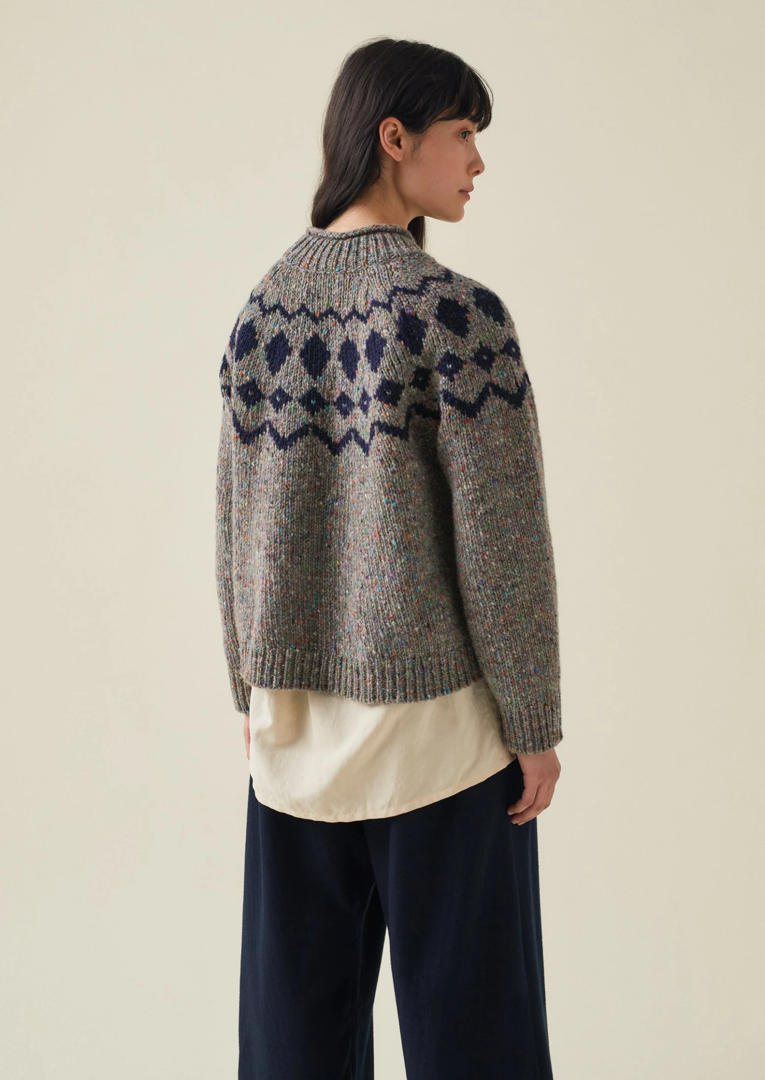 Colourful specks are scattered through our sweater, which is crafted from wool spun in Donegal, Ireland. Knitted to an easy, slightly swingy shape with a geometric jacquard pattern and raglan sleeves, then finished with a roll at the high neck.