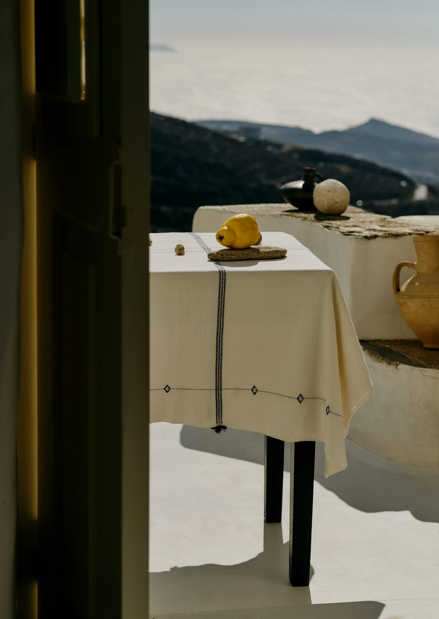 Weighty cotton tablecloth handwoven by artisans in West Bengal. Featuring intricate diamond motifs, created through the traditional jamdani method where an extra weft yarn is separately handwoven into the cloth. Woven in two sections due to the width of the loom, then hand-stitched together in the centre. With a raised weft stripe, selvedge stripes and tassels at the edges.