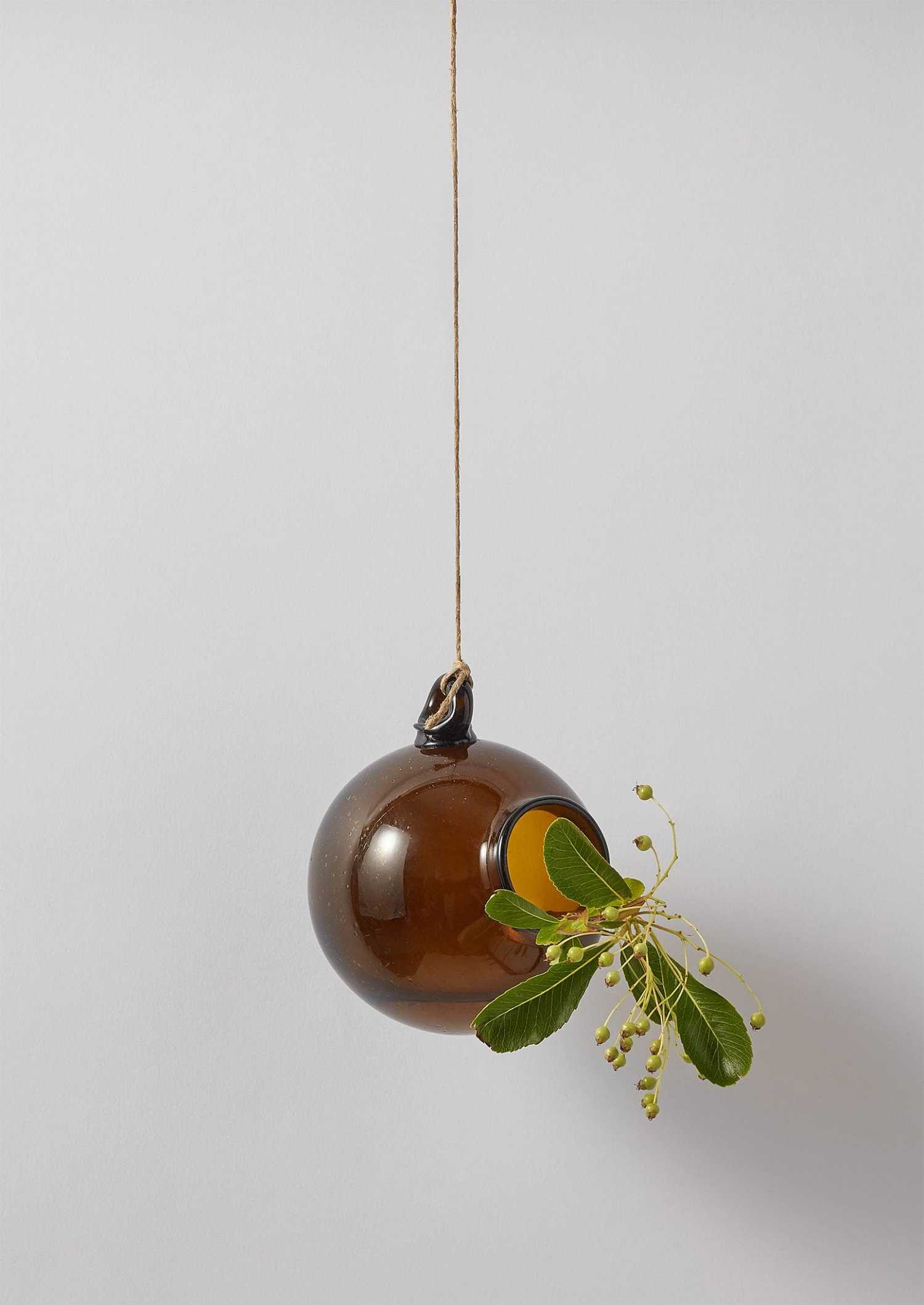 Rounded vase with a small loop, allowing it to be suspended from string or twine of your choice, as well as placed on a flat surface. Hand-blown in France by artisans for La Soufflerie, using traditional glass blowing techniques.