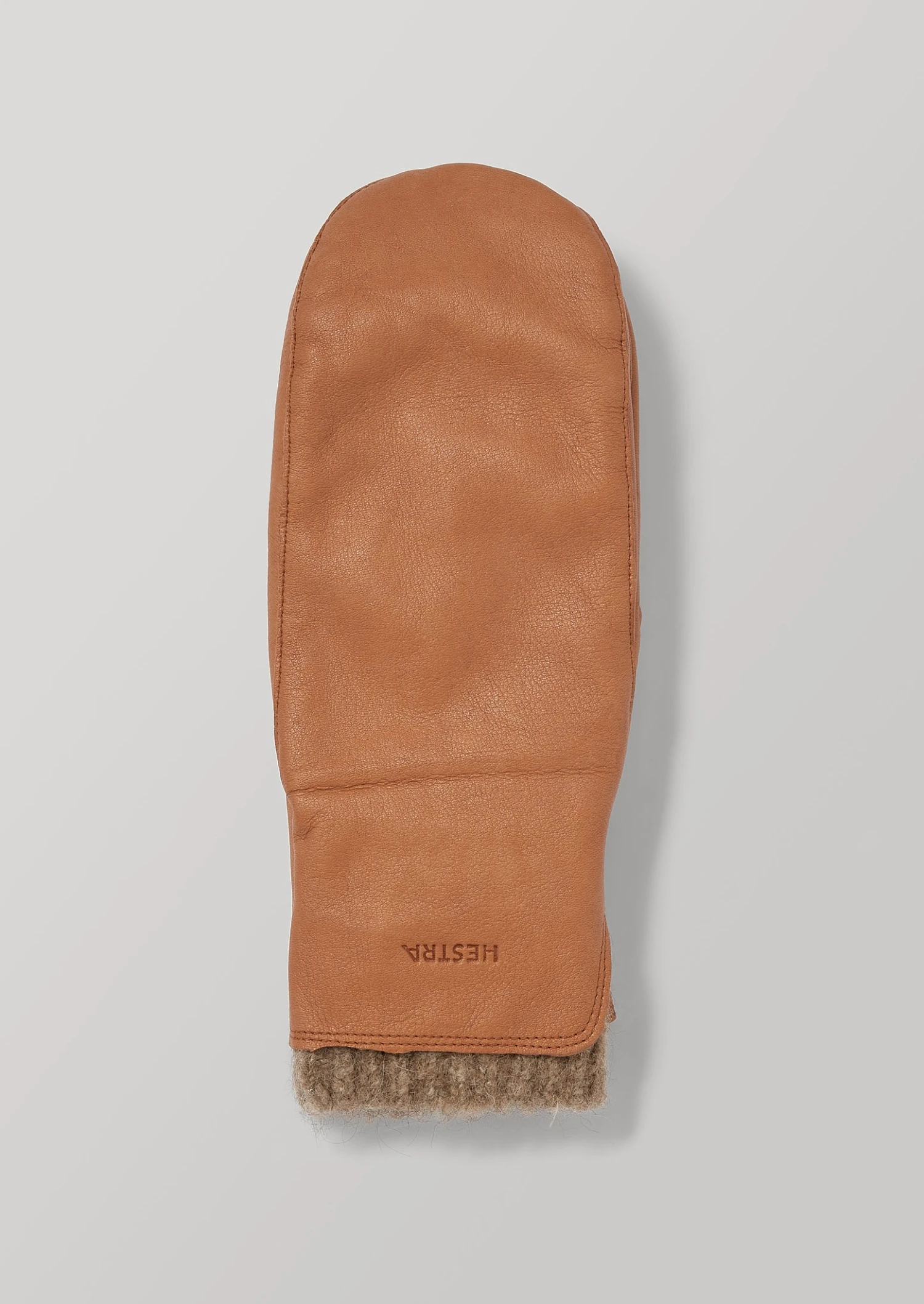 Tiril mittens crafted by Hestra with a warm detachable lining knitted from a soft yarn containing yak, alpaca and merino wool. Made from supple deerskin leather and accented by a debossed logo.