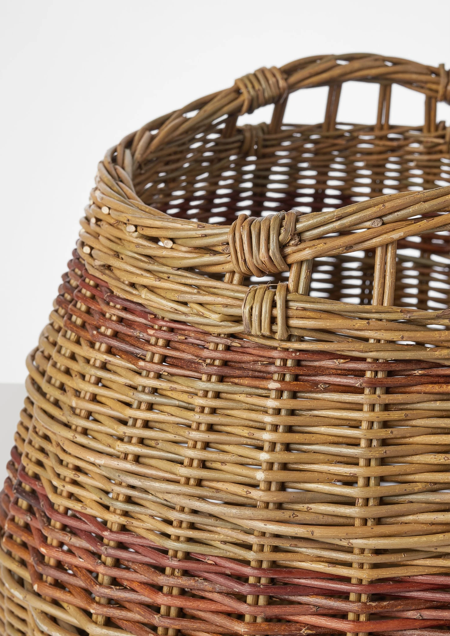 Sturdy log basket handwoven from willow by Sarah Loughlin, founder of Hopewood Baskets in the Wyre Forest area of Worcestershire. With a contrasting pattern that spirals up the basket to the handles. The basketry willow is soaked to make it pliable for up to a fortnight, then taken out of the soaking tank to be ‘mellowed’ overnight, which involves wrapping the willow in a damp cloth to allow the water to soak into the inner core of the rods.