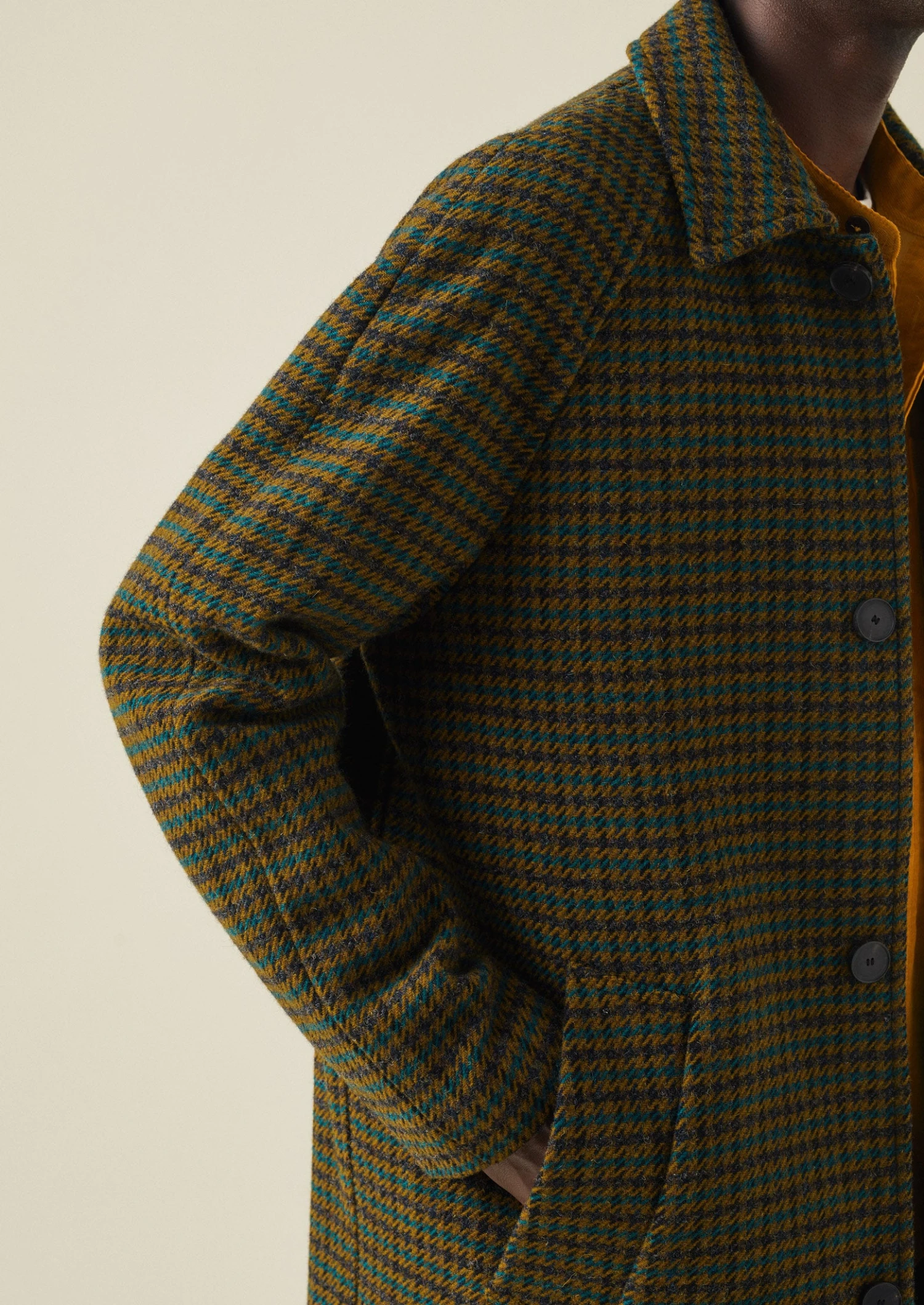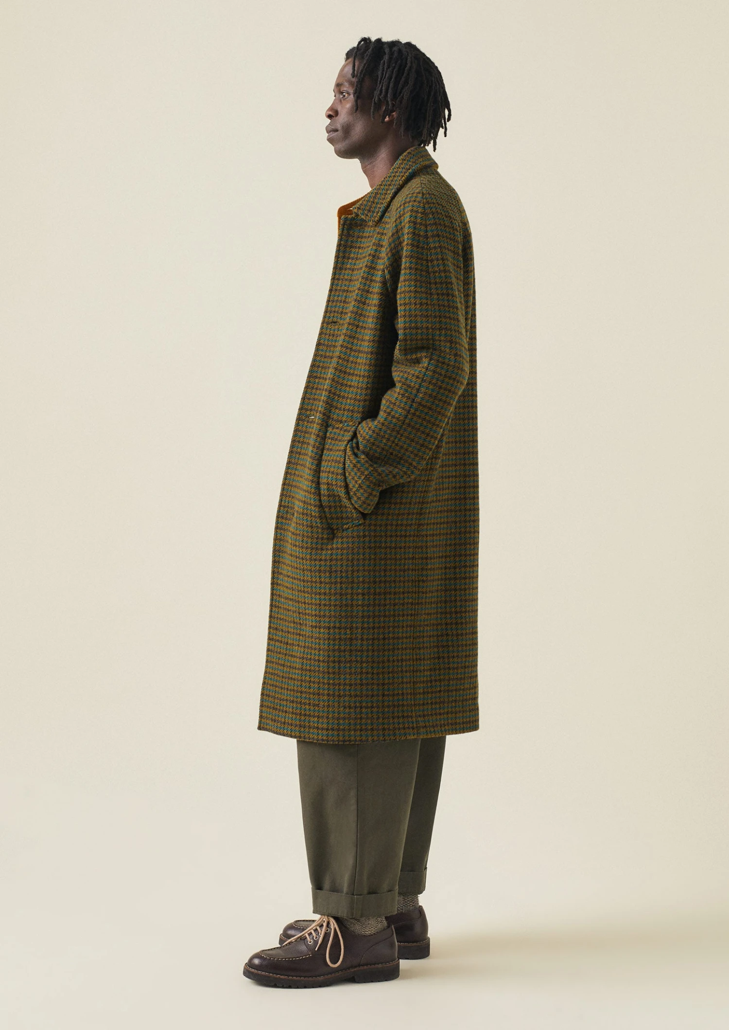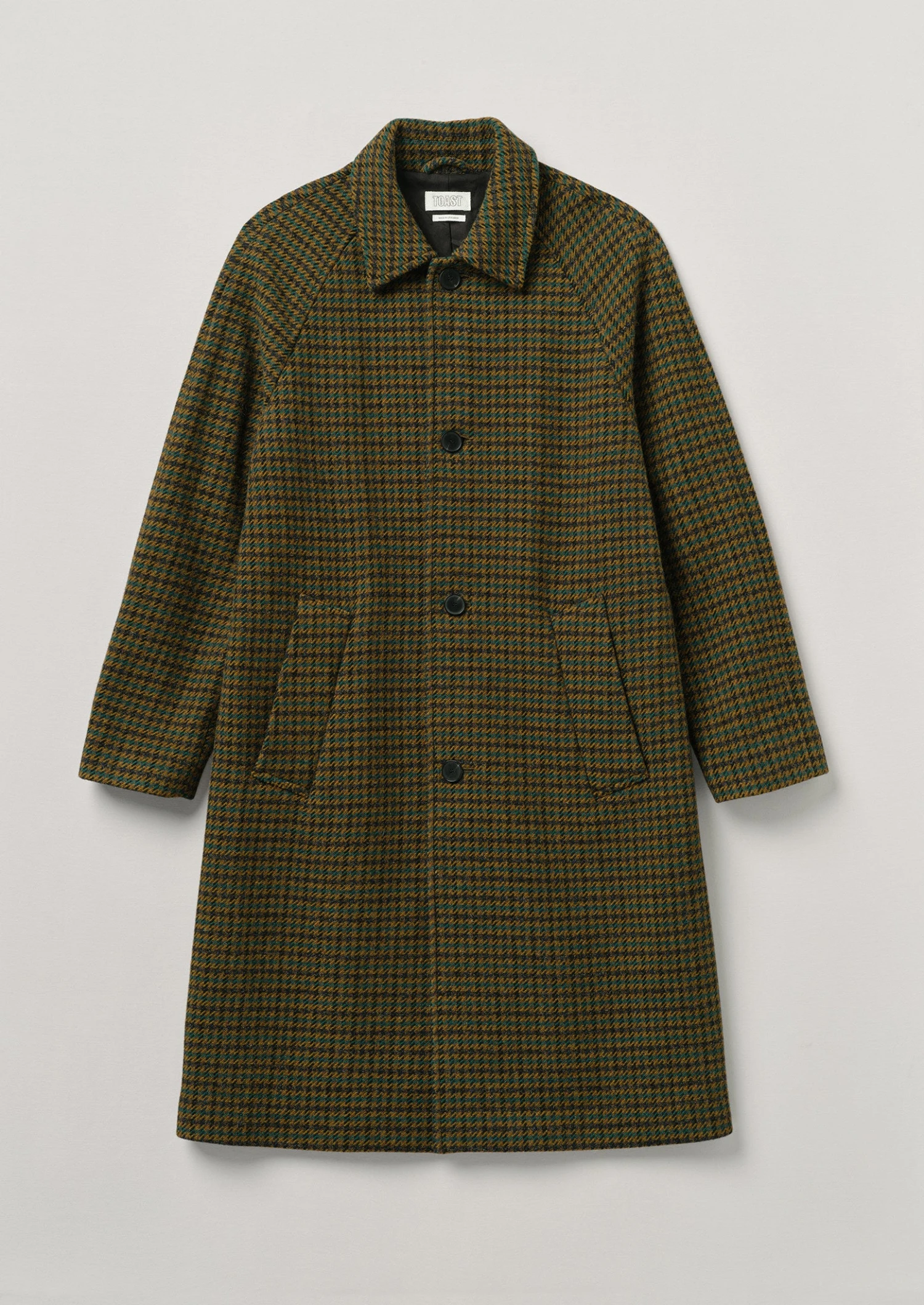 Our collared houndstooth coat is crafted from a heavy and weighty wool woven with a houndstooth pattern in Italy. Cut to a relaxed, single-breasted silhouette with curved raglan seams, giving ease of movement, falling to a below-knee length.