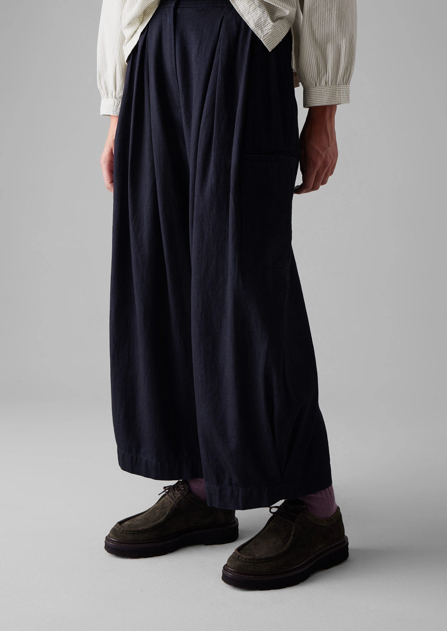 Inverted box pleats at the waist accentuate the volume through the wide cropped legs of our trousers. Crafted from relaxed cotton twill with low side welt pockets.