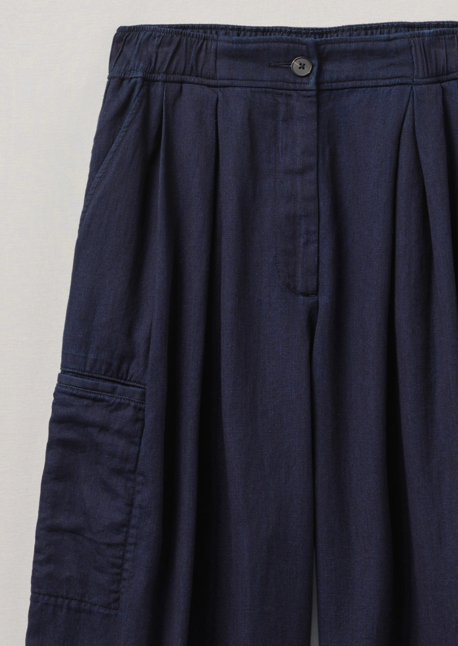 Cotton twill. Easy shape. Inverted box pleats. Side pockets. Low side welt pockets. Back patch pocket. Wide cropped legs. Zip and corozo buttons.