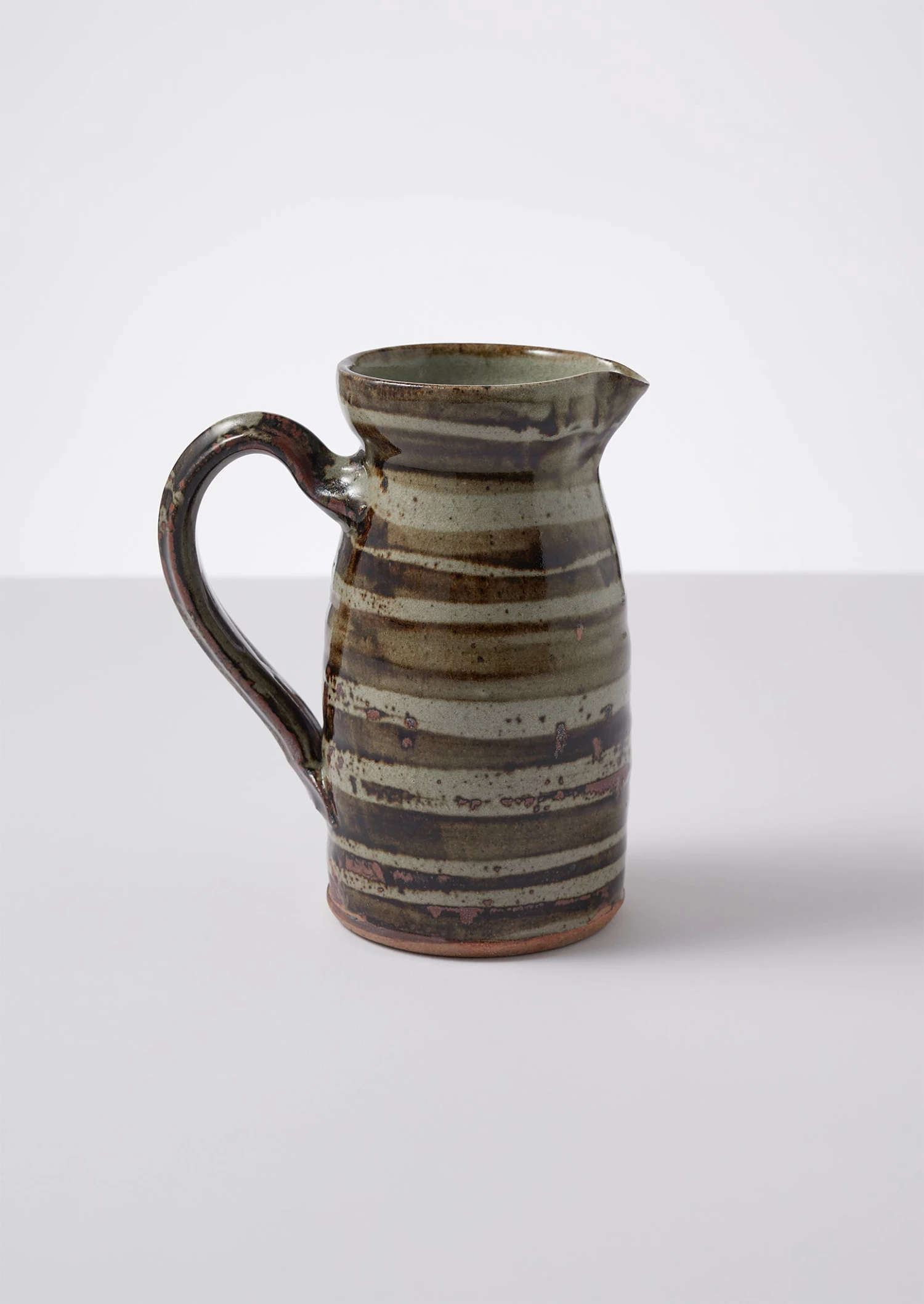Cardiff-based potter Jack Welbourne creates this jug in his studio, which is in a courtyard that is home to many makers. He studied pottery in Plymouth and has now been making pieces for 12 years. Hand-thrown from iron-bearing clay, with a celadon ash glaze accented by iron oxide stripes. Each varies slightly in shape, pattern and glaze tone.