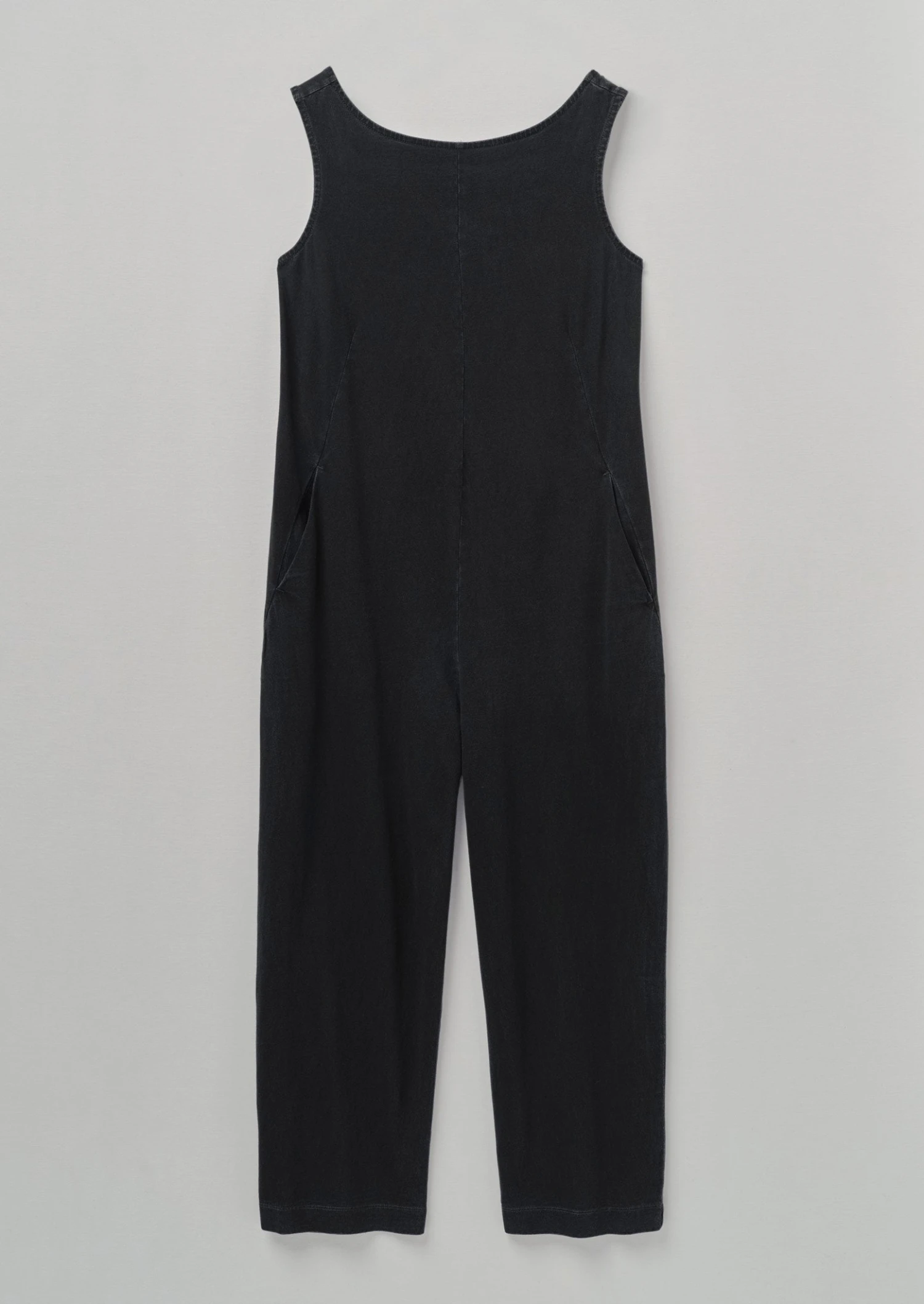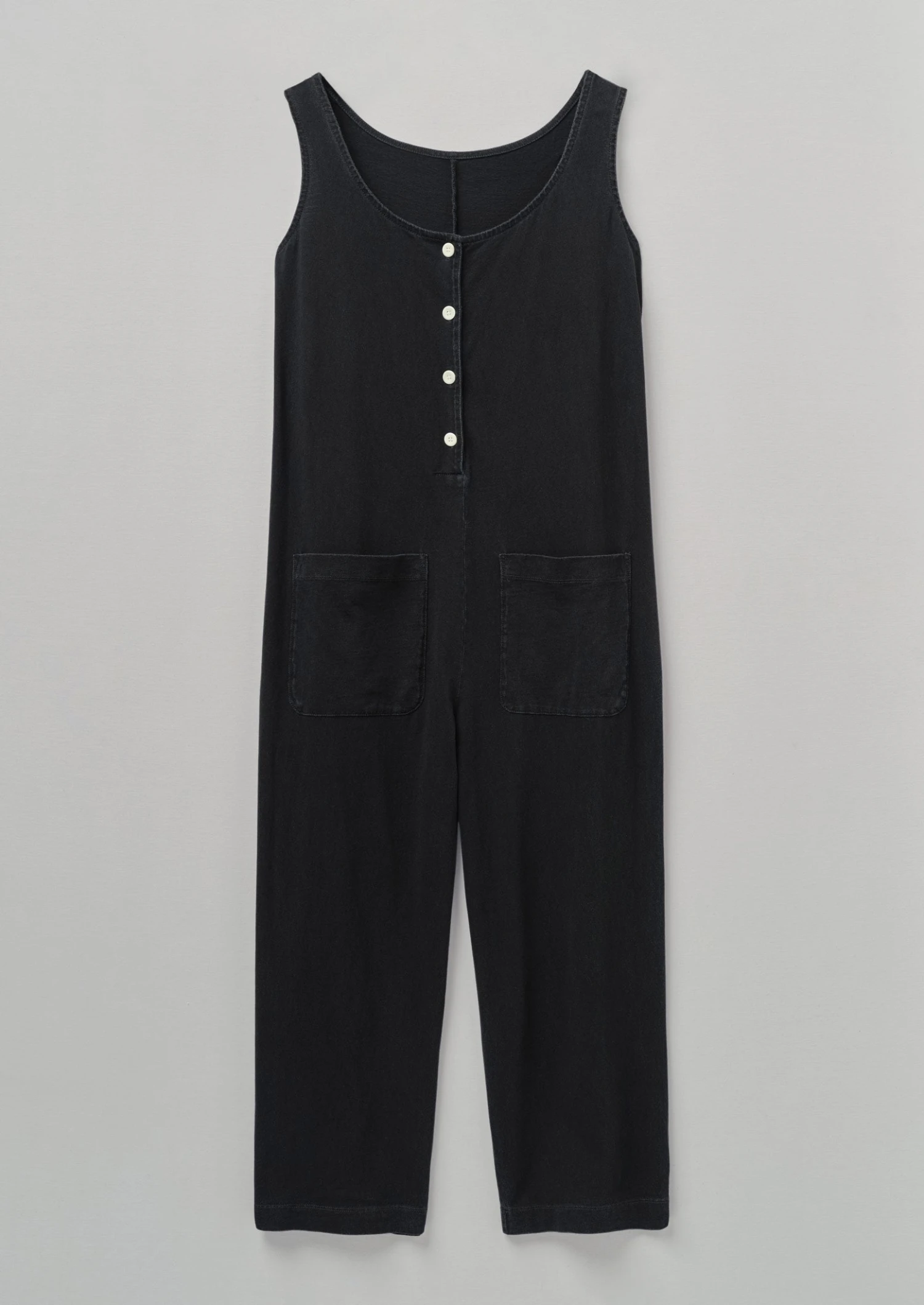 Compact cotton jersey. Boat neckline. Scoop back. Side pockets. Back patch pockets. Wide ankle-skimming legs. Back corozo buttons.