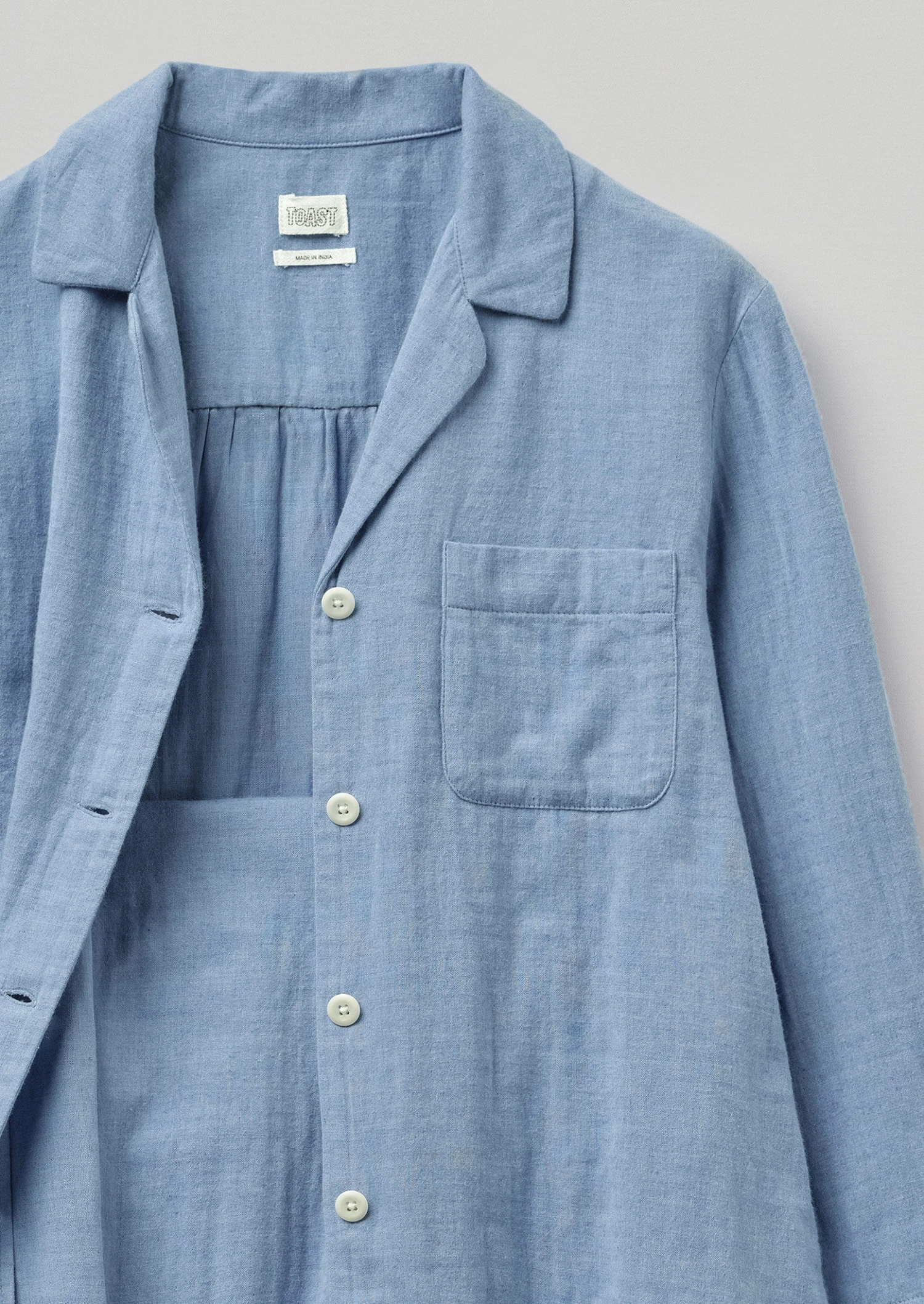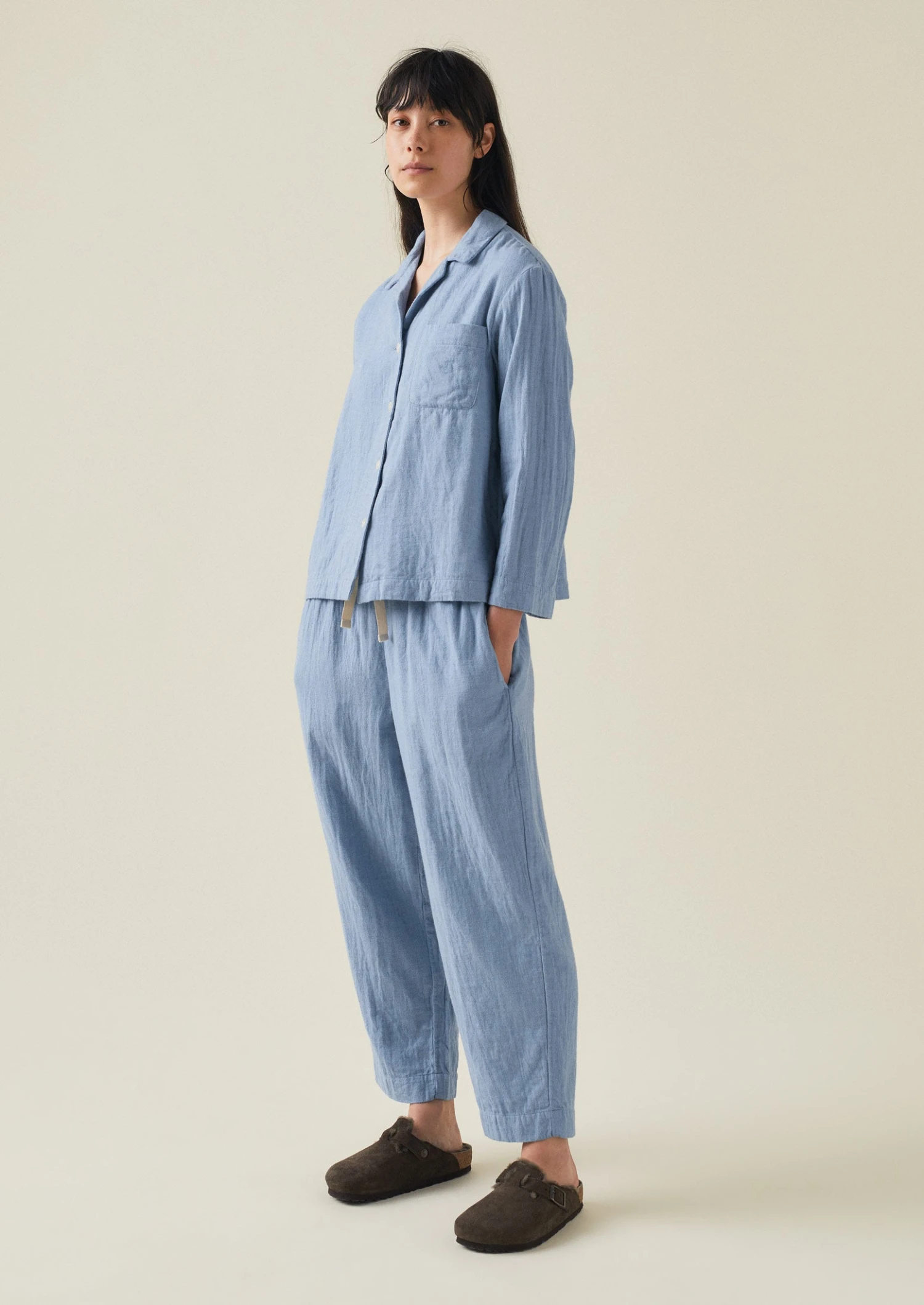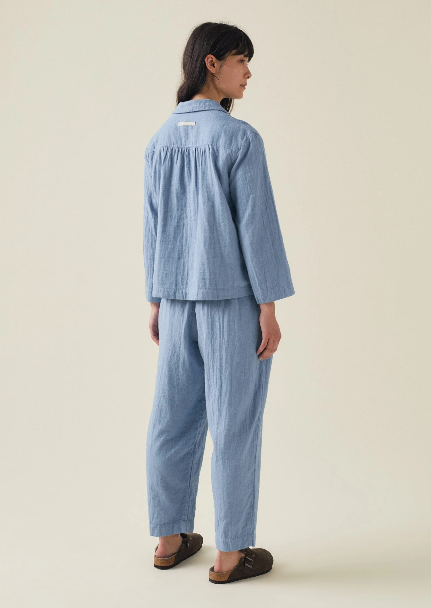 Soft double-faced cotton. Top: Back hanging loop. Back gathers. Chest patch pocket. Corozo buttons. Trousers: Elasticated drawstring waist. Side pockets.