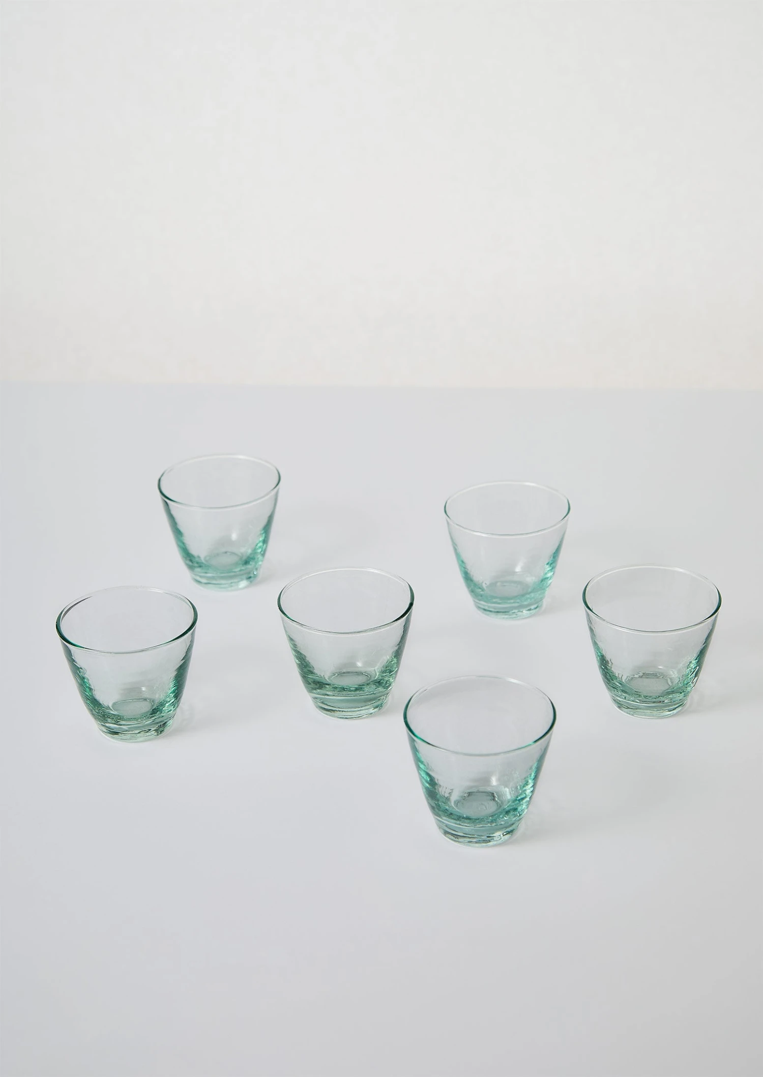 Set of six mini glasses hand-blown from recycled glass at the Beldi Country Club in Marrakesh. The group of 60 artisans are from the last glass factory in Morocco. They recycle two tons of glass a day, with any waste from the process melted down to be used again. Shaped to a small form with thick walls, slight warps, marks and air bubbles, which are traces of the artisanal process.