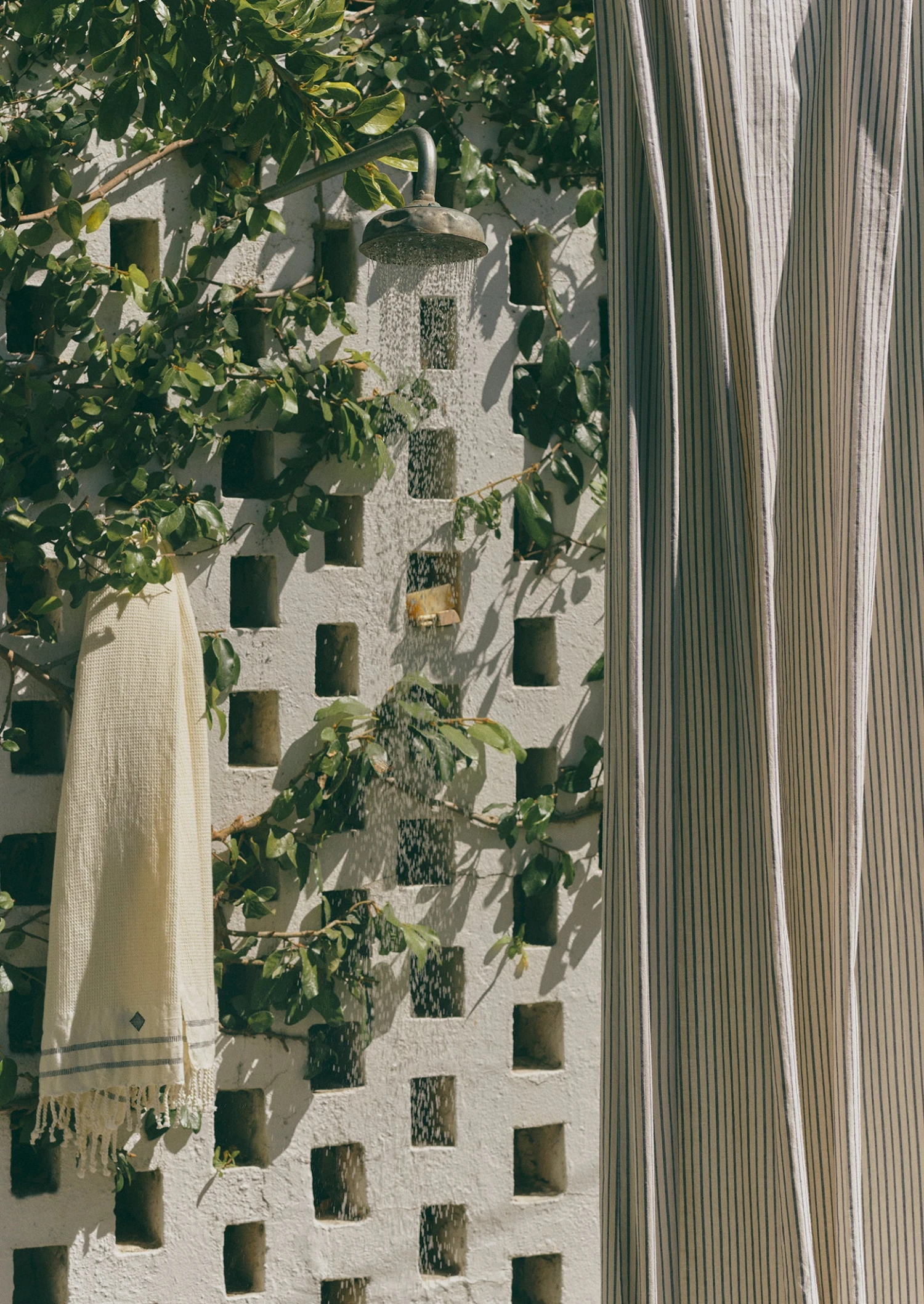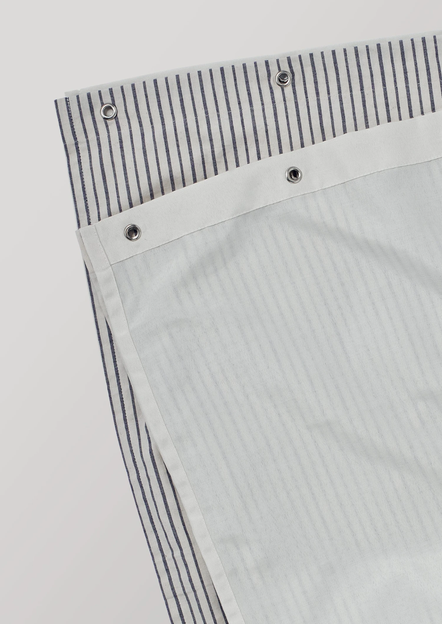 Double-layered shower curtain, with the outer made from pyjama stripe organic cotton and the waterproof inner made from recycled plastic bottles. With stainless steel eyelets and a coordinating bag for storage.