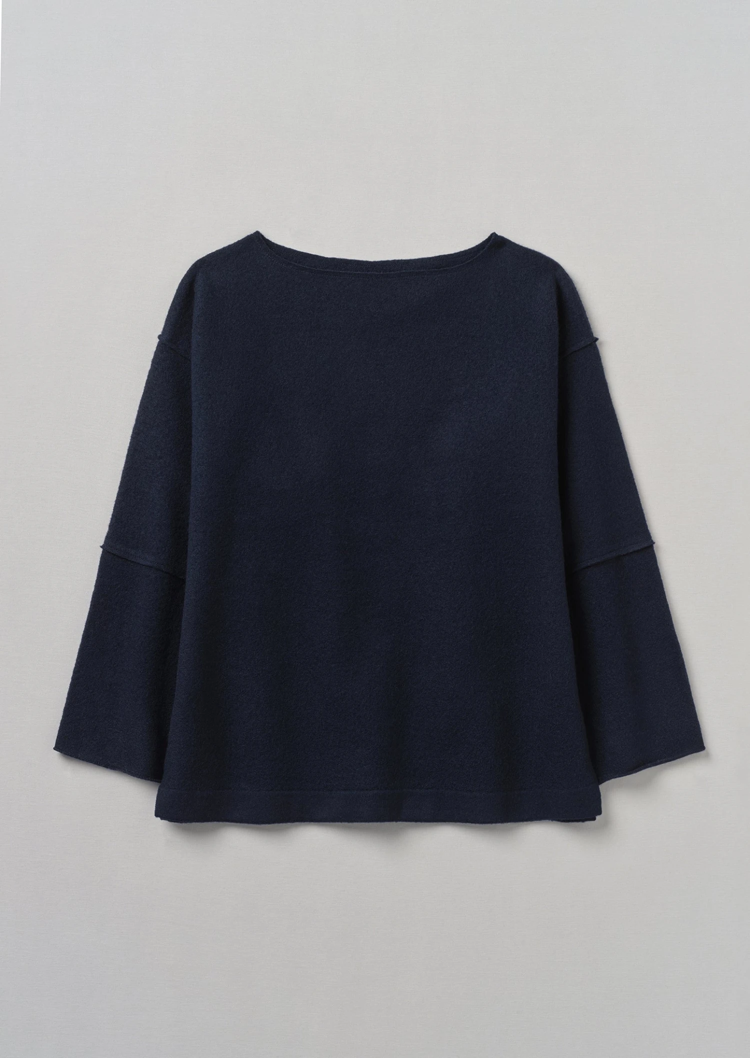 The wide dropped sleeves of our sweater are constructed from raw-edged panels. Crafted from soft boiled merino wool with a high wide neckline and side hem slits, then finished with a hanging loop at the nape of the neck.