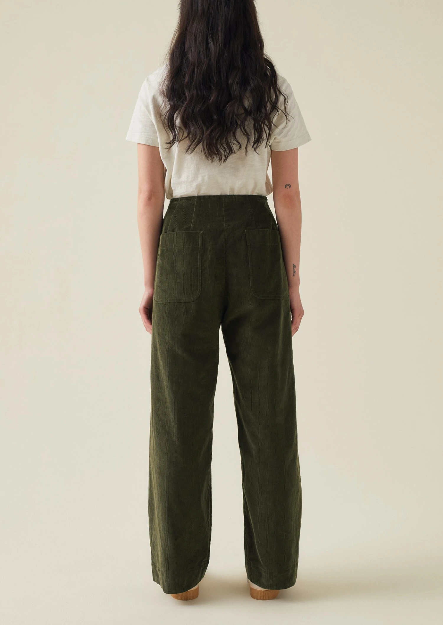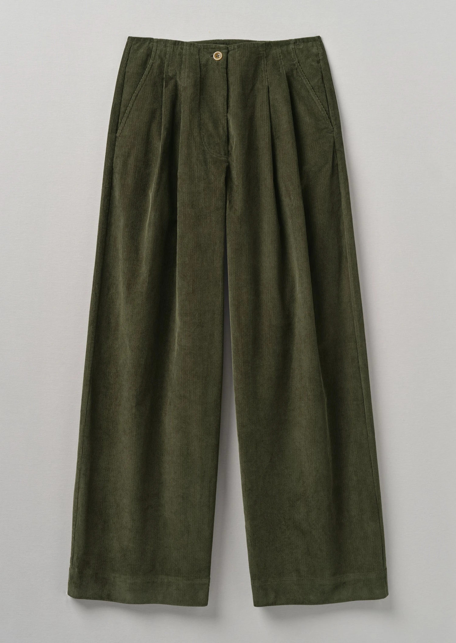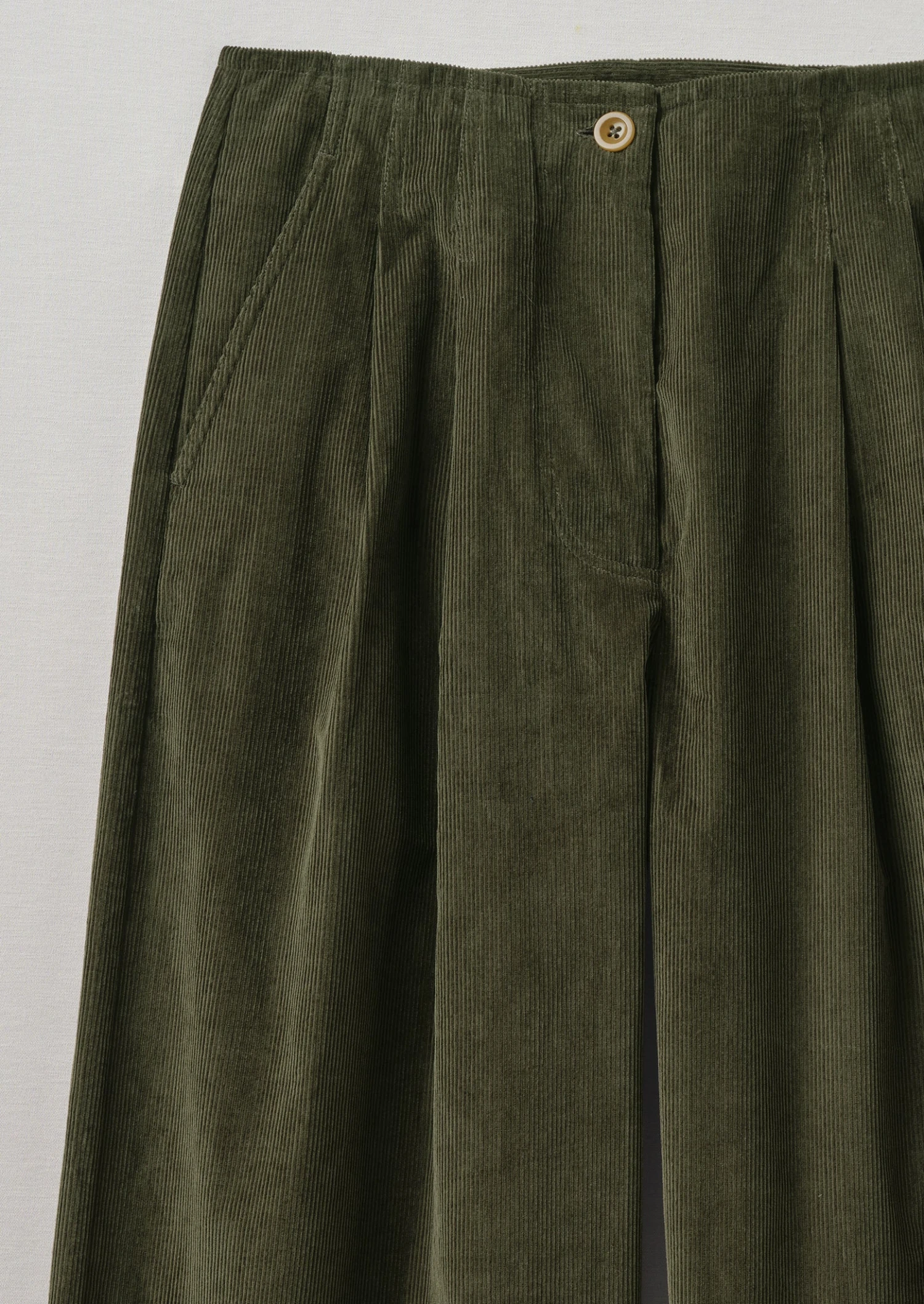 Organic cotton cord. Double reverse-facing pleats. Side pockets. Back patch pockets. Zip and corozo button.