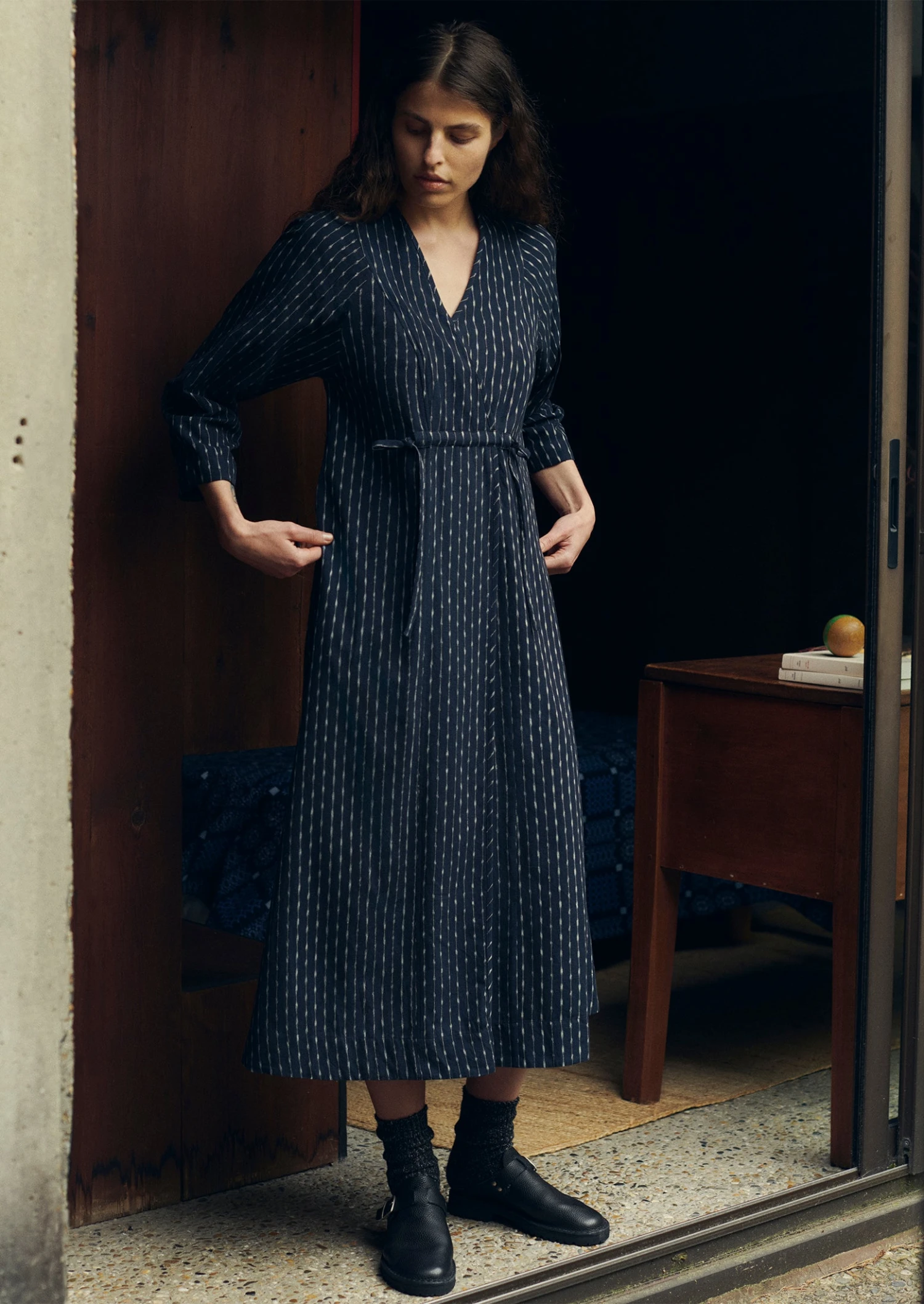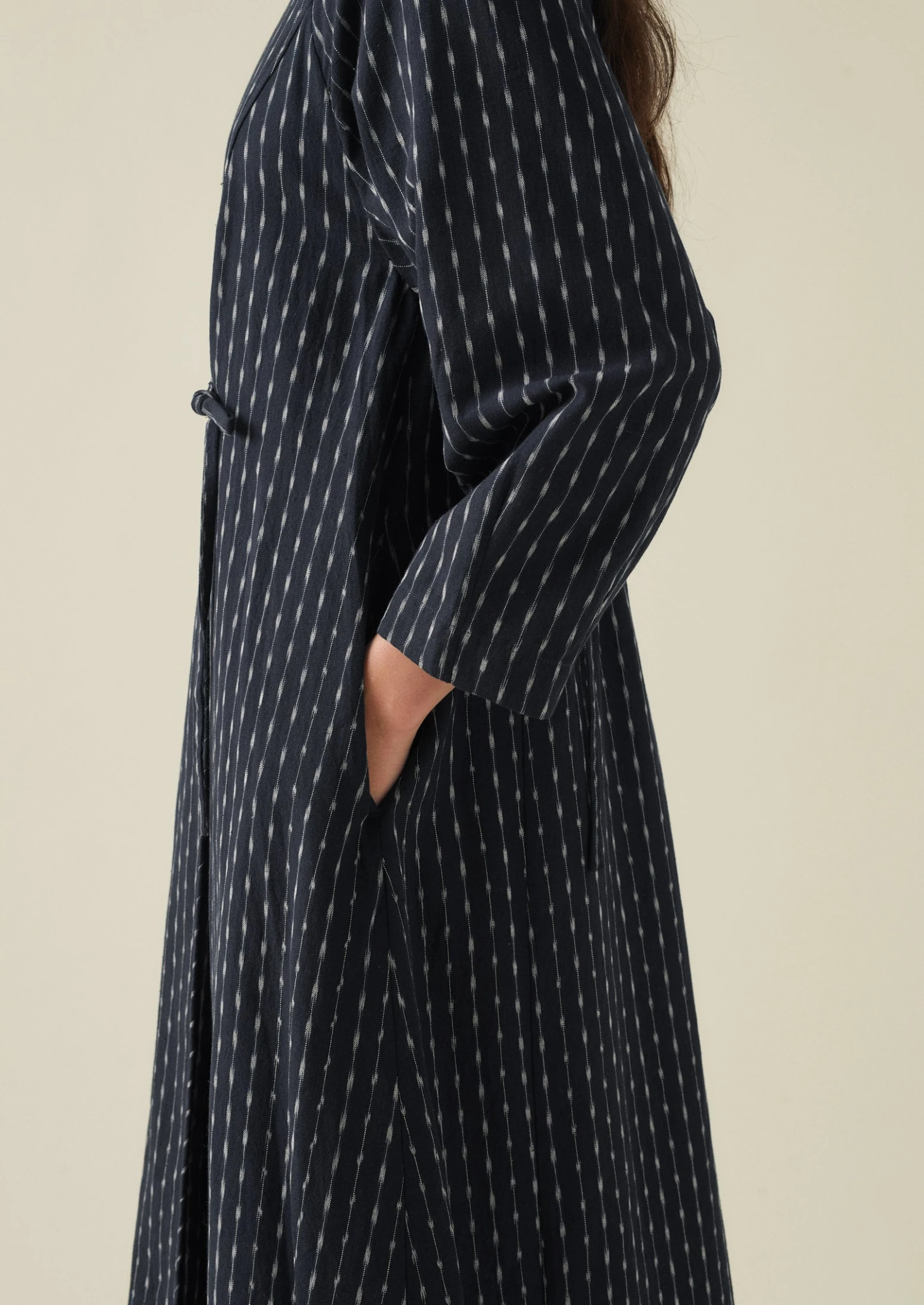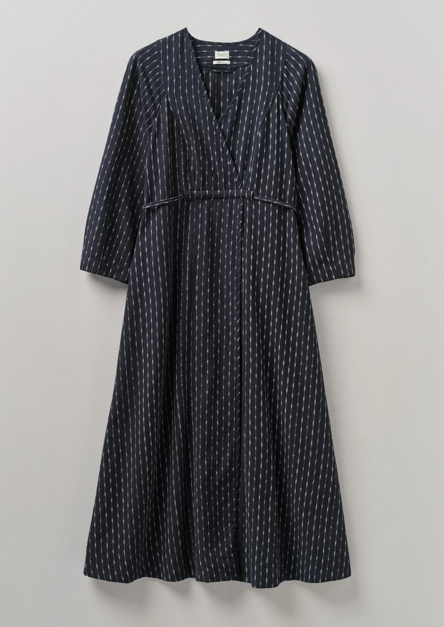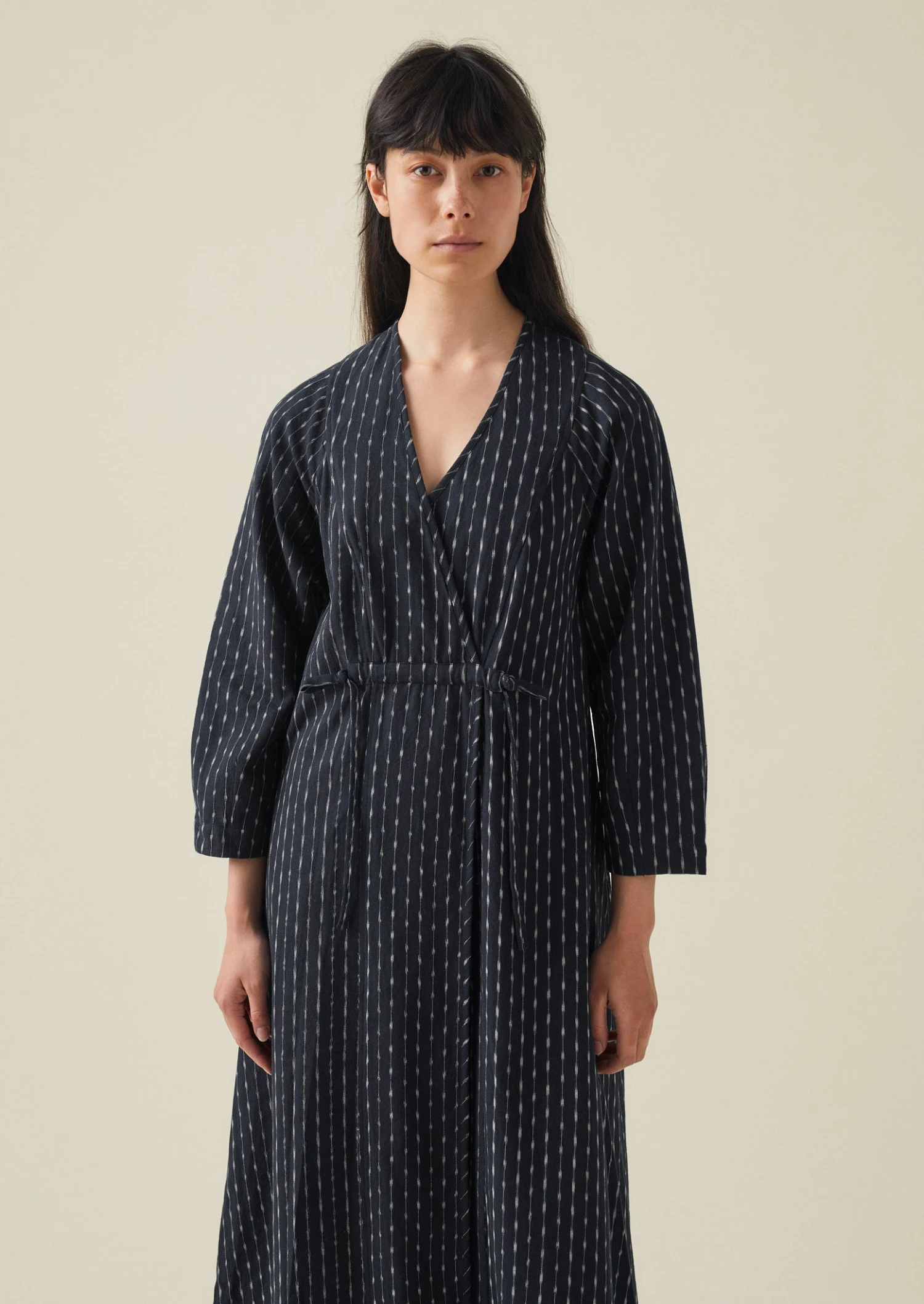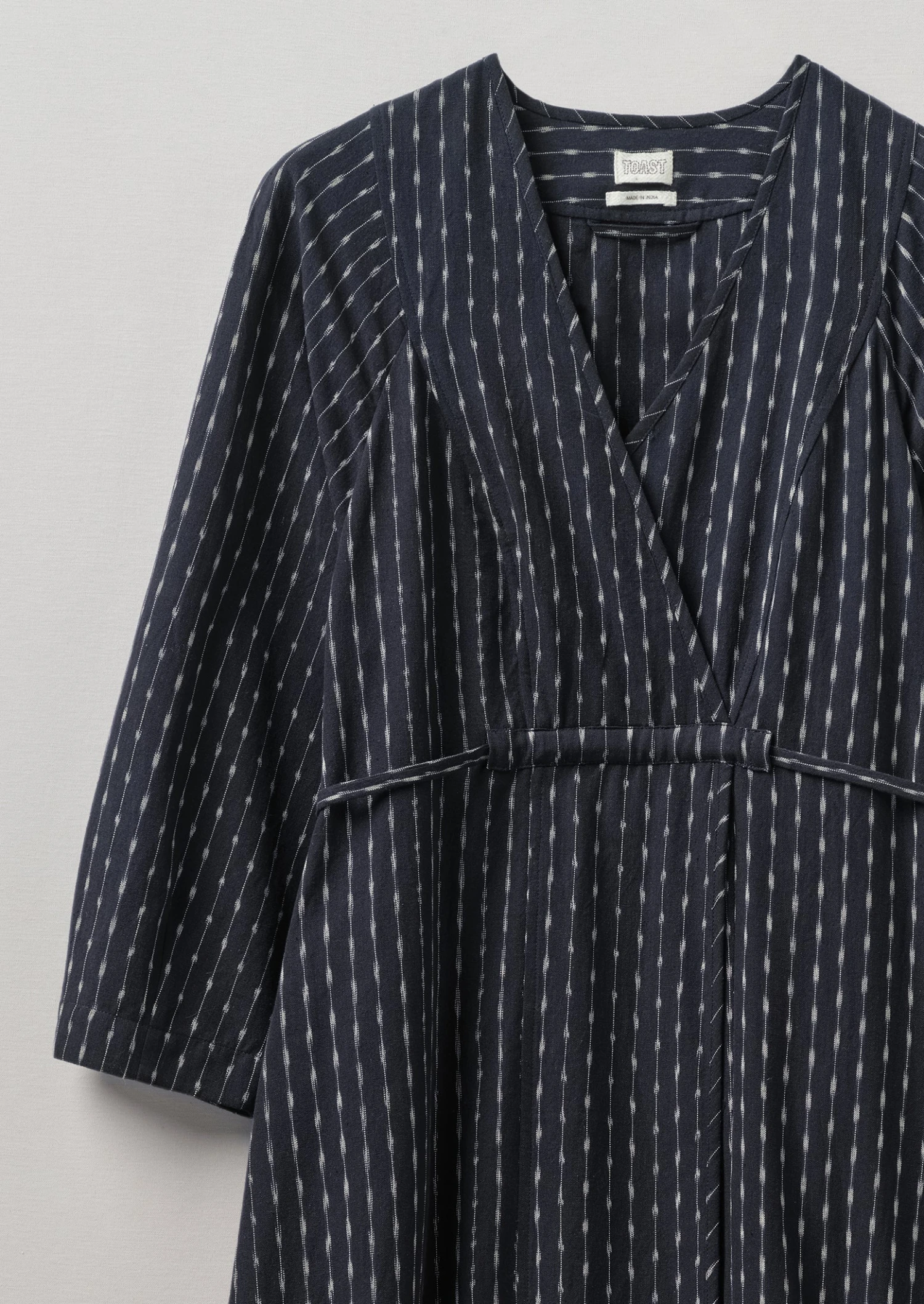 Polka-dot and stripe cotton ikat. Hand-dyed. Handwoven. Crossover neckline. Slender front and back waist ties. Side seam pockets. Internal hanging loop.