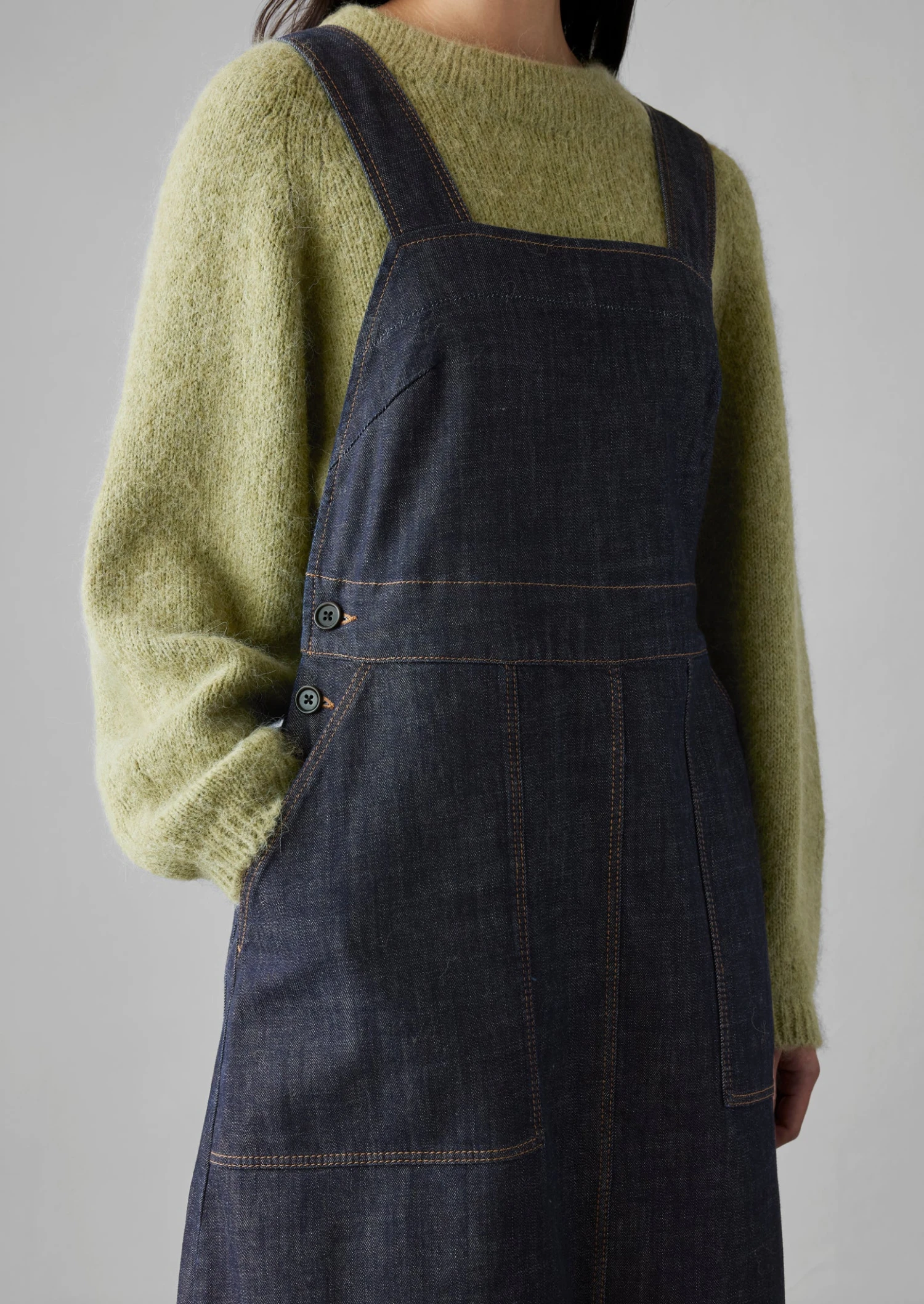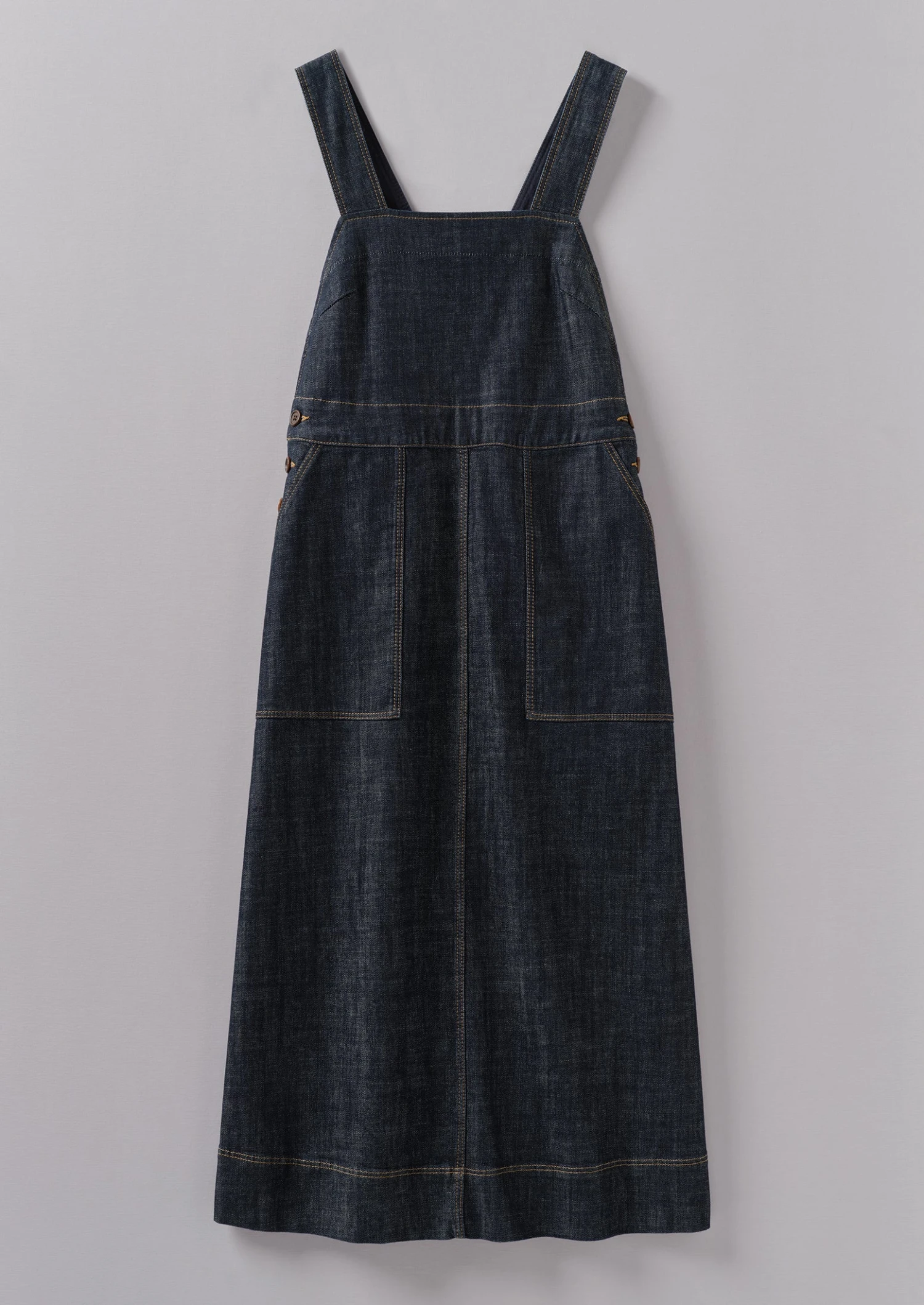 Organic cotton denim. Topstitching. Square neck. Pinafore back. Centre-front and centre-back seams. Side patch pockets. Back patch pockets. Side corozo buttons.