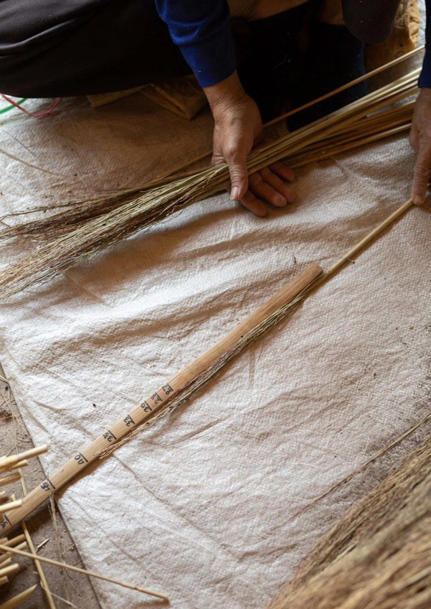 Broom handcrafted in Thailand by artisans from sorghum grass which is long-lasting and pollen-free. Many of the makers have been working with the company since it was founded over thirty years ago. With a striped pattern and long wooden handle.