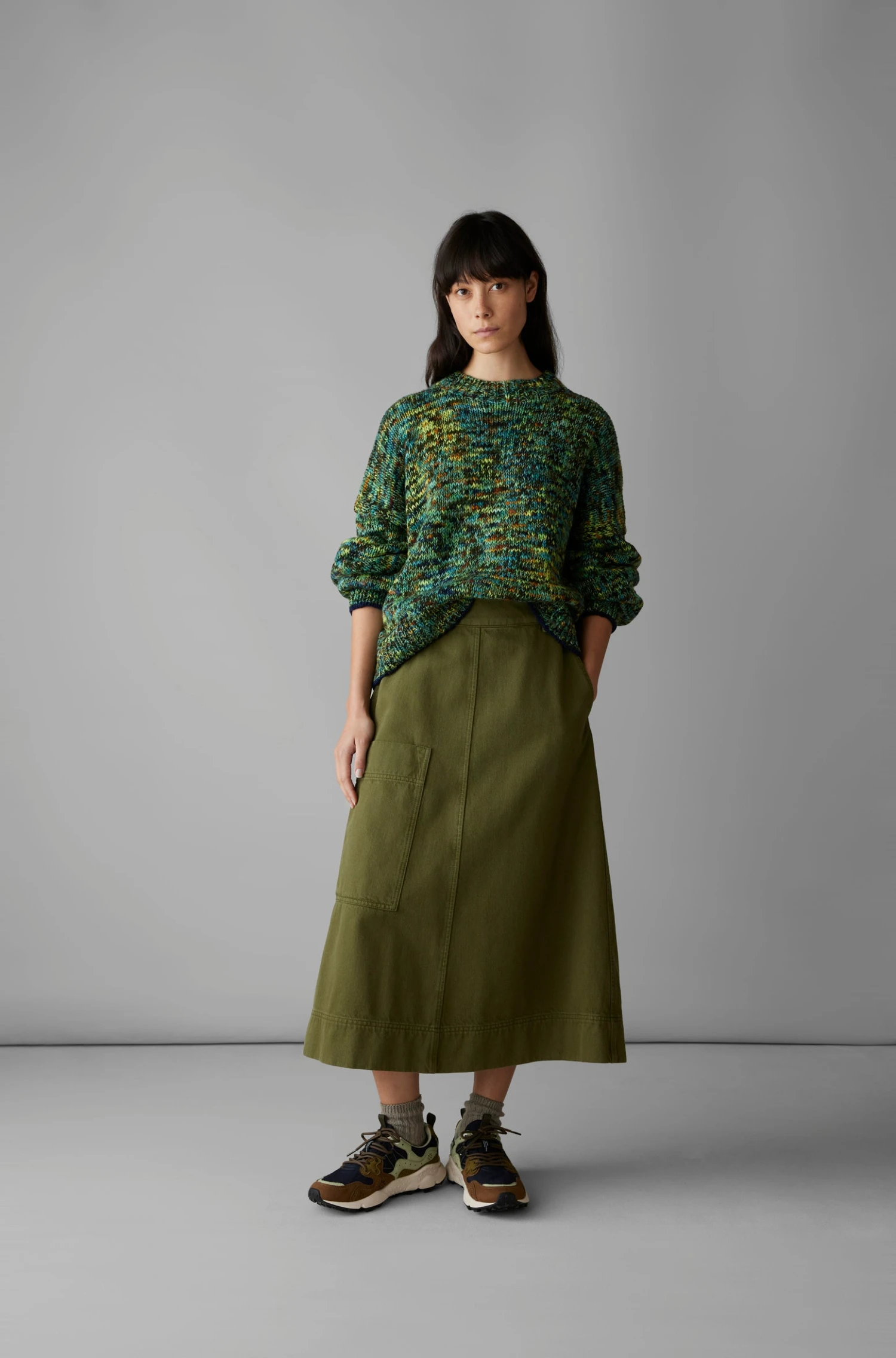 Hand-loomed wool. Space-dyed yarn. Set-back shoulders. Dropped sleeves. Integral ribbed edges.