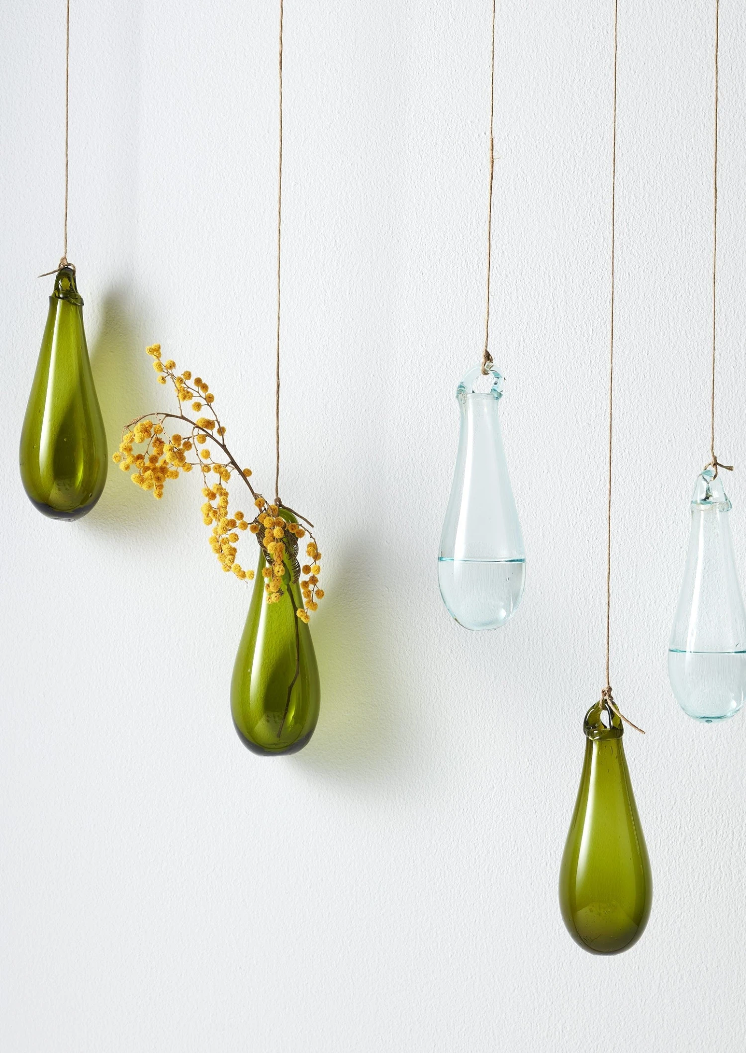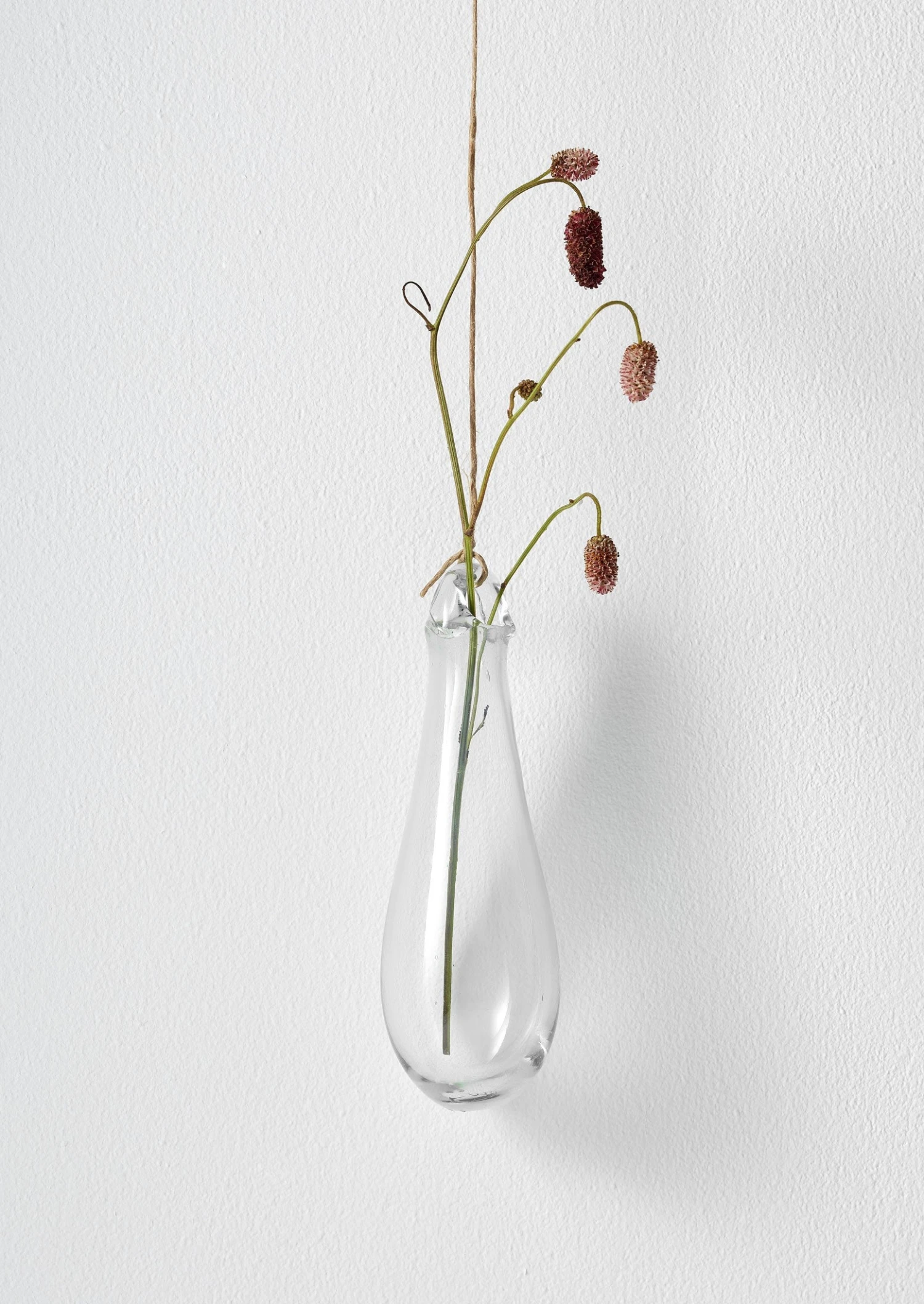 Traditional, hand blown glass vase in an elongated teardrop shape. For a single stem or dried flowers, with a loop to hang. Each hanging vase has been made from recycled glass, hand blown by Syrian master glass blowers – an ancient and ancestral skill that has been passed down through many generations. Slight warps, marks and air bubbles make each piece unique.