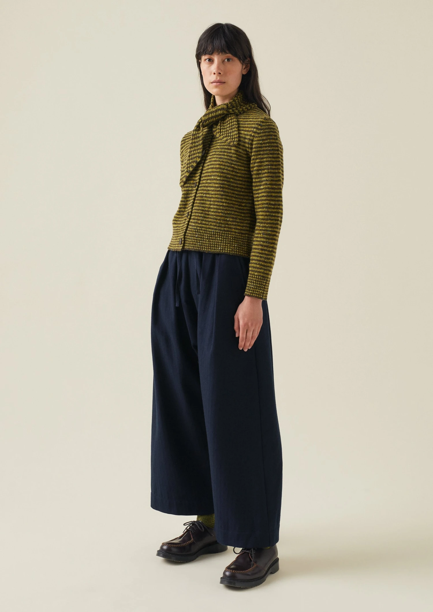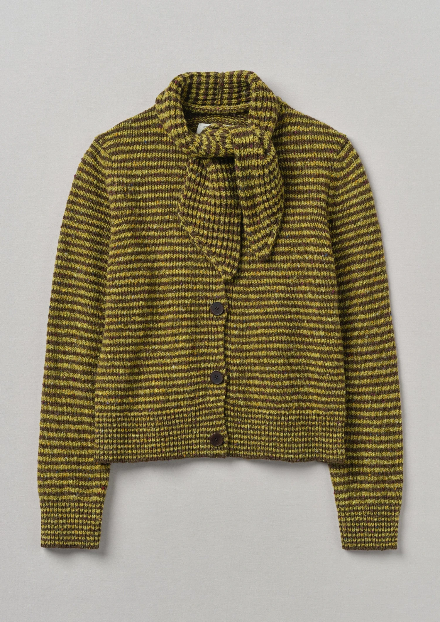 The wide ties at the neck of our striped cardigan can be fastened or left loose for unstudied styling. Knitted from flecked merino wool spun in Donegal, Ireland, with set-back shoulders and full-length sleeves.