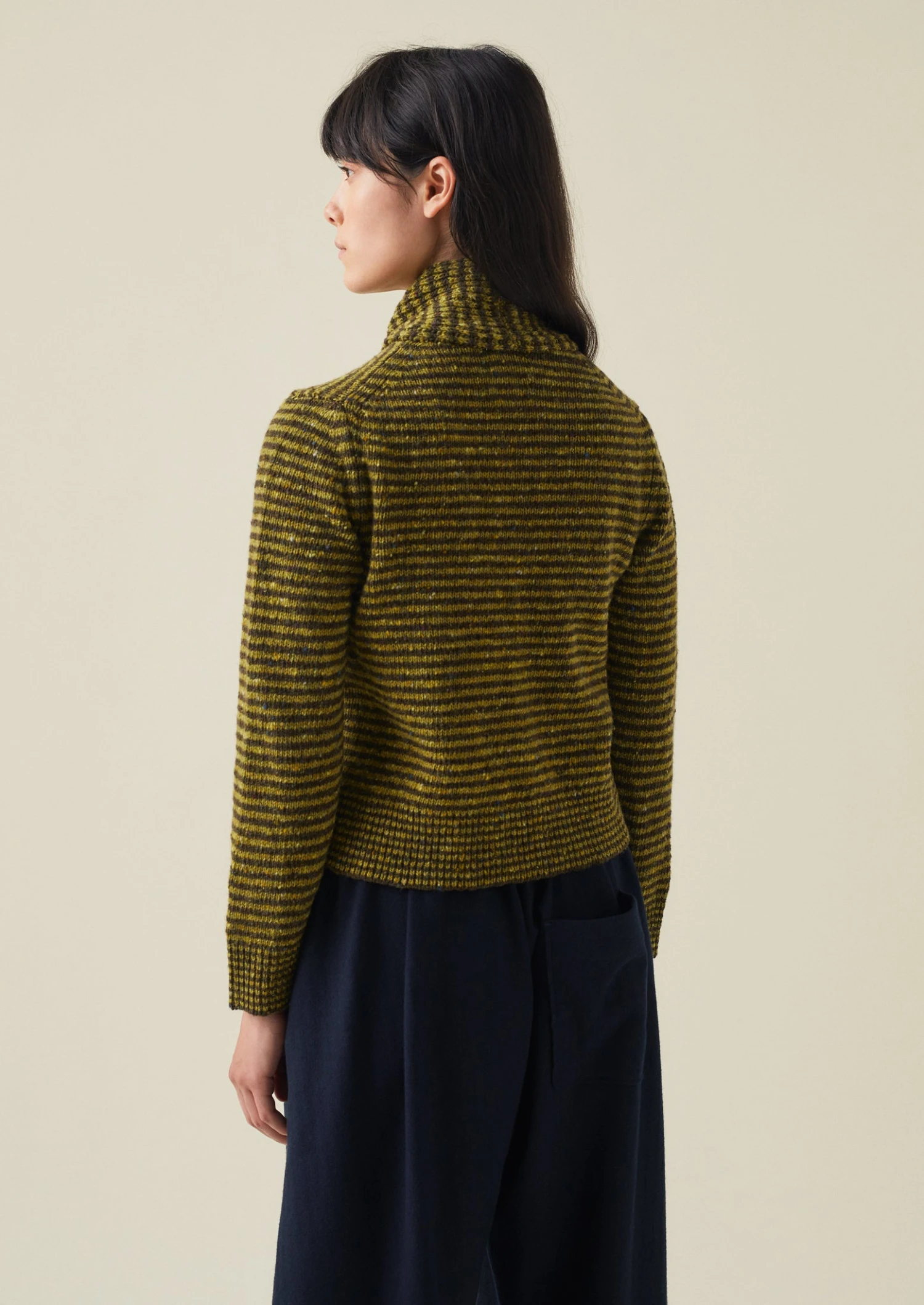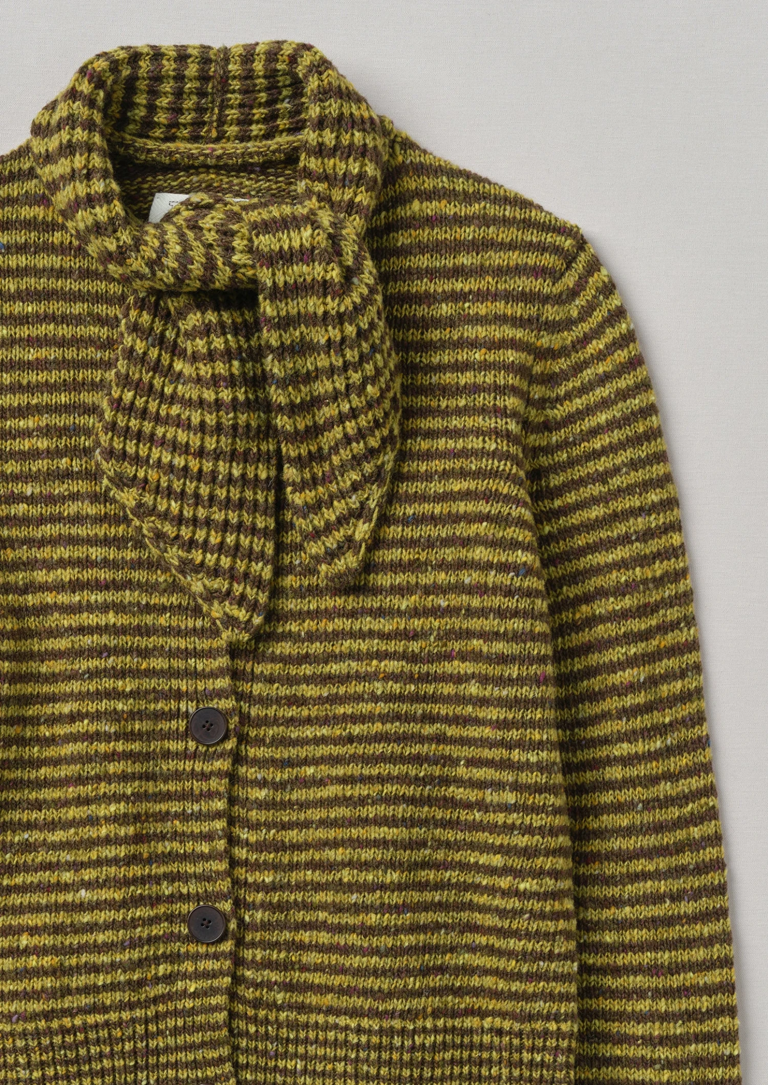 Flecked Donegal-spun merino wool. Striped pattern. Neck ties. Set-back shoulders. Full-length sleeves. Integral ribbed cuffs and hem. Mid-hip length. Corozo buttons.