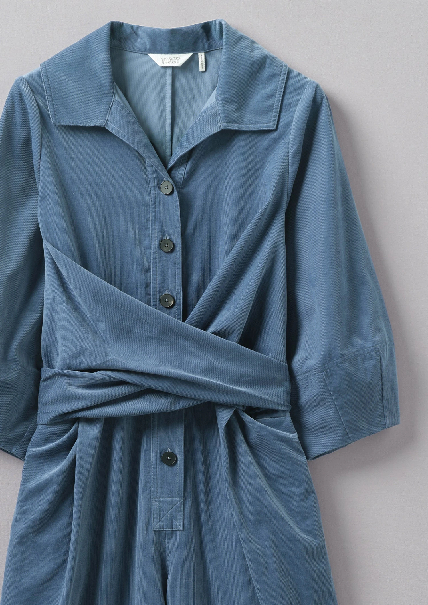 Organic cotton needlecord. Collar. Three-quarter-length sleeves. Wide waist ties. Side pockets. Wide ankle-skimming legs. Corozo buttons.